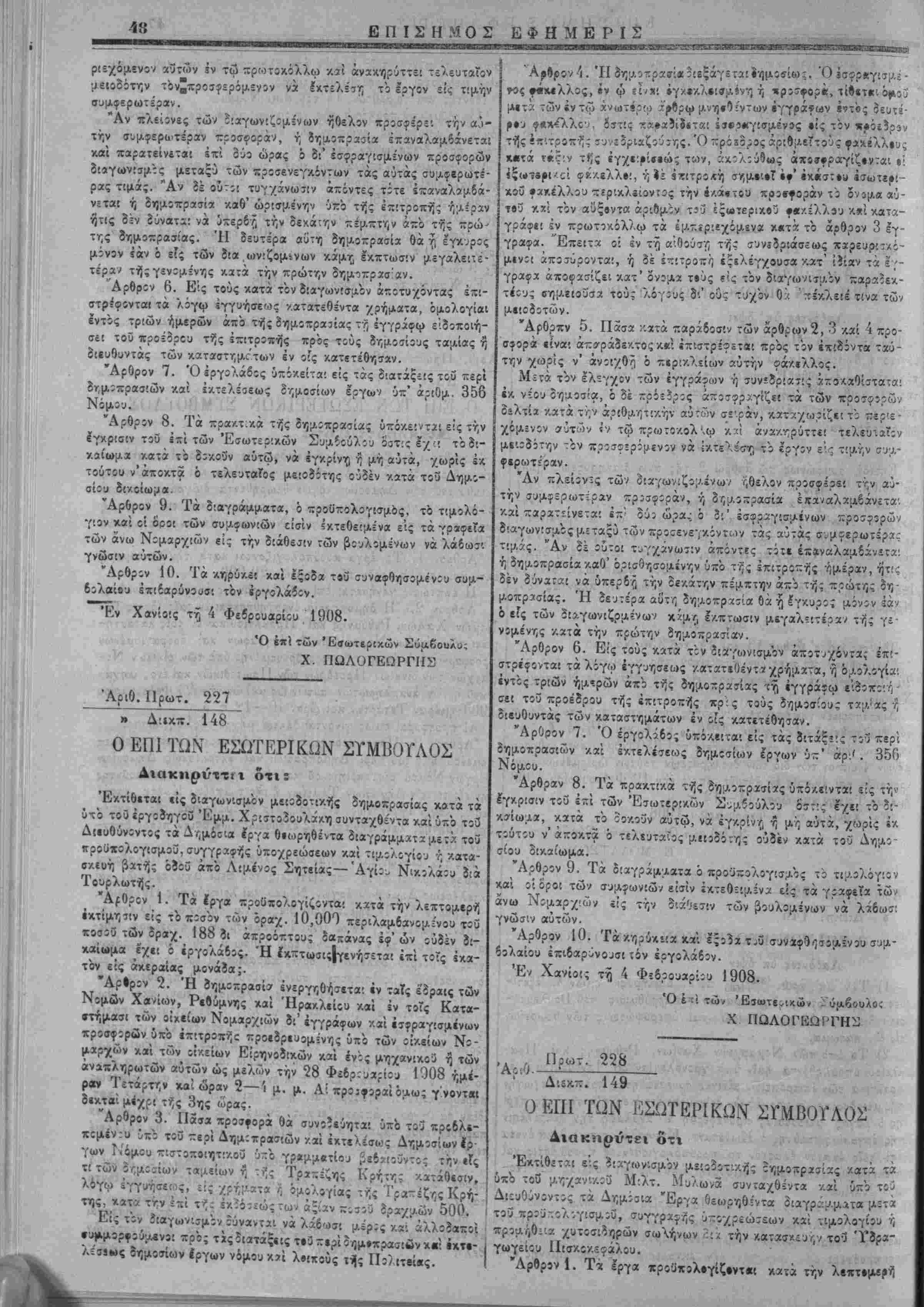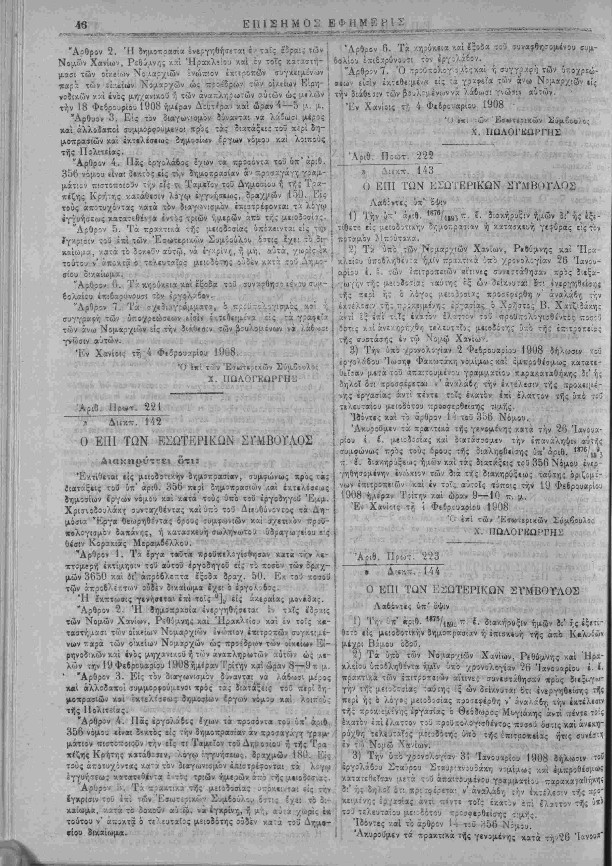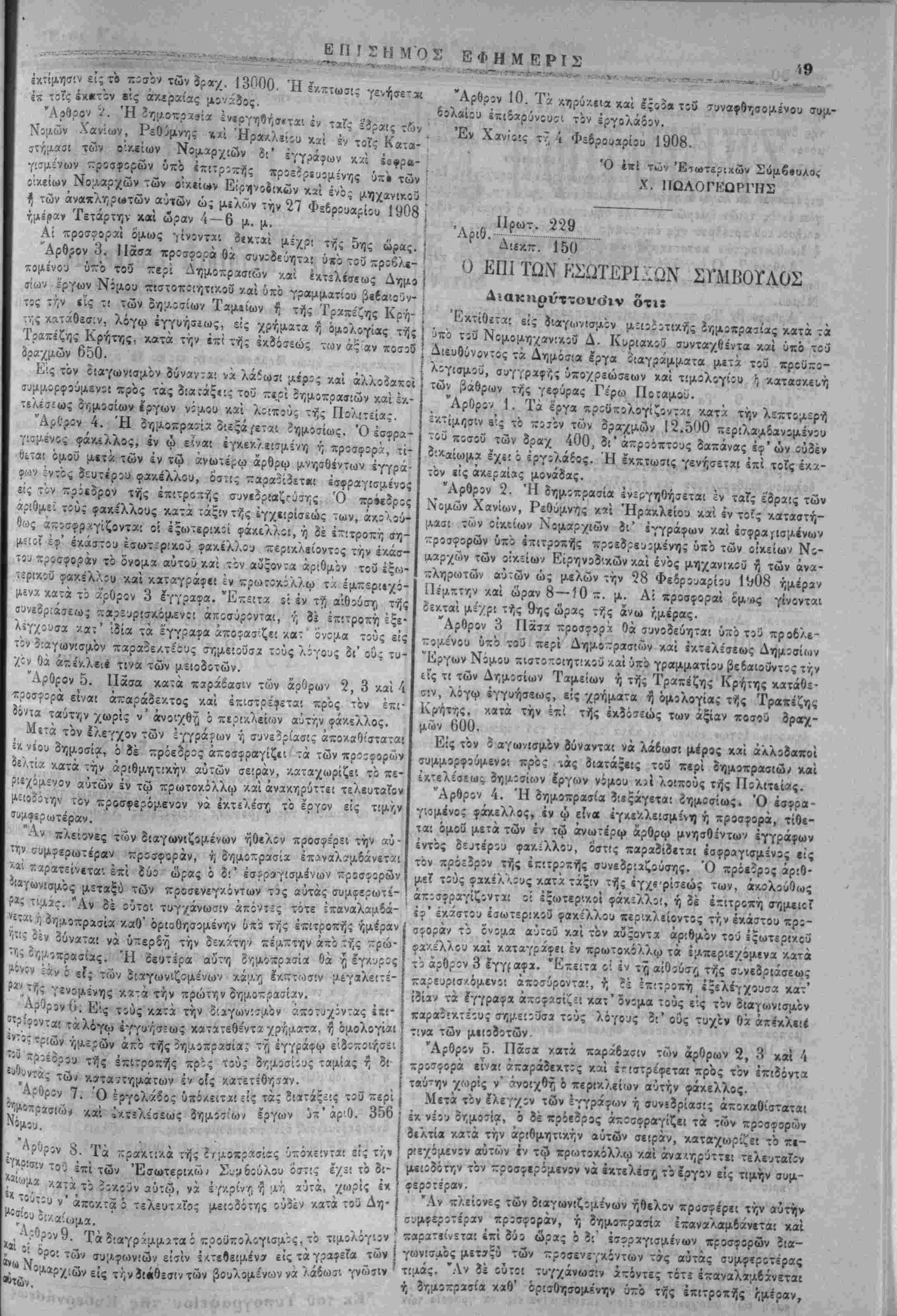τίθενται, καθ1 6σ5ν »<ίίρχ τάς εςα/.;σιας ταύτας στολάς, ζαι?' αί εργασίαι αί όριζάμεναί ίν ιη ίν λίγω ϊιακηρΰςε! 3ίά τό Ο'ν- νομικόν Συμβούλιον. Έ» Χανίοις τ? 4 Φεδρουϊρΐίυ 1908. Ο επί των 'ϋιτωτερι/.ώ Χ. ΓΙΩΛΟΙΈΩΙ'ΓΉΣ "ΑΡ·0. Ποωτ. 285 ~» λΐί-Λ-. 181 ΔΙΑΚΗΡΪΞΙΣ Έπαναληπτ'.κής τελ*!ωτ:κής ττλΐ!οϊ»σίας 3ιά την ΐκμίσθωα τ;3 φόρου των συγκομιζομενων χειμερίνων τροϊόντων τής έφετβ! νής ουγκίμιδτ]ς τής αγρότας περιφερείας Χανίων. Λαδόντες ύιτ' όψιν την υπο χρονο,λίγίαν 30 Ίανουαρίου 190 δήλωσιν τοΰ Ιω. Ν. Πρωϊαάκη «μπρςθέσμως κατατεθΐΤίΐν δι' ,·;ς δηλοί ό'τ; προσφερει 5 °/0 επί πλέον τής ύχο τοΰ τελευ ταίου ΐ5/.6ΐϊδίτοο Άντ Κ. Παυλάλη προσενεχθείσ^ς είς δραχ μας 6,020 τελευ-αίας προυφιρας διά την Γ/.μίσθωσιν τοΰ <ρ:ρο των συγκομίζΐμένων χειμίρινών τής 5φ*τ«ινής συγκ'μίδής τη «γροτιχής περιφβρεϊας Χανίων. Ίϊόντες κϊί τό άρθρον 14 τοϋ ΐιπ' αριθ. 356 Νίμου. Διατάσσομεν την ?'εξ»γήν ίπαναληπτικής τελεωτικής πλε'.ο δοσίας διά την έ/.μίσθωσιν τοϋ έν λόγω φόρο,ι, ένεργηθησο;" νη; την 10 Φεδρ:υα?ίου 1908 ημέραν Κυριακήν /αί ώραν 10 '/ί~ 11 */ι π· μ·- έν τω «νταΰθα Νομαρχια-Λω Καταστήματι καί ένώ πιον Έπΐτροπής αποτελούμενης έν. τοΰ Νομάρχου Χανίων, ώ· Προέίρου, τοΰΕΐρηνοίίκουκα'ιτοϋ Δήμαρχον Χανίων ώς μελών ή τώ; νομίμων αυτών άναπληρωτών καί συμφώνως πρός τ«ΰί έν ττ] ύχ' αριθ. α/νι έ. ϊ. δ'.οκηρύξε! ημών καί τη υπό χρί"- λογίαν 5 Ίανο,ιαρίίυ 1908 σχίτι-Α-7, σογγραφί, υποχρεώσεων αναγραφομίνους ορους καί συμφωνίαις. Έν Χανίοις τ?, 1 Φεδρουαρίου 1908 Ό Δημβρχεΰων Πάρεϊρο Ε. ΜΟΥΝΤΛΚΗΣ •Εκ τοβ Τνπογ^α^είον -ϊ