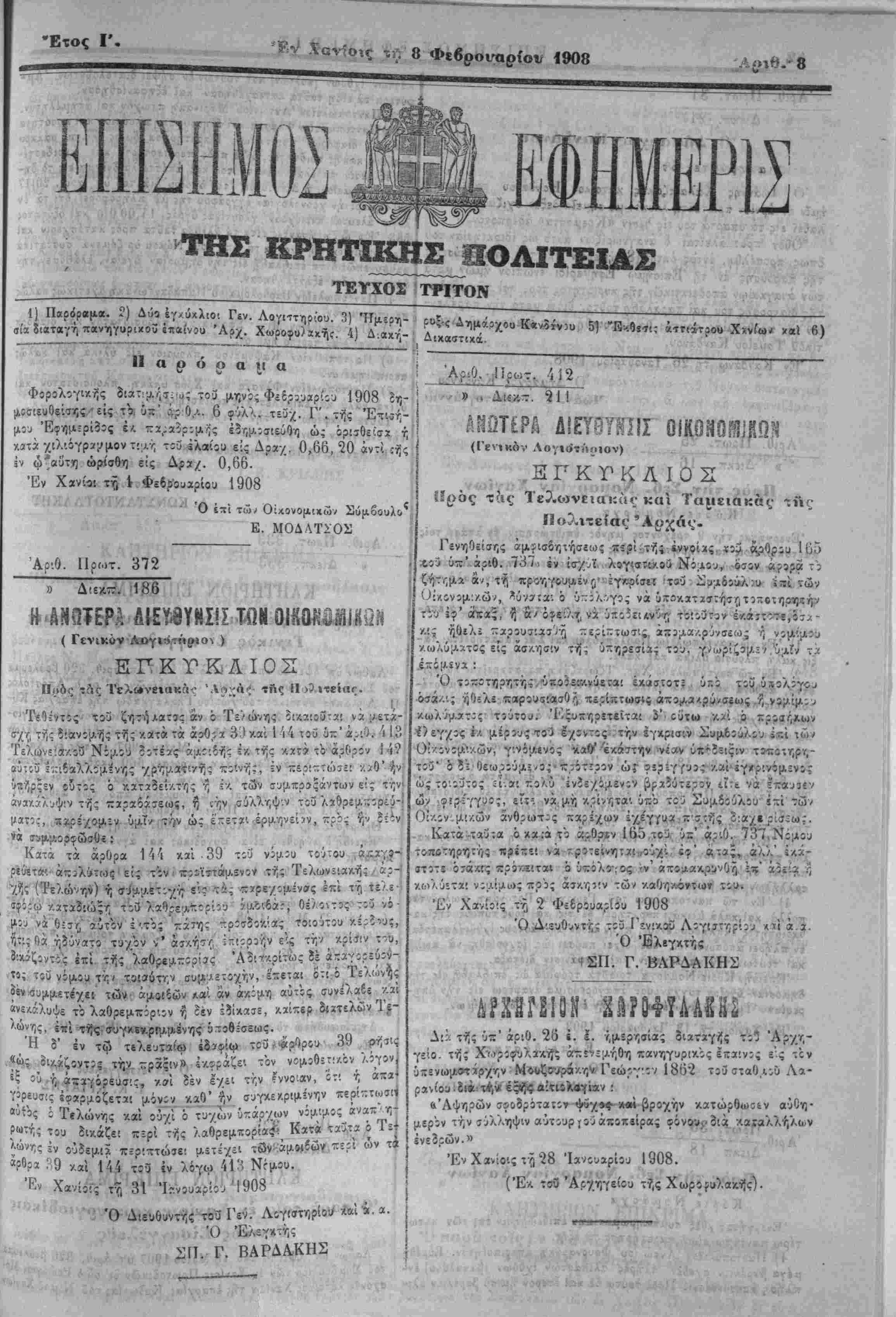 'Κν Χανίοις -.γ- 8 Φεβροι/αρίον 1908