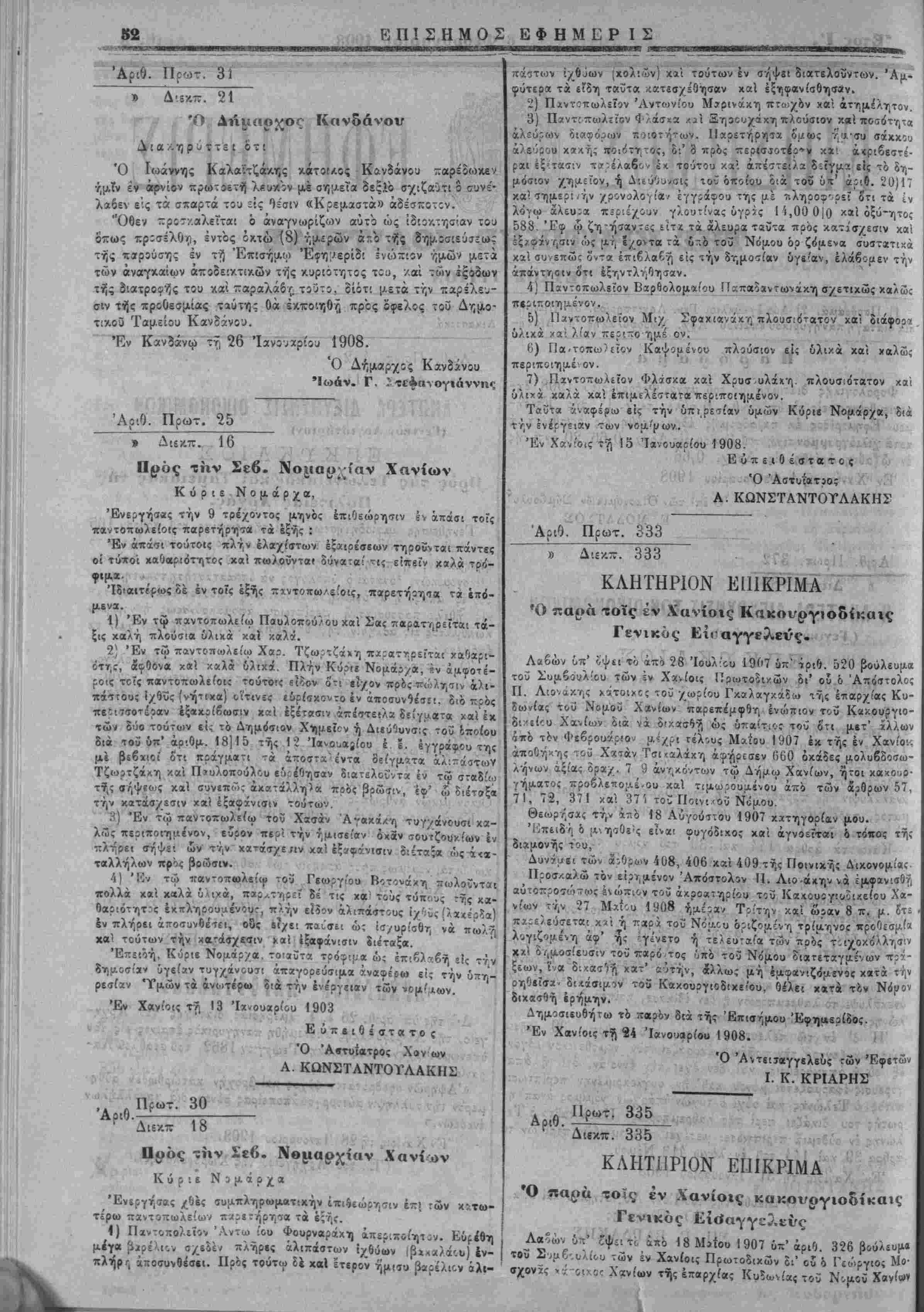 σιευθήτιοείς την έν ΧανιΌςς έχδιδομένην Επίσημον Έφημιρίδ* τή;