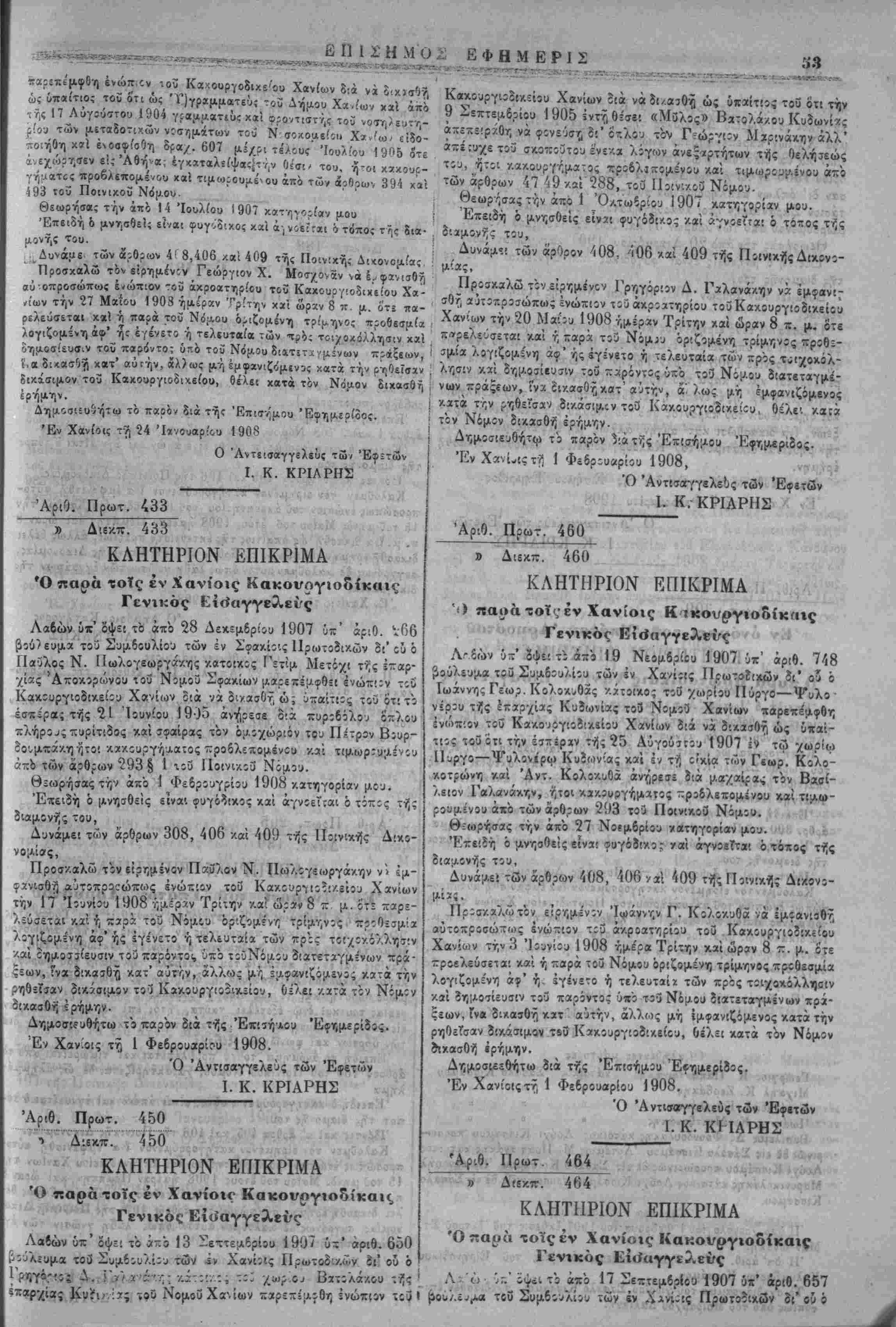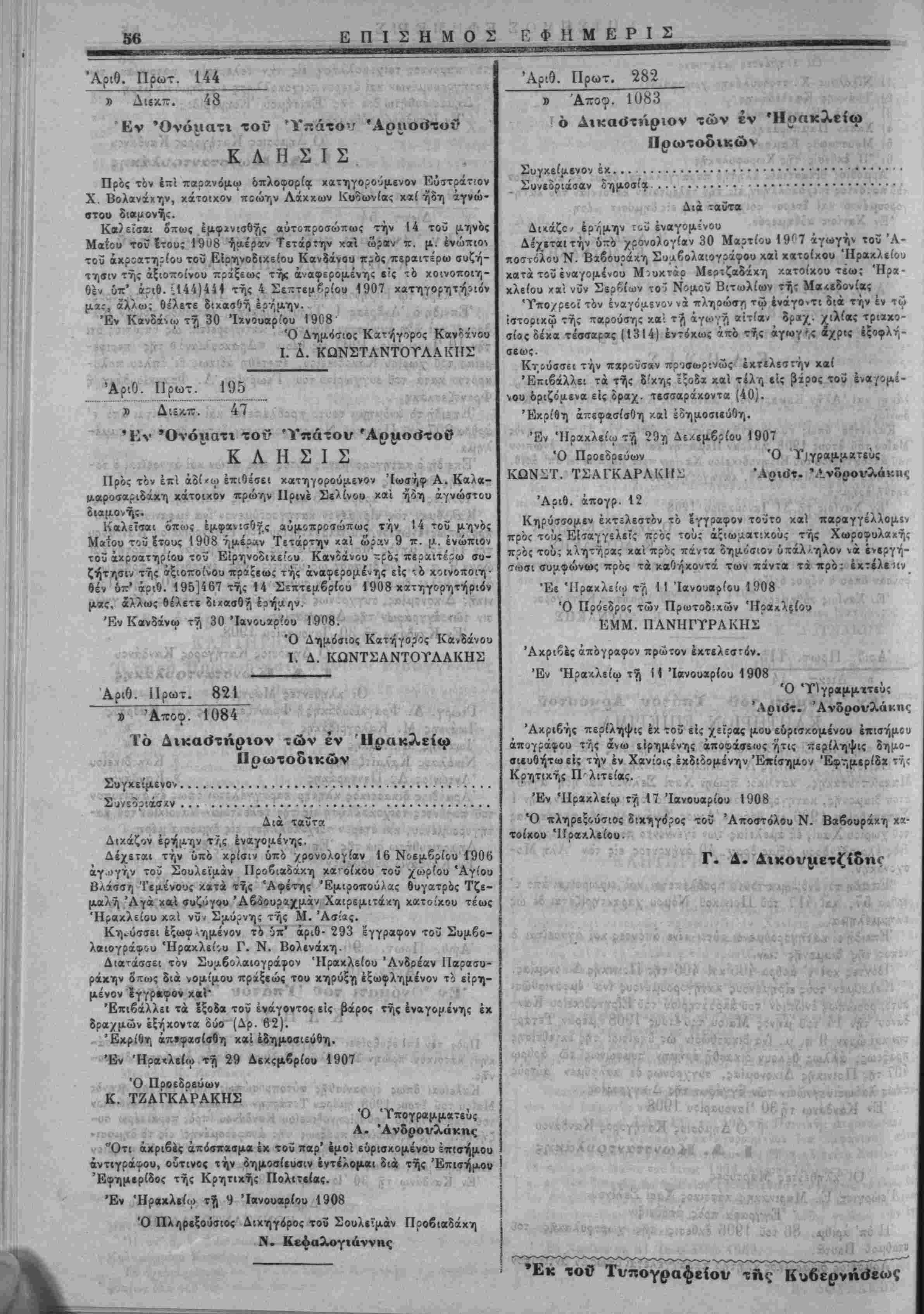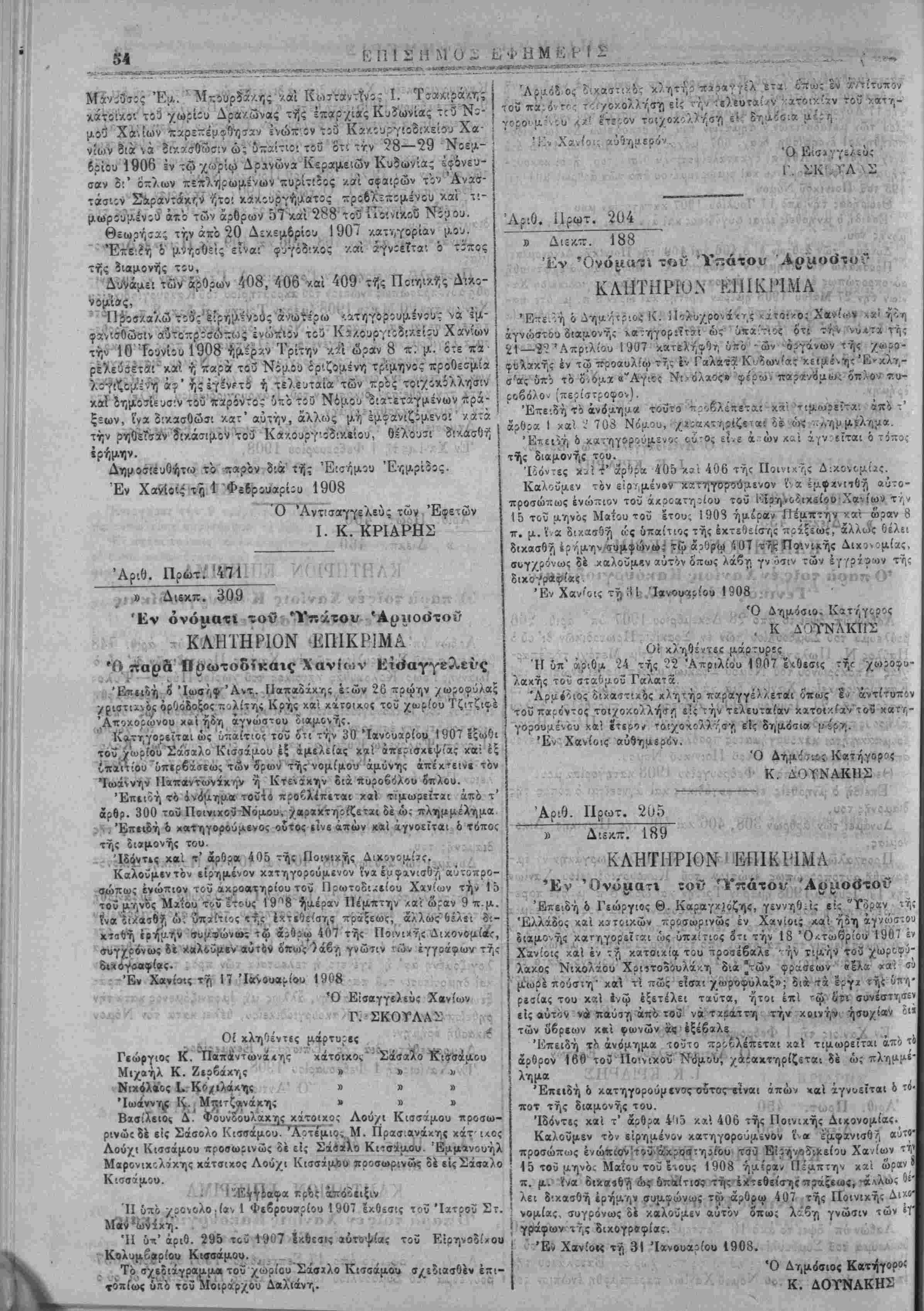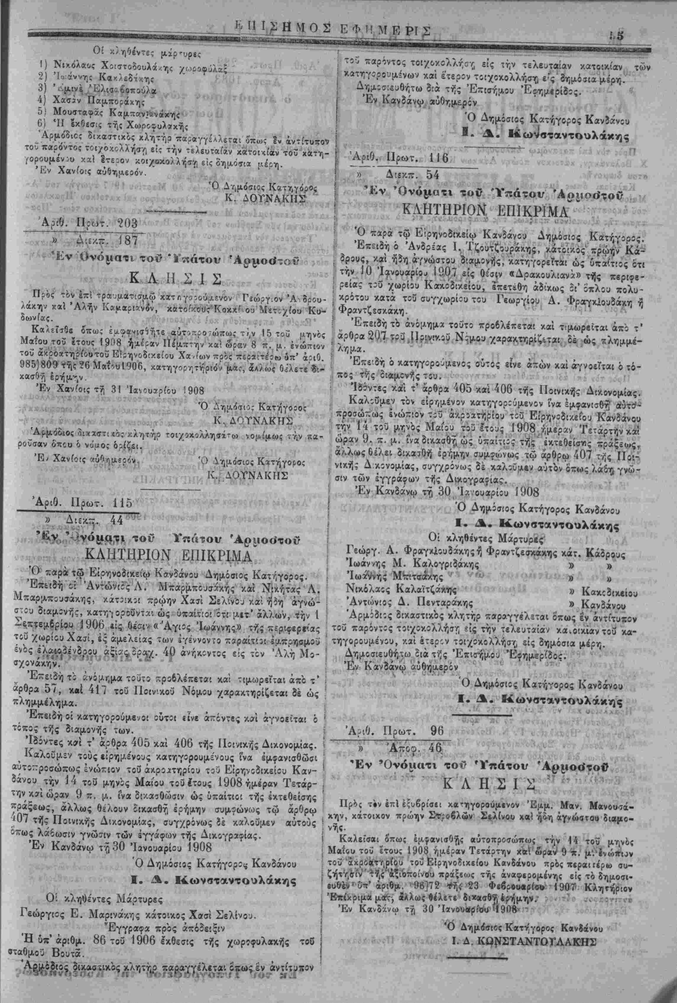 Ό Δημ<)Ίΐος Κατήγιρος Κανίίνου Ι. Δ. ΚΩΝΣΤΛΝΤΟΥΛΑΚΠΣ Αριθ. Πρωτ. 195 47 Έν "Ονόματι τοί' Ύπάτου Άρμο«3τοί*· ΚΛΗΣΙΣ Πρός τον επι αδίκω επιθέσει χατηγορούμενον Ιωσήφ Α. Καλα- μ,αροσαριδάκη κάτοικον πρώην ΙΙρινέ Σε'ίνου χαί ή3η αγνώστου διαμονής. Καλεΐσαι όπω; εμ,φαιισβγ,ς αύμςπροσώπως την 14 τοΰ μηνός Μαίου τοΰ Ιτους 1908 ημέραν Τετάρτην χαΐ ώραν 9 π. μ. ενώπιον τοΰ άχροατηρίου τοΰ Είρηνοδιχείου Κανϊάνου-ρό; περαιτέρω συ¬ ζήτησιν τής οτξιοποίνου πράξβως τής αναφέρομεντ(ς είς '.ό χοινοποιη· βέν ΰτζ' αριθ. 195]467 τής 14 Σεπτεμβρίου 1908 κατηγορητήριον μ»ς, άλλως βέλετΐ δΐχασθή έρήαην. ΈνΚανδάνω τή 30 Ίβνουϊρίου 1908. Ό Δημόσιος Κατήγορος Κανδάνου Ι. Δ. ΚΩΝΤΣΑΝΤΟΥΛΑΚΗΣ Αριθ. Πρωτ. 821 » 'Αχοφ. 1084 ΐό Δικαο"τήριον των έν Ηρακλείω Πρωτοδτκών Συγκείμενος........................................ ,., £ Δια ταυτα Διχάζον έ'ρήμ-ην τί,ς έναγομένης. Δέχεΐαι την υπό κρίσιν δπό χρονολογίαν 16 Νοεμβριού 1906 άγ.ογήν τοΰ Σουλεϊμάν Προβιαδάκη χα^ οίχου τοΰ χο3ρ(ου Άγίου Βλάσσιτι Τεμένους κ»τά τής Άφέτ»|ς Έμιοοπού/ας βυγατρός Τζε- μαλή 'Αγά χαϊ συζύγου Ά63ουραχμάν Χαιρεμιτά<η κατοίχου τέως Ηρακλείου και νΰ/ Σμύρνης τής Μ. Άσίας. Κη-ϋσσει έξωφΛημένον τό ϋπ' αριθ- 293 έγγραφον τοΰ Συμ,βο- λαιογράφου Ήραχλεί-.υ Γ. Ν. Βολινάχη. Διατάσαει τον Συ;Α6ολαιογράφον Ηρακλείου Άνδρέαν Παρασυ- ράκην Οπως διά νομίμου πράξεως τού κηρύξη έξωφλημένον τ'ί ειρ—- μένον ϊγγρκρον χαι' Επιβάλλει τα εξοδα τον ένάγοντος είς βάρος τής έναγομένης έκ δρα/μών έξήχοντα οΰο (Δρ. 62). Εκρίθη απεφασίσθη χαϊ εδημοσιεύθη. '-Βν ·Η?χ*ΙίΙω τϊ| 29 Δ«χςμβρ(ου 1907 Αριθ. Πρωτ. 282 Ό Προεδαεΰων Κ. ΤΖΑΓΚΑΡΑΚΗΣ Ό Ύπογραμματεϋς Α. Άνδρονλάκης ..••"Ρτι άχριβές άπίσιΐοισμα έκ τοΰ παρ' «μοί εύρισχομένου επισήμου άντιγρά^ου, ούτινος την δημοσίευσιν έντέλομαι δια τής "Επισήμου } Εφημερίδος τής Κρητιχής Πολιτείας. [ Έν Ήρακλιίω τή 9 Ίανουαρίου 1908 Ό Πληρεξοΰσιος Διχηγορος τοΰ Σουλιϊμάν Προβιαδάχη Ν. Κεφαλογτάννης » 'Αποφ. 1083 ό Αικα«3τ»Ίριον των έν Ηρακλείω Πρωτοδικών Συγχεί,ϋενον έκ....................................... Συνίδριάσαν 8ημοσ(οι............................... Δια ταυτα Δκάζς^ έρήμην ΐ(.ΰ έναγομίνου Δεχίταιτήν 6τ:ό χρδνολογίβν 30 Μαρτίου 19Γ7 άγωγήν τοΰ Ά- ποσιόλου Ν. Βαβουράχη Συαβολαιογράφου κα'ι χατοίχου Ήραχλίίου κατά τοΰ έναγομίνου Μνυκτάρ Μεοτζαδάχη /.ατοίχου τβω; Ηρα¬ κλείου /«ι νυν Σερδίίον τοϋ Νομοΰ Βιτωλίων τής Μα«εδονίας 'Τπο/ρεοϊ τόν έναγόμ,ίνον νά πληοώ»/) τώ 4νάγο»τι διά την εν τω Ίστορικίΰ τής παρούσης κα; τ/| άγωγ'Λ «ϊτία* δρ»χ. χιλίας τριακο- σίοςδέχ'α τέσσαίΐς (1314) έντίχως ϊπο τής άγωγ',ς άχρις έςοφλή- σεως. Κτ,ίΰσσίΐ την παροϋίοιν π?Ίσ<Β?:Ί<ϊ>ς έκτίλεστήν χαί