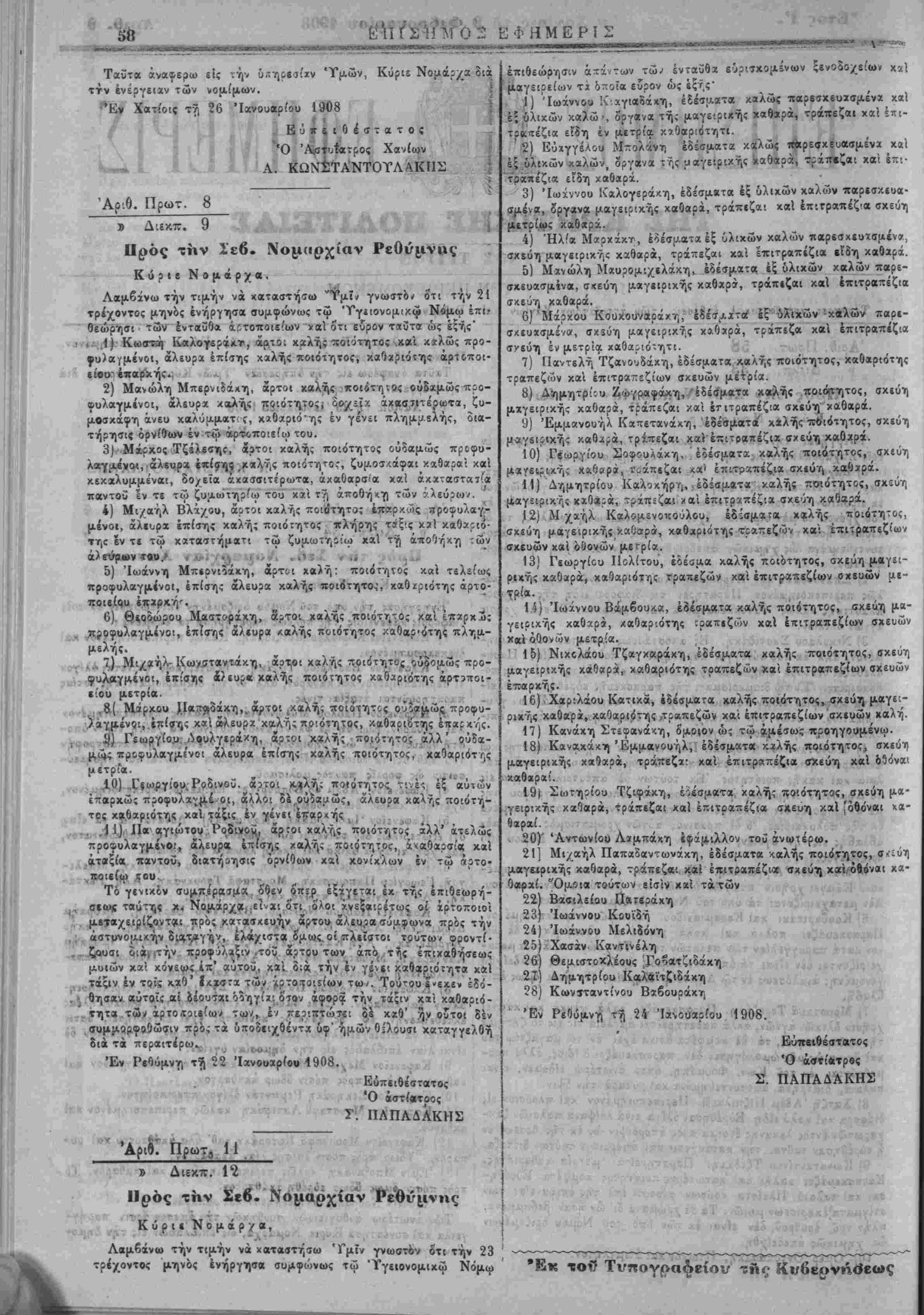 3) Ίωίννου Καλογ5ρά<η, έδέσμ*τα έξ ύλιχών καλών παρεσχιυα- σμέα, δργβνα μαγειρικϊ,ς χαδαρά, τράπιζαι χαί έπιτραπέζια σχεύΐ) μετρίως καθλρά. 4) Ήλ'α Μαρχάχτ, έίέσματα έξ υλικών καλών παρβσχίυϊσμέν» σχεύη μαγειριχής καθαρά, τράπεζαι χαί επιτραπέζια ειδή καθαρά. 5) Μανώλ·») Μαυρομιχελάκη, έδέσματα έξ υλικών καλών παρε- σχευασμένα, σχεύη μα,γιιριχής χαθαρΐ, τράπιζαι καί έπιτραπέζια σκεύη χαθαρά. 6)'Μάρχου Κοϋχοαναράχη, έδέσ^χτα1 ί? ύΧΐχών -καλών παρε- σ<ευϊσμέ/α, σχίύη μαγειριχτ,ς χ»θ»ρά, τράπίζα χαί έπιτραπίζια σ/εΰη έν μετρία χαθαριό-ητι. 7) Παντβλή Τζανουδάχη, έδέσαατα καλής ποιότητος, καθαριότης τραπεζών κα'ι έπιτρα~δζίων σκευών μέΐρία. 8) Δϊ|μητρίίυ Ζΐώγραφάχη, 'έδέιίματα καλής ποιότητος, σχεύϊ| μχγειρικής χαθαρά, τράπεζαι χαί έτιτραπέζια σχίύη χαθαρά. 9) "Εμμανουήλ Κατΐετανάχη, έδέϊματοί χϊλής π*'ιό·ητιτος, σχεύη μαγειριχής καθαρά, τράπεζαι καί έπιτρακιέζιχ σχεύη καθαρά. 10) Γεώργιον ΣοφΐυΑάχη, έοεσματα χαλής ποιότητος, σχεύη μαγ$ι;ιχή< χ*6ί(ρα, ϋάπίζαι <α' έπιτραπίζια σκ»ύη χαθΐρά. 11) Δημητρίου Καλοϋήρη, έδέσματα χαλής ποιότητος, σχεύη μαγειριχής χΐθαοά, τρχπ:ζαι /αί έπιτροιπέζια σχεύη χαθαρά. 12) Μ χαήλ Καλομενοιΐουλου, έδίσμαΓα χαλής ιΐοιό,τιιτος, σχεύη μαγειριχής χαίΐορά, χβθΐριότης τραπεζών χαϊ έπιτραπβζίων σκευών χαί όθονων μετρία. 13) Γεωργίου Πολίτου, έόέίμ,α χαλής ποιότητος, σχεάη μαγει- ριχής χαθαρά, καθαριότης τραπεζών χαί έπιτραπιζίων οχευών μ(- τρία. 14) Ιωάννου Βάιμβουκα, έδέσματα καλής ποιότητος, σχεά# μα¬ γειριχής χαθαρΐ, χαθαριότη; :ραπιζών χαί έπιτραπεζίων σχευών καϊ όθονών μετρία. 15) Νιχολάου Τζαγχκράχϊ), έδέσματα χαλής ποιότητος, σχεύη μαγειριχής χαθαρα, καθαριότης τραπεζών καί έπιτραπεζίων σχευών έπβρκής. 16) Χαρ:λάου Κατικά, ίδέσματα καλής ποιότητος, σχίΰη μαγει¬ ριχής καθαρΐ, καθαριότης ,τραπεζών χαι έπιτραπεζίων σκιυών χαλή. 17) Κανάχη Στεφανάκη, ομοιον ώς τω άμέσως προηγουμένω. 18) Κανακάκη 'Βμμανουήλ, έδέσματβ χίλής ποιότητος, σχεΰη μαγειρικής χαθαρά, τραπέζα· χαί έπιτρ«πέζια σκεύη κβί δθόναι χαθχραί. 19) Σωτηοίου Τζιφάκη, έοέσματα χαλή; ποιότητος, σχεΰη μ«- γειρκής χαθαρά, τράπεζαι χαί έπιτραπέζια σκευη καί 'οβόναι χα- θαραί. 20)' Άντωνίου Λαμπάχη ίφάμιλλον τοΰ ανωτέρω. 21] Μιχαήλ Παπαδαν-ωνάχη, έδέσματα <αλής ποιότητος, σ/.υη μαγειριχής καθαρά, τράπεζαι καί έπίτραπέζια· σχεύ·»; καί όίόναι χα- θαραί. Όμ.οι« τούτων εισίν χχϊ τά,ιών 22) Βασιλίίου Πατεράχη 23) Ιωάννου Κου'ιδή 24) Ιωάννου Μελιδόνη 25) Χασάν Καντινέλη 26) θεαιστοκλέους Γοόατζιδάκη 21) Δημ-ητρίου Καλβι'τζιδάκη 28) Κωνσταντίνου Βϊβουράχτ, Έν Ρεθύμ,νγ! τη 24 Ίανοααρίου 1908. Εύπϊΐθέστατος Ό άβτίατρβς Γ. ΠΑΠΑΔΑΚΗΣ » Διεκπ. 12 Πρός την ϊεβ. Νομαρχίαν Ρεθύμνης Κϋριι Νομάρ/α, Λαμβάνω την τιμήν νά χαταβτήσω 'Γμϊν γνωστόν ότι την 23 τρέχοντος μηνός ένήργησα συμφώνως τω Ύγειονομιχώ Νομώ "Εκ τοϋ Τυπογραφείον της ϋι/βερνήΰεως