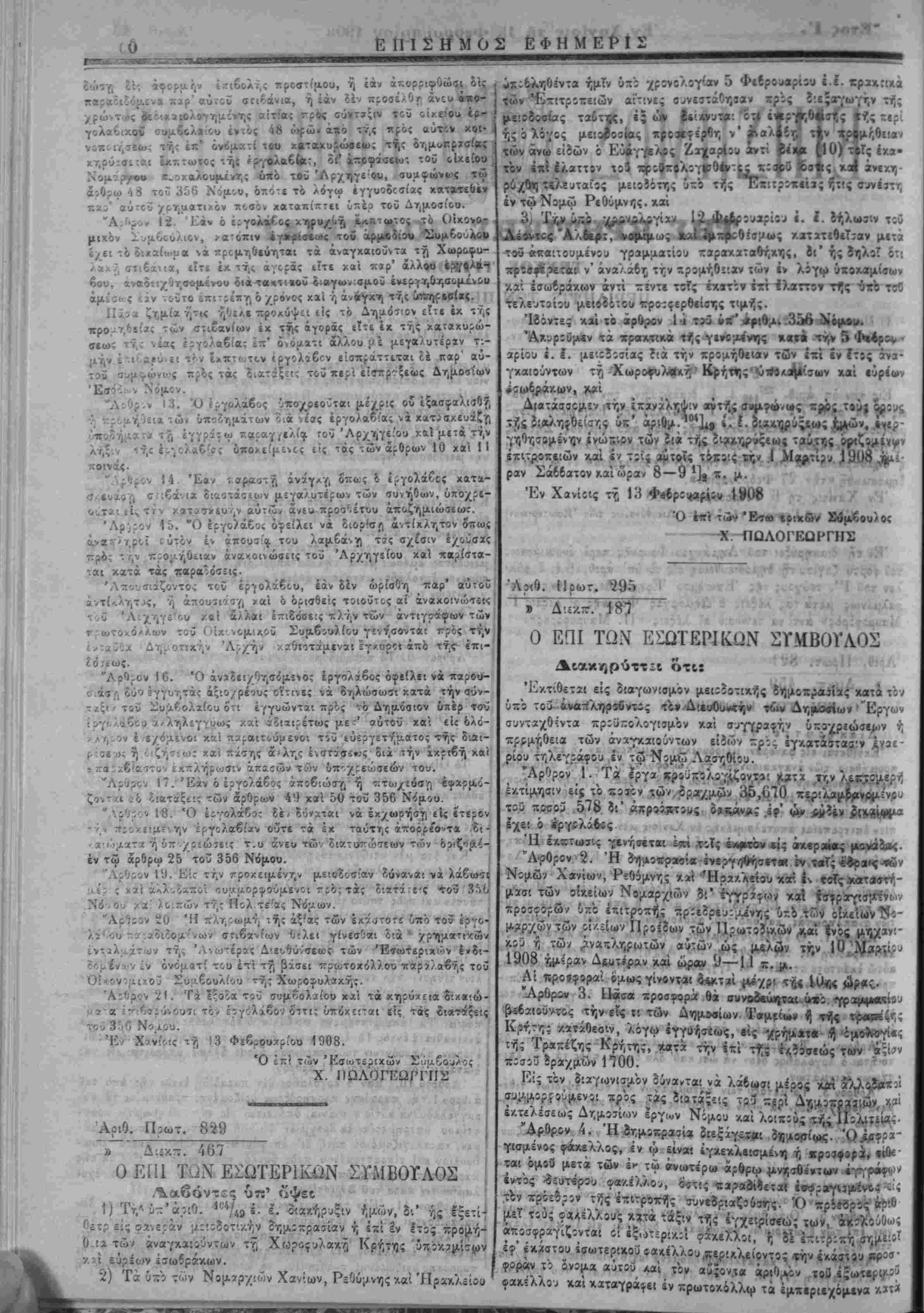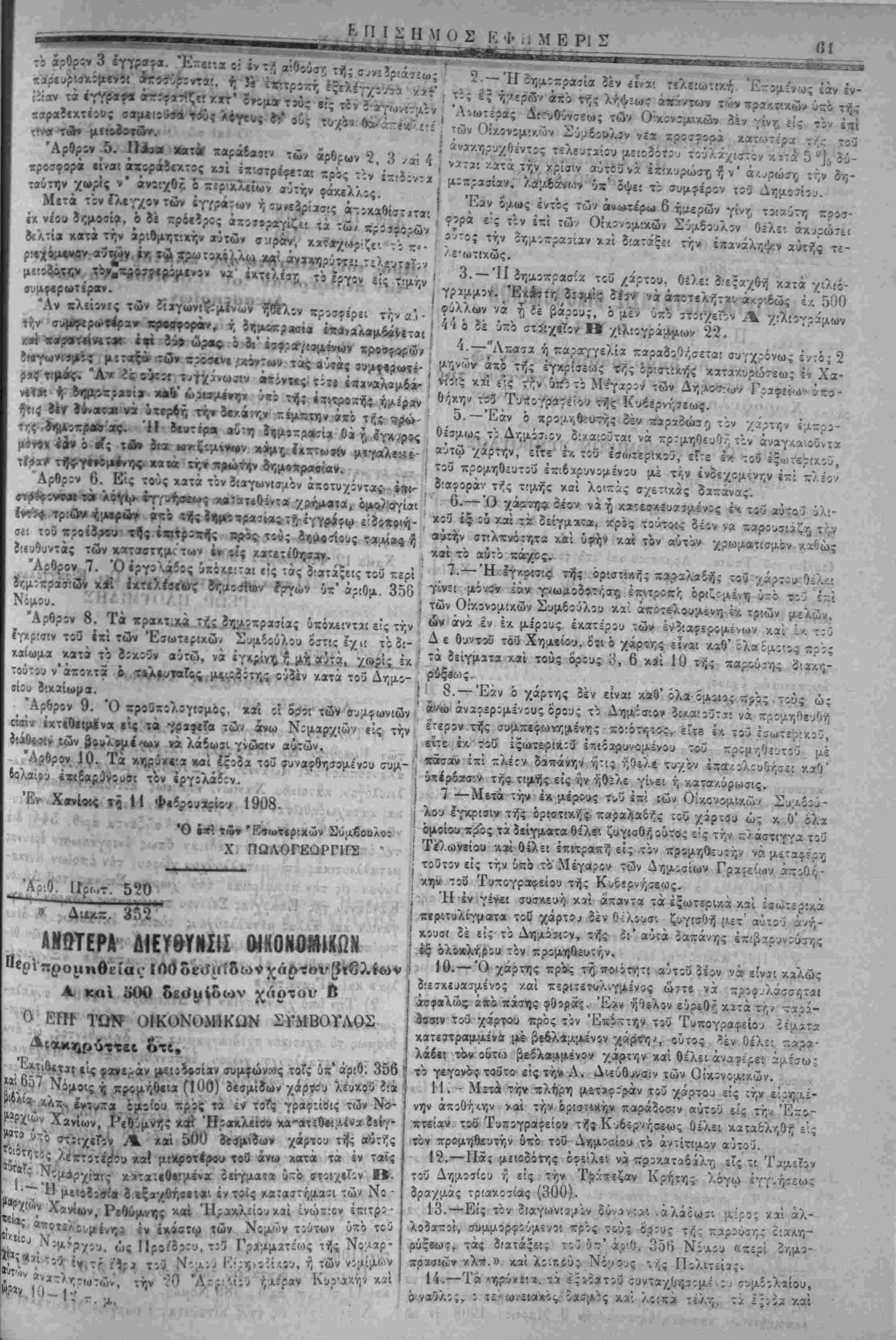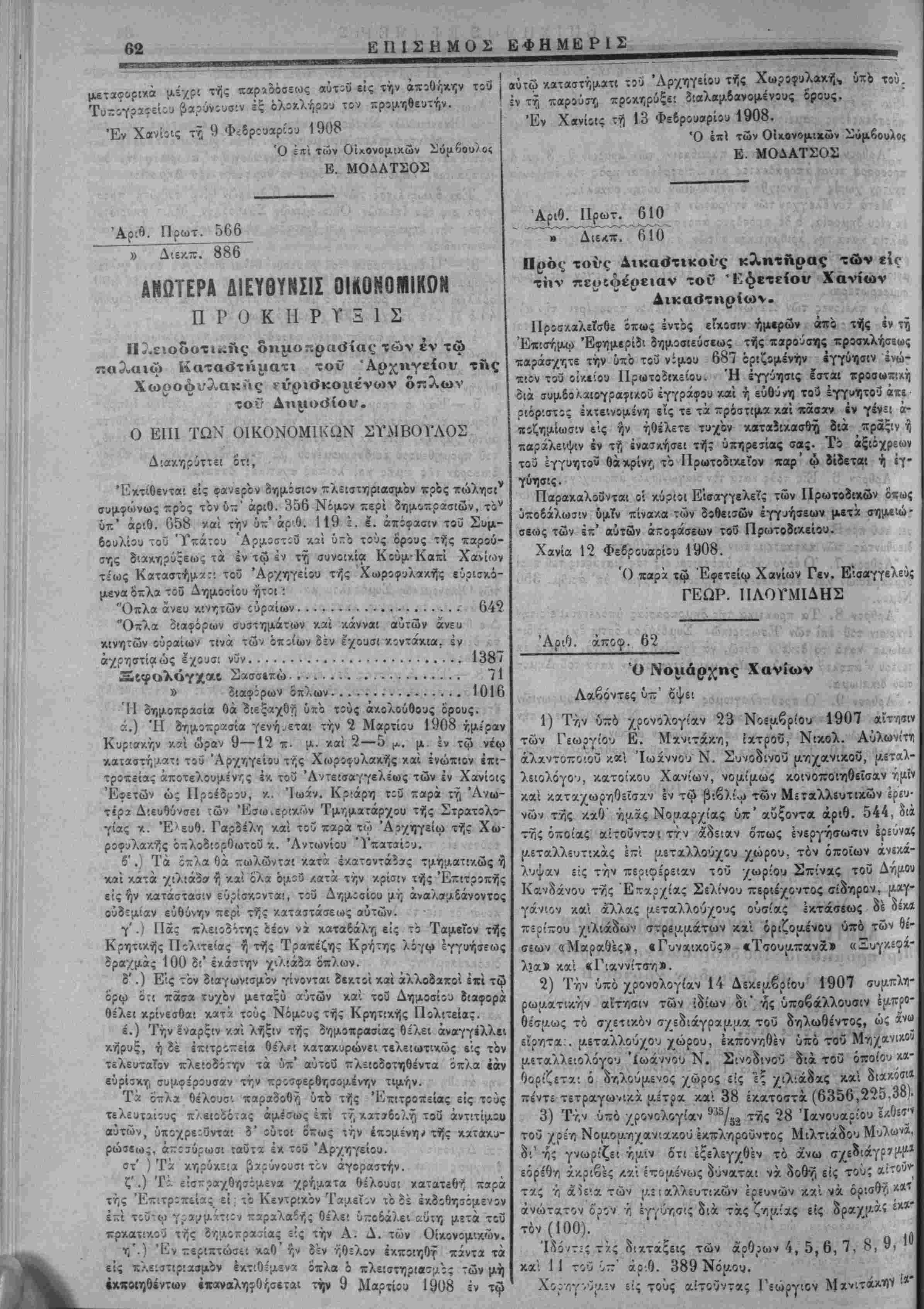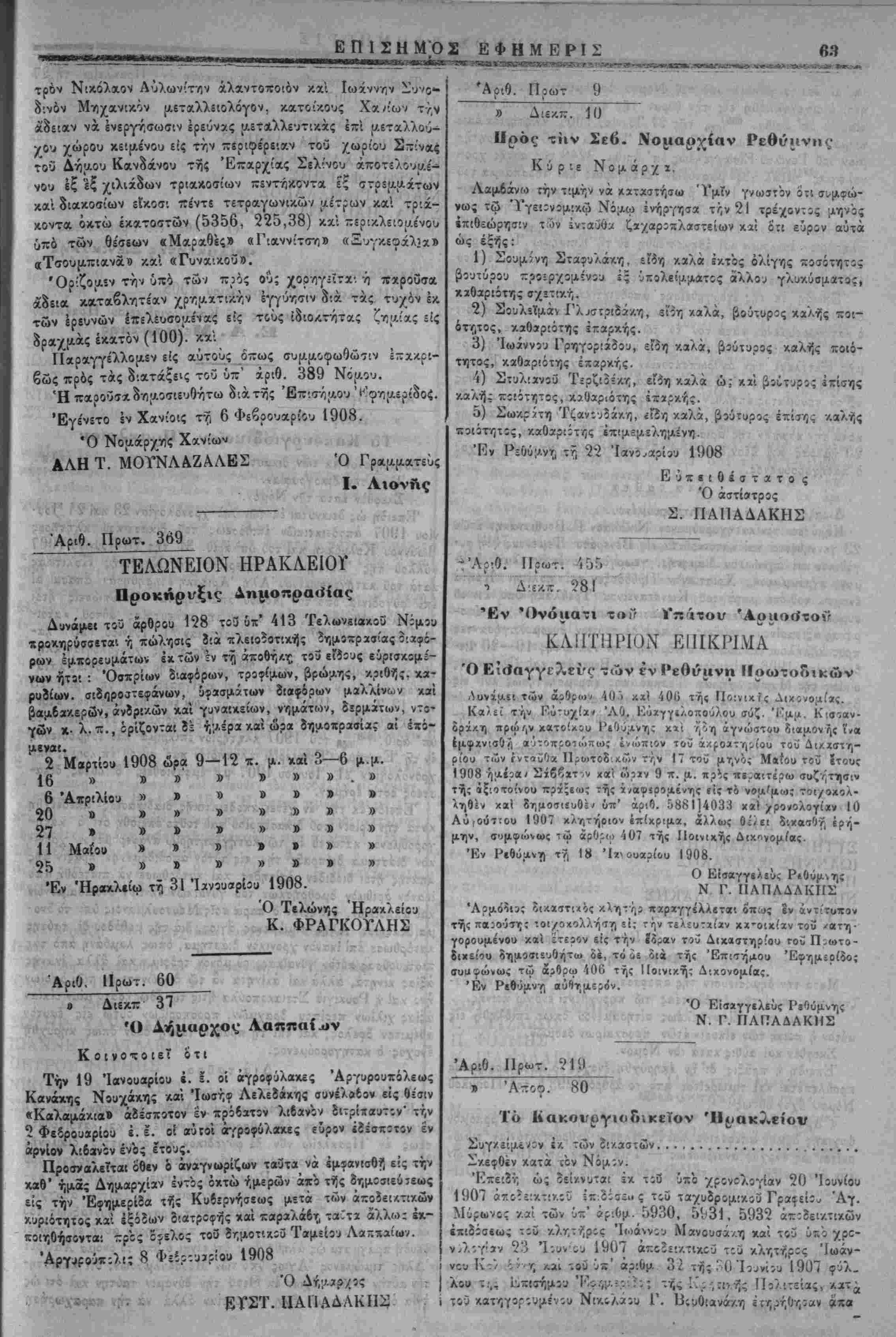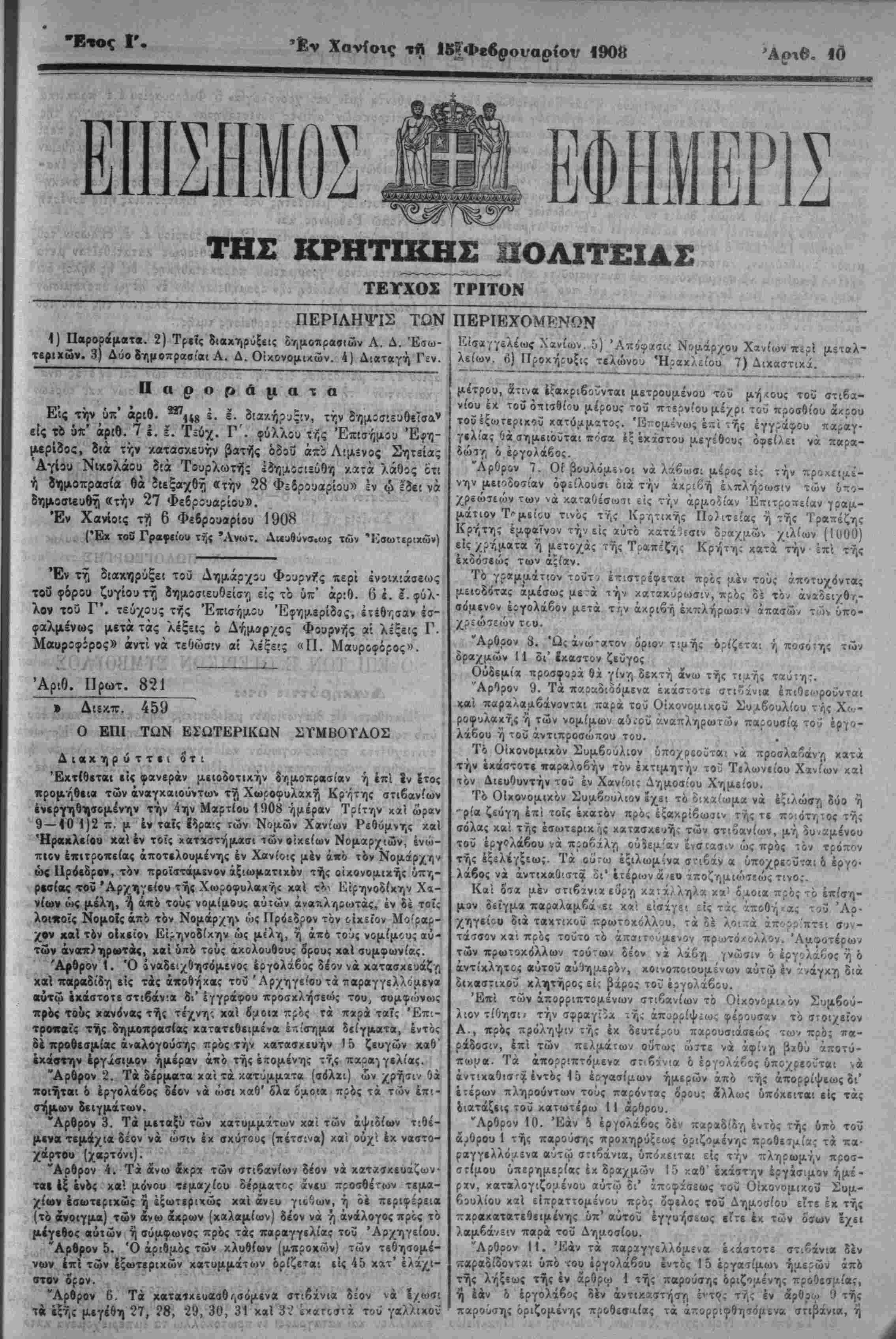 Τίριχών. 3) Δύο&ημοπραβίαι Α. Δ. θϊχονομιχών. 4) Διαταγή Γεν. λείων. 6) ΠροχήρυςΊ; τελώνου Ηρακλείου 7) Διχαστιχά.