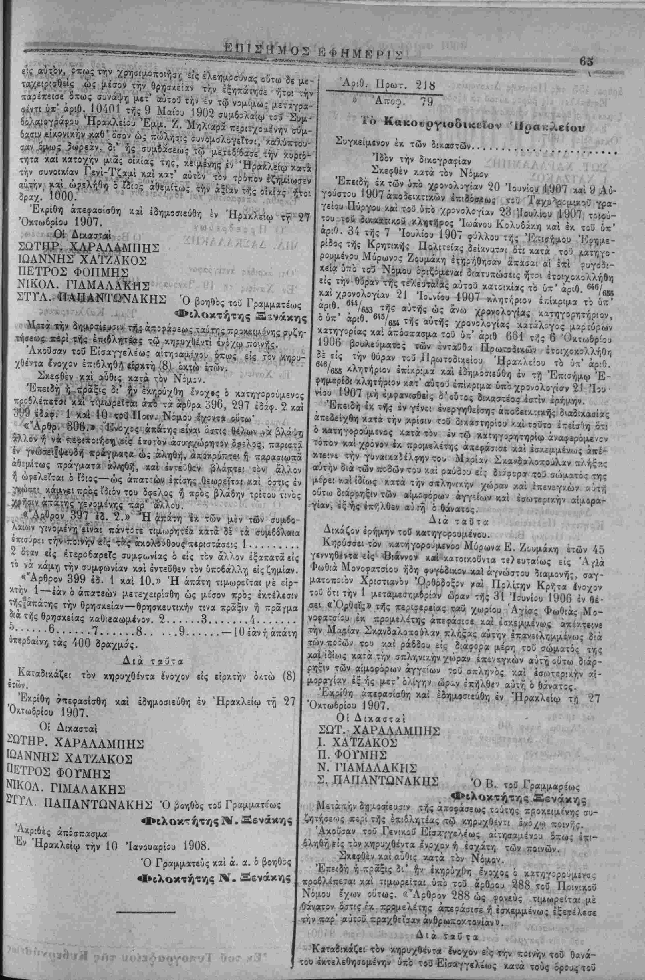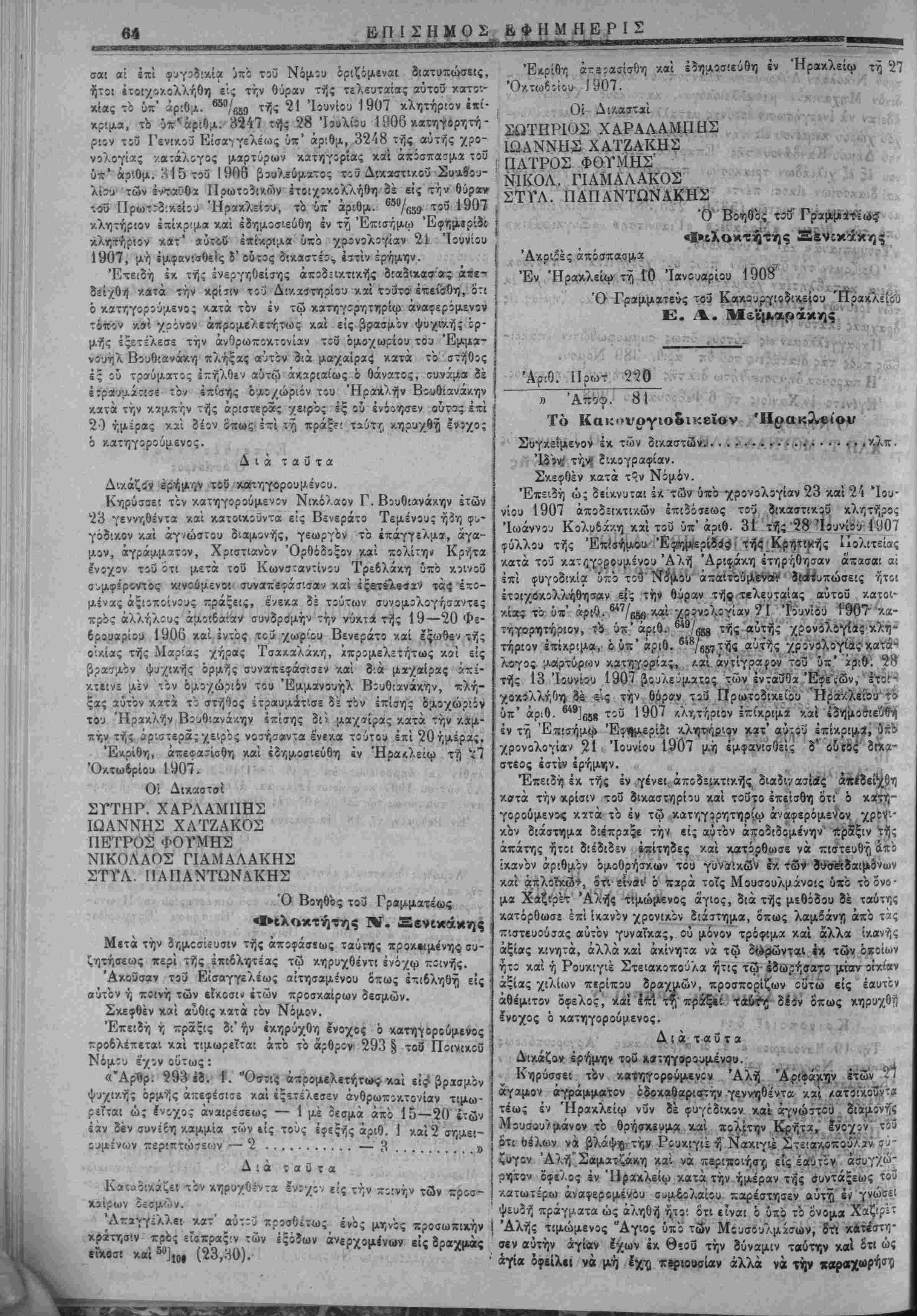 του χοΰ οικααϊΐΛθΰ ·<(.λη«ί)ρος Ίωάνου Κολϋδάκη /αί έκ τοΰ ύπ' αριθ. 34 τής 7 Ιουλίου 1907 φύλλου τής Έπισ/;μου Εφημε¬ ρίδος τής Κρητικής Πο,λίτίίας δεί·Ανυτ»ι ότι κατά τοθ /ΐΛτηγο- ρουμένου Μύρωνος Ζουμάκη έτηρήθησαν «κασα; αί Ι—ι =υγοΒί- κεία ύ~ό το3 Νόμου έρίζίμεναί διατυπώσεις ήτ?ι ετοιχοκολλήθη είς την θΰραν τής τελευταίας αύτοϋ κοιτοικίβς τό ύ-' αριθ. β<β/β8β καί χρίνολογίαν 21 Ίο.νίίΐυ 1907 κλητόριον ΐπίκριμϊ τό ΰπ' αριθ. _44/6β3 τίί? αυτής ώς άνω χρρνολογίβς λατηγορητήριον, ό ΰπ' αριθ. β45/β54 τής αυτής χρονολογίας κατάλίγος μαρΐυρων κατηγΐρίας καί ά^όσπασμα τού ύί' αριθ 681 τ/ΐς 6 Όκτω&ρίου 1906 βουλεύμαικς των ένταθδα ΙΙρωτβίικών ετοιχοκολλήθη δέ είς την θύραν τίΰ ΙΙρ,ωτίδΐχείου Ήρα/.λείβυ τό ύπ' αριθ. δ46/θ55 ιλητήριον έπί/.ρ:μα καί εδημοσιεύθη έν τί) Έπισήμψ Έ- φημερί-δ» κλητήριον κατ' αύτο3 έπίχριμα υπό χρονολογίαν 21 Ίου ■ νίου 1907 μή έμφανίσθείς 3'ούτος δ'.ν.αστίος εστίν έρήμην. Έκ€:δή «Χ τής έν γένει ένεργηθείσης άποϊεικ:(κή*ς διαδικαβίας απεδείχθη κατά την κρίσιν τού οίχαΐτηρίοιι '.αί τουτο ίτΐίσ'ιη ό'τ'. ό κΛτηγορούμενος κατά τόν έν τω κχτηγίρητηρίφ άναφίράμε/ςν τόπον καί χρόνον ϊλ προμβλίτης άπίφάτισε καί ίσΛίμμένι,ις άΐτέ- κτείνι την γιιναίχαϊέλφην τού Μαρίαν Σ<ανδ*λοζο>λαν π/ήξζς
