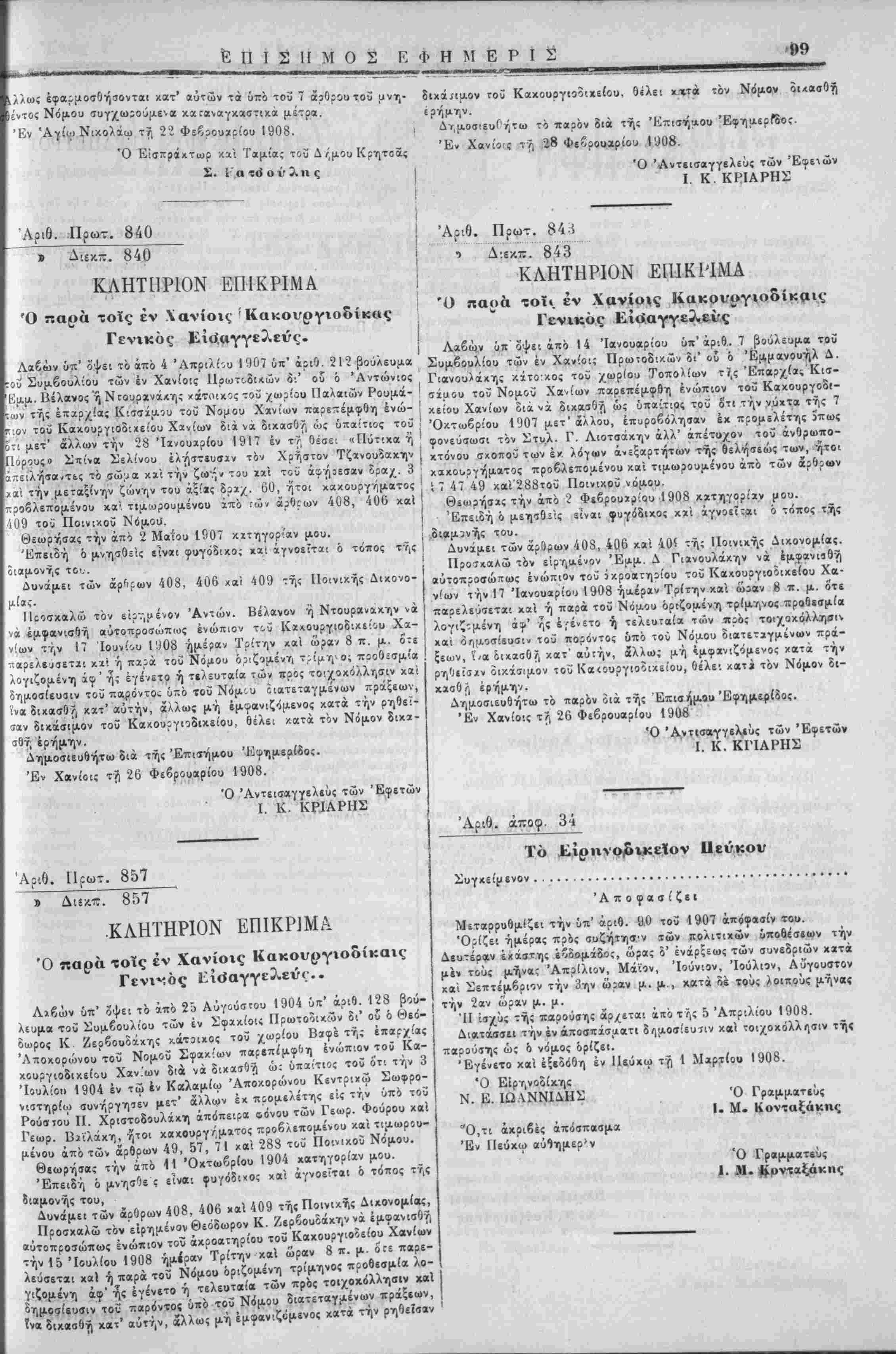 οικάσιμον τοΰ Κα<ουργιο?ιχείου, θέλει χατ» τόν Νόμον δι- ή Λιβών ύπ' όψει τό άπό 25 ΑύγοΰσΓου 1904 Οτι* αριθ. 128 βού- λευμα τοΰ Συμβουλίου των έν Σ<ρχίοις ΠρωτοδιχΛν δι' ου ό Θεό- δωρος Κ Ζερβουδάχης χ,άτ^ιχος τοϋ χωρίου Βϊφέ τή; επαρχίας Άποκορώνου'τοΰ Νομοϋ Σφακίων παρεπ/μφ'ιη ένώπ,.ον τοϋ Κα- κουργιοδιχεί&υ Χαν.'ων διά νά δικασθγι ώ: ΰπα-'τιος τοϋ ότι την 3 Ίουλίοιι 1904 έν τω έν Καλαμίω Άποκορώνθυ Κεντριχω Σωφρο- νιστηρίω συνήργηιέν μετ" άλλων έχ προμίλέτης είς την Οπό τοΰ Ρούσΐού Π. Χριστοδουλάκη άπόπειρα οόνου των Γεωρ. Φουρου χά! Γεωρ. Βινλάκη, ήτοι χακουργι-ματος προβλεπομένου *αΐ τιμωρου- μίνου άπό των άρθρων 49, 57, 71 χαι 283 τοΰ Ποινικοΰ Νομου. Θεωρήσας την άπό 11 Όχτωβρίου 1904 κατηγορίαν μου. Έπειδή ό μνησθε ε είναι (ρυγόοιχος καϊ άγνοείται ό τοπος της διαμονής τού, . , , Δυνάμει των άοθρων 408, 406 χ αί 409 τής Ποινικτ,ς Διχονομίας, Προσχαλώ τόν είρημένονθεόδωρον Κ. Ζερβουδάκην να εμφανισθγ, αυτοπροσώπως ενώπιον τοΰ άχροατηρίου τοΰ Καχουργιοδείου Χανίων την 15 "Ιουλίου 1908 ημέραν Τρίτην χαϊ ώραν 8 π. μ. ο τε «αρε- λεύσεται χαί ή παρά τοΰ Νο'μου όριζομένη τρίμ-ηνος προθεσμία λο- ϊιζομέντ άφ' ής εγένετο ή τελευταία των πρός τοιχοκολλήση καΐ δημοσίευσίν τοί; παρόντος 6πό τοΰ Νίμου διατεταγμενων πραξεων, ίνα διχασθή κατ' αυτήν, 5λλως μή ίμ«ανιζί|Μνθί χατα την ρηθείσαν Ί ρήμ) Λημοσιευθήτω τό παρόν διά τής Επισήμου Έ Έν Χανίοις τ?, 26 Φεβρουαρίου 1908 Ό Άντισαγγβλιυς των 'Εφετών Ι. Κ. ΚΓΙΑΡΗΣ Αριθ. άποφ. 34 Τό Ειρηνο/δικειον Ιΐενκον Συγχείρενον......................................... 'Αποφασίζει Μεταρρυθμίζίΐ την ύπ' αριθ. 9.0 τοΰ 1907 απόφασιν τού. Όρίζει ημέρας πρός συζήτησιν των πολιτικών ύπο6έσ«ων την Δευτέραν έχά&της έζδομάδος, ώρας V ενάρξεως των συνεδριών χατά μέν τούς μήνας Απρίλιον, Μάϊον, Ιούνιον, "Ιούλιον, Αυγουστον χαί Σεπτέμβριον την 3ην ώ:αν μ. μ., χατά δί τούς λοιπούς μήνας την 2αν ώραν μ. μ. ΊΙ ίσχύς τής παρούσης άρχεται άπό της 5 Απριλίου 1908. Διατάσσει την έν άποσπίσιιατι δημοσίευσιν καΐ τοιχοκόλλί>σιν τής