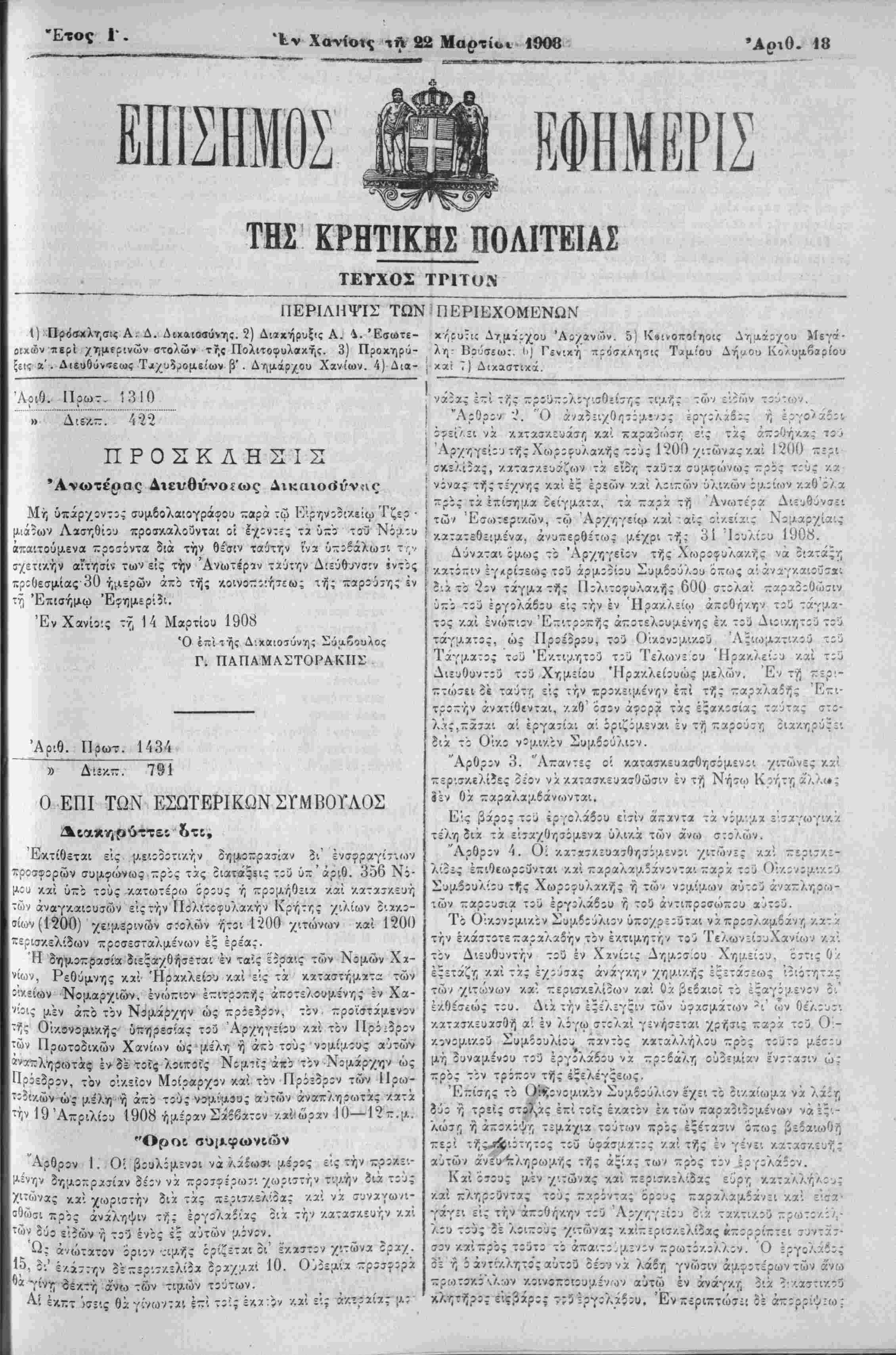 Έν Χανίοις τή 1 Φεβρουαρίου 1908.