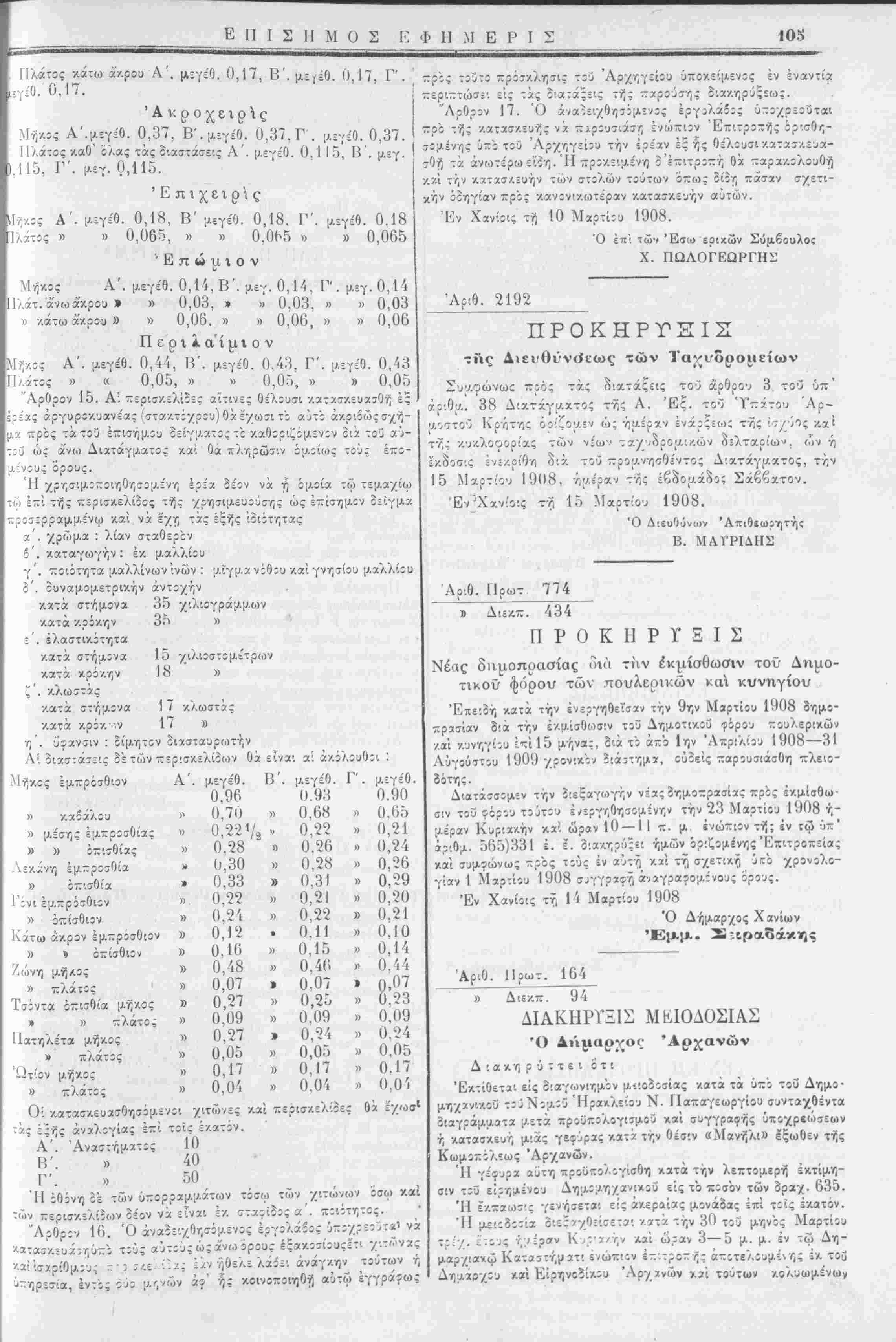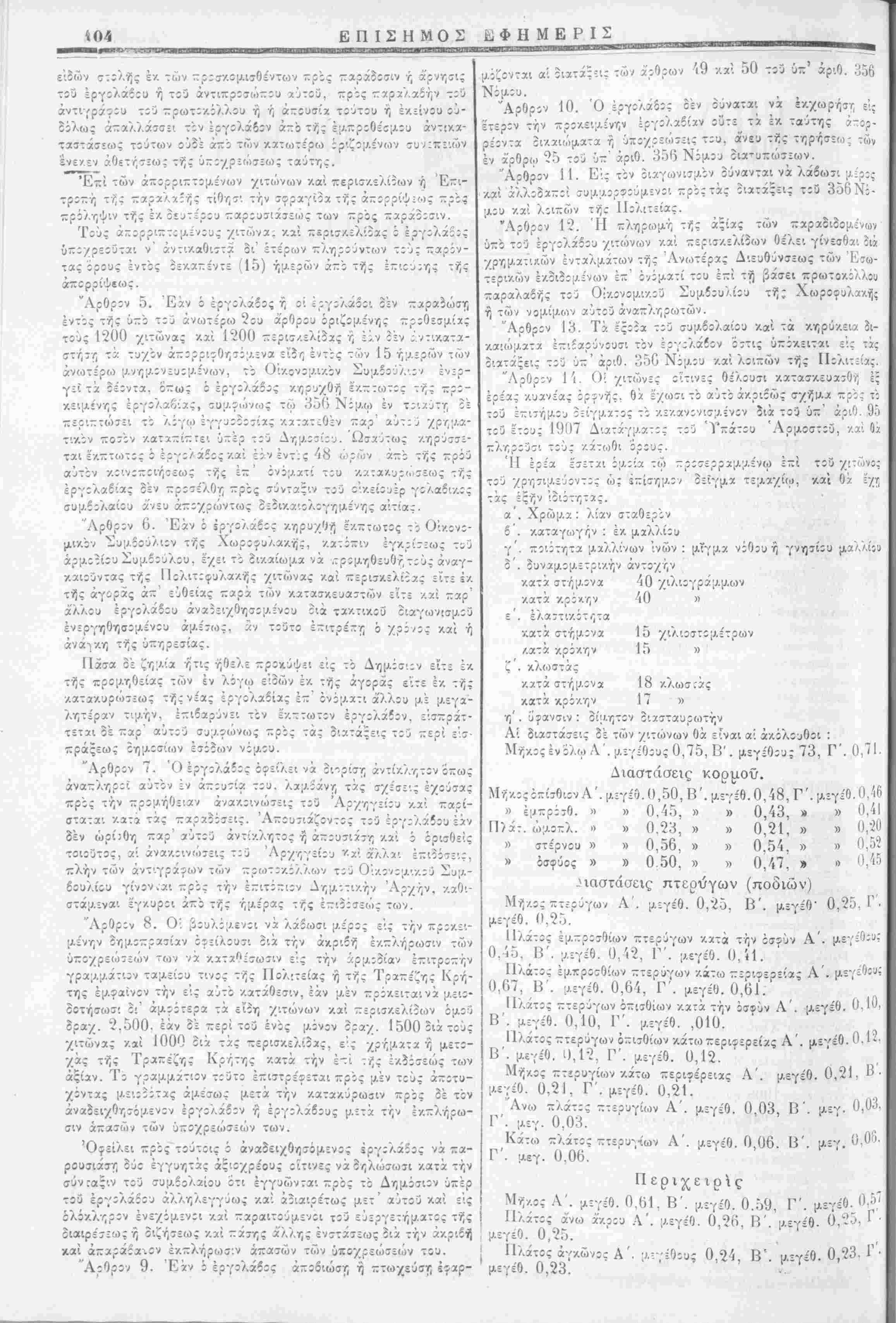 ΐφεί'.ει να κατασκ:·<ιάσ(] /.αί παραοιο-ί; ε'ς τχς ?~ο(Ιή/.α; το^ Άρ-/ηγείυτϊ;ςΧωρ55υΛακ1ί;ς τοϋς 1*200 -/ιτώνας/.αί 1200 -3οι σκΐλιοας, κατα-Λΐυάζων τα ειδή ταυτα συμφώνω: ~ρϊς τ:ΰς /.α | νόνας τήςτ:'χν/;ς /.αί ές έρεών /.αί λ:ι~ών ϋλι/.ών ϊμΐίων καθ 0/ α | ~ρός τα έπίσημα οιίγμχτα, τα -αρά τή Ανωτέρα ΛιΞ■^θ^νσε'. Ι τώ' Έσωτερικών, τω Αρ'/Λ,γίίω /.αί "α'.ί οι/.ϊίαΐί Νομαρχίαις /.ατατεθε:μένα, ανυπερθέτως μέχρι τή: 31 Ιουλίου 1908. Δύναται ομως τ'ο Άρ-/ηγεϊον τής Χωροφυλα/.ής νά οιατάςν; κατόπιν έγ<ρί-εο)ς τοϋ άρμοοίου Συμδούλου ο~ως αί άναγκαιοΰσαι διά-ό "2ον τάγματής Ι1ολ'.το?υλα/.ής 600 στολαί παρϊϊοθωσιν 1ι—ο τού έργολάδου εί; την έν Ηρακλείω ά;: ο Ο ι", ν. ην τού τάγμα- τος καί ένώ~ι;ν Έττιτρο-ής ά-οτελουμένης έκ τού Διοικητού τού τάγματος, ώς Προέορου, τού Ο'κονομικου 'Λςιωματι/.οΰ το^ Τάγματος τ«3 Έκτιμητοϋ ^ζ:^ Τίλωνε ου Πρα/.λεί;ο καί τ^ Διευθυντού τού Χημείΐυ Ήρακλείουώς μελών. Έν τί] ζερ·- τττώτϊΐ οέ ταύτ/; εις την προκειμένην έ~ί τής τταρ^λαβίΐς Ε-ι- τρο-ήν άνατίθενται, /.αθ' όσον άΐορα τάς έςαΛθσίας ταύτας στο- λΛς,ζασα1. αί έργα-ίαι αί όριζομεναι εν τή τ.χρούζη οιακηρύςς·. ϊιά τ'ο ΟΊκο ν'μιν.ίν Συμβούλιον. Άρθρον 3. "Α-αντες οί καταϊ/.ευασθησόμενο·. -/ιτώνίς -/.7.< περισκελίϊες ϊίθ/ νά/ατασκευασθώσιν έν -ή Νήτιο Κ'γ,τυ; α'λλίε: «έν Οά παραλαμβάνωνται. Εις βάρος τού ϊργολάδου είτίν ά'-αντα τα νόμ·;;.^ ε·-αγωγι·/.ά τέλη διά τα εί-α"/;θί;σόμΐνα ΰλι/.ά των ά'νω στολων. Άρθρον 4. Οί κατϊ-λςυαϊθησόμενίΐ -/ιτω^ες -Λαί ζϊοιγ/.:- λ'.οες έπιθεωροΰνται /.αί ιταραλαμδάνΐντα'.-αρά τού Ο:/.ο^ϊ;λ·./.ο5 Συμβουλίου τής Χωροφυλακής ή τώ/ νομίμων αυτού άνα—ληρω- ιών ζαρουτια τού έργολάβου ή τού άντιττροσώπου αυτού. Το Οικονομικόν Συμβούλιον ύπονρεοϋται νάπροσλαμ,βάνΓ, κατ/ -ήν έΛαστοτετταραλαβην τόν έ/.τιμητ»;/ τού ΤελωνείουΧανίω; κχ·. τον Διευθυντήν τού έν Χανίοις Δημ;; ου Χημ=ί;υ, ό>τ;ς 0/