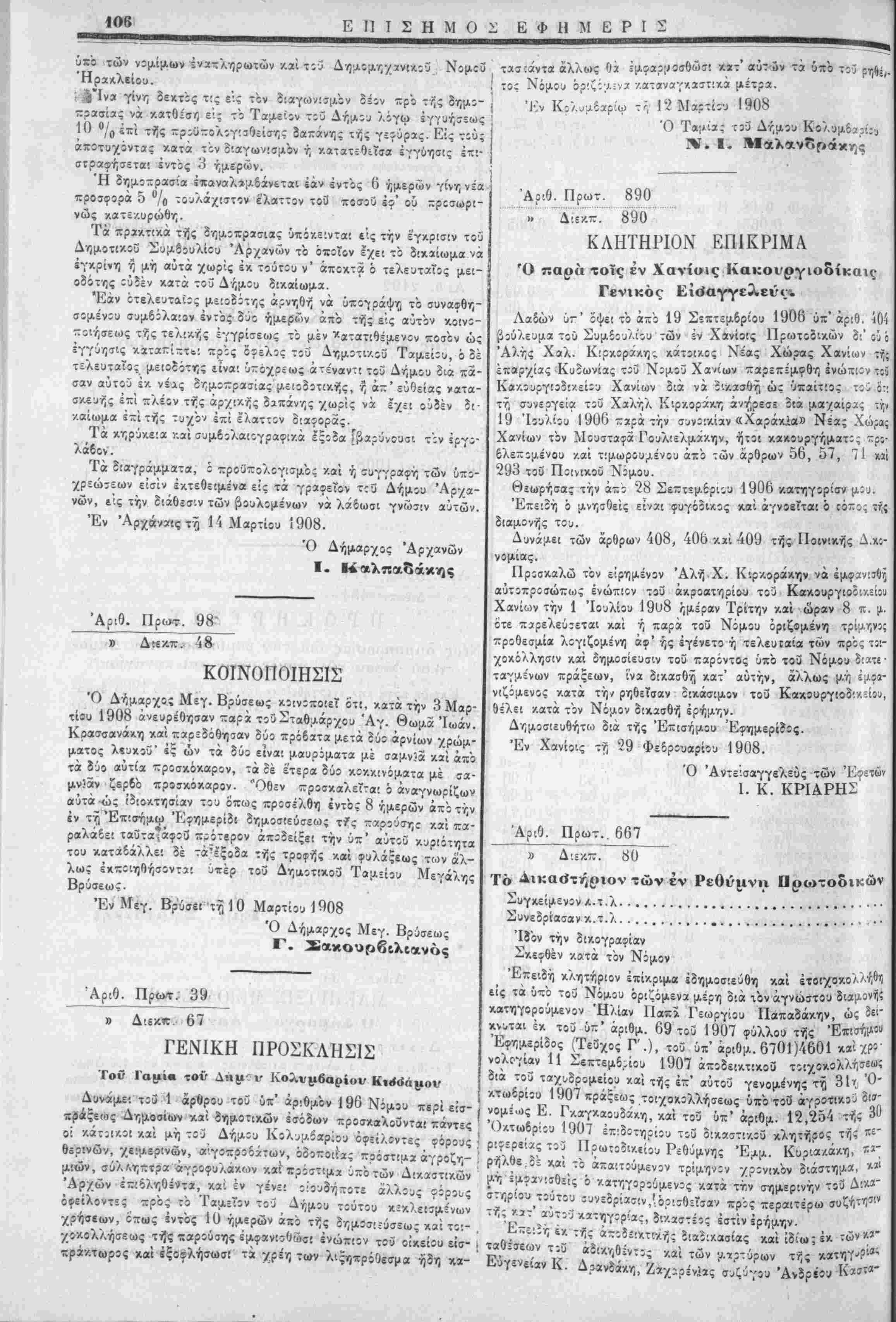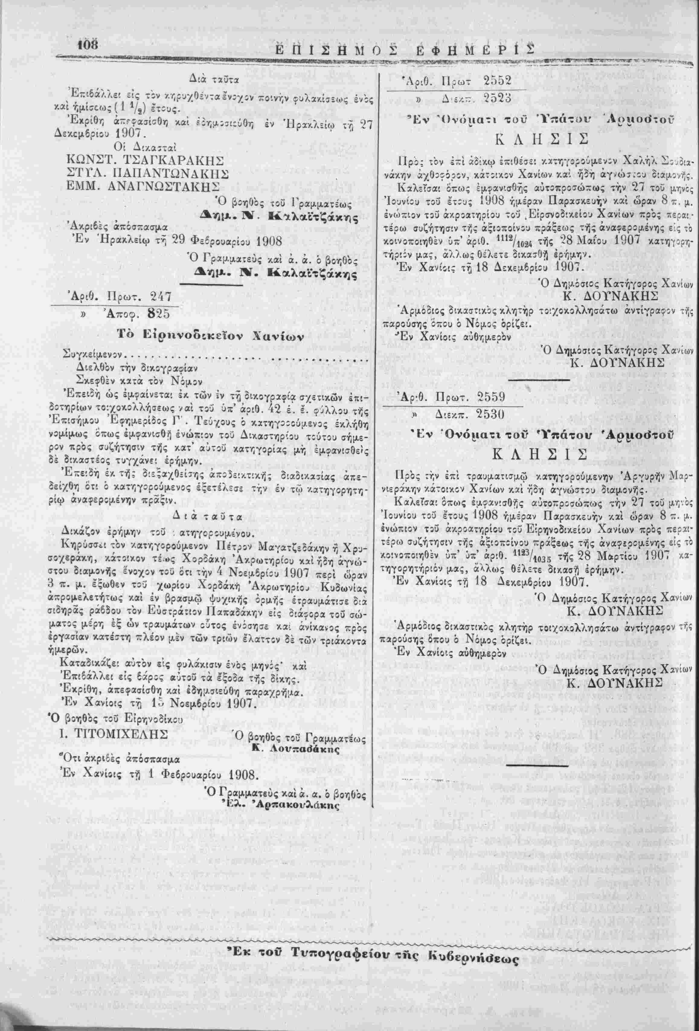 'Λο»ιο<ίτοΰ Αριθ. Πρωτ 2552 » Δ~Τ/.- 252ο Έν "()ν«Μΐατι τού Κ Λ Π Σ 1 Σ Προ: τόν επί αδίκω ίπιθέαί'. ·Αχτηγορούμεν;ν Χαλήλ Σ:.-3:α- νάκην άχθ-ΐόρον, κάτ-ιχον Χανίων καί ήδη άγ;ώ-;-υ διαμίνης. ΚαλίΤσαι όπως έμφανισθής αϋτ-προσώπως την 27 τοϋ μηνός Ίουνίϊυ τοΰ ετ;υς 1908 ημέραν Παρασκευήν καί ώραν 8 χ. μ. ενώπιον τοΰ άζροατηρίου τού1 ,Είρσνοδ'.κ,είο·.» Χανίων πρός περαι¬ τέρω συζήτησιν τής άξιοποίνου πράξεως τής άναφερομένης είς τ'ο κοινο-οιηθέν ύπ' αριθ. 1112/ιο24 ΐτ1? *8 Μαίου 1907 κατηγ-ρκ;- τήριόν μας, άλλως Οϊλετε δικα-Οϊ) έρήμην. Έν Χανί-ϊς τή 18 Δεκεμβρίΐυ 1907. Ό Δημόσίθς Κατήγορος Χανίων Κ. ΔΟΥΝΑΚΗΣ Άρμόδι-ς δααστίκϊς κλητήρ τ-ιχοκολλησάτω αντίγραφον της παρούσης ίπου ό Νόμος όρίζει "Έν Χανίοις αυθημερόν Ό Δημόσ'.ίς Κατήγορος Χανίων Κ.ΔΟΥΝΑΚΗΣ Άρ·θ. Πρωτ. 2559 ΐό/.τ. 2530 'Ι-'ν Ονόματι τοίί Ύπάτοι/ Ί Κ Λ Η Σ 1 Σ Πρός :ήν επί τραυματισμω ν.ατηγορούμενην 'Κξ,χ^^ι Μαρ- Ίεράκην ■/.άτοιν.ον Χανίων 7.αί ήδη άγνώστυυ οιαμονής. Καλεΐσα: όπως ίμοανισθής αυτοπροσώπως την 27 τού ,».,·-, Ίουνίου τού ετους 1908 ημέραν Παρασκευήν καί ώραν 8 π. μ. ενώπιον τΐΰ άχ.ροατηρίου τοΰ Εϊρηνοδικείου Χανίων πρός περαι¬ τέρω συζήτησιν τής άξ'.οπΐίνου πράξεως τής άναφΐρ-μένης είς το /-•.νοποιηθέν ύπ' ύπ' αριθ. 11-3/ΐ033 τής 28 Μβρτίου 1907 /.α- τηγορητήριόν μας, άλλως θέλετε 3ι/.ασή έρήμην. Έν Χανίοις τή 18 Δεκεμβριού 1907. Ό Δημόσΐος Κατήγορος Χανίων Κ. ΔΟΥΝΑΚΗΣ Αρμόδιος δικαστικος κλητήρ τοιν.ολολ/.ησάτω αντίγραφον της παρούσης ό'που ό Νόμος όρίζει. Έν Χανίοις αυθημερόν Ό Δημόσιος Κατήγορος Χανίων Κ. ΔΟΥΝΑΚΗΣ Έκ τοίί Τν-ογραφείον της Κυ6εΡνή(ίεως