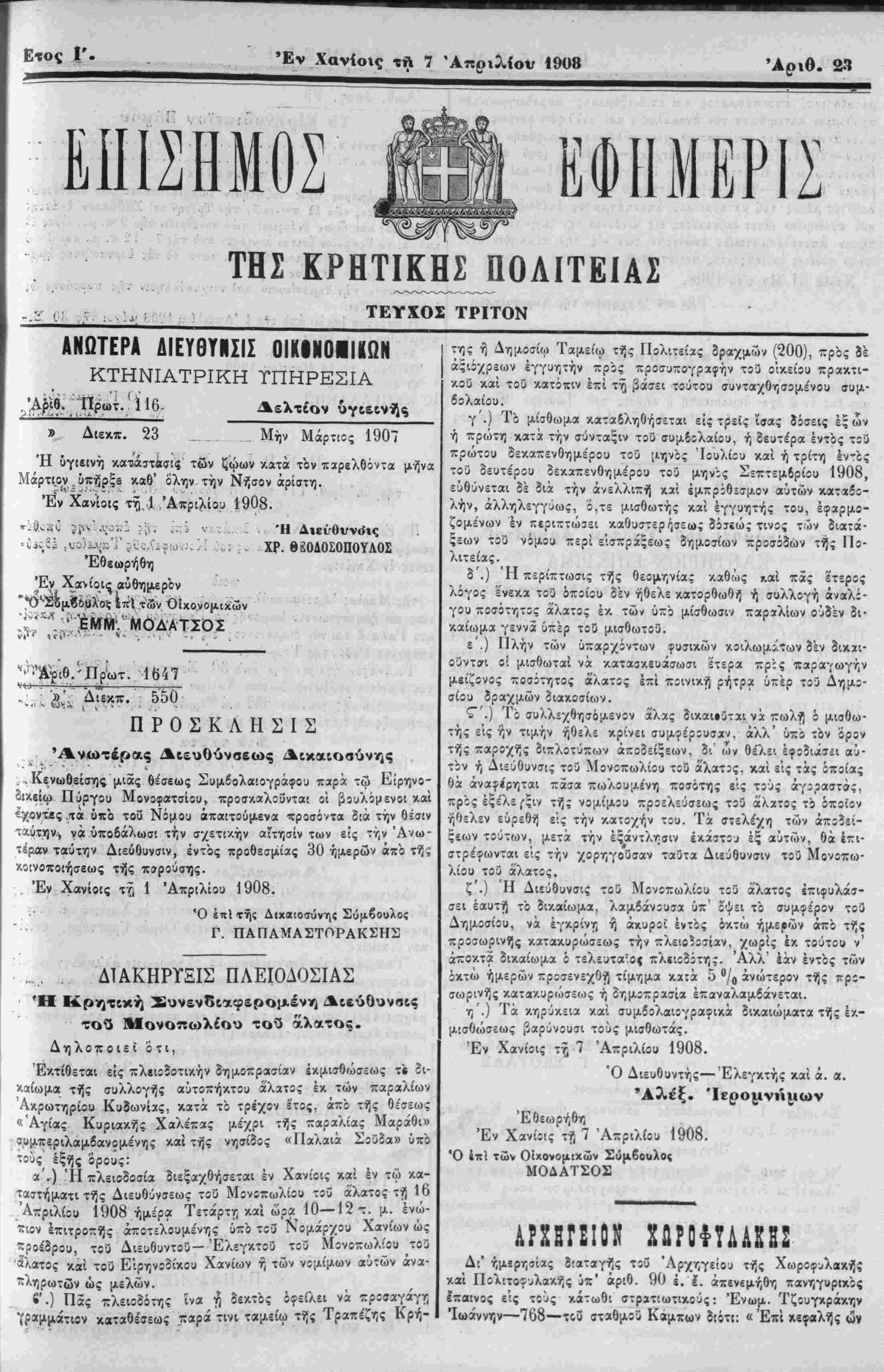 Έν Χανίοις τί) 1 Απριλίου 1908.
