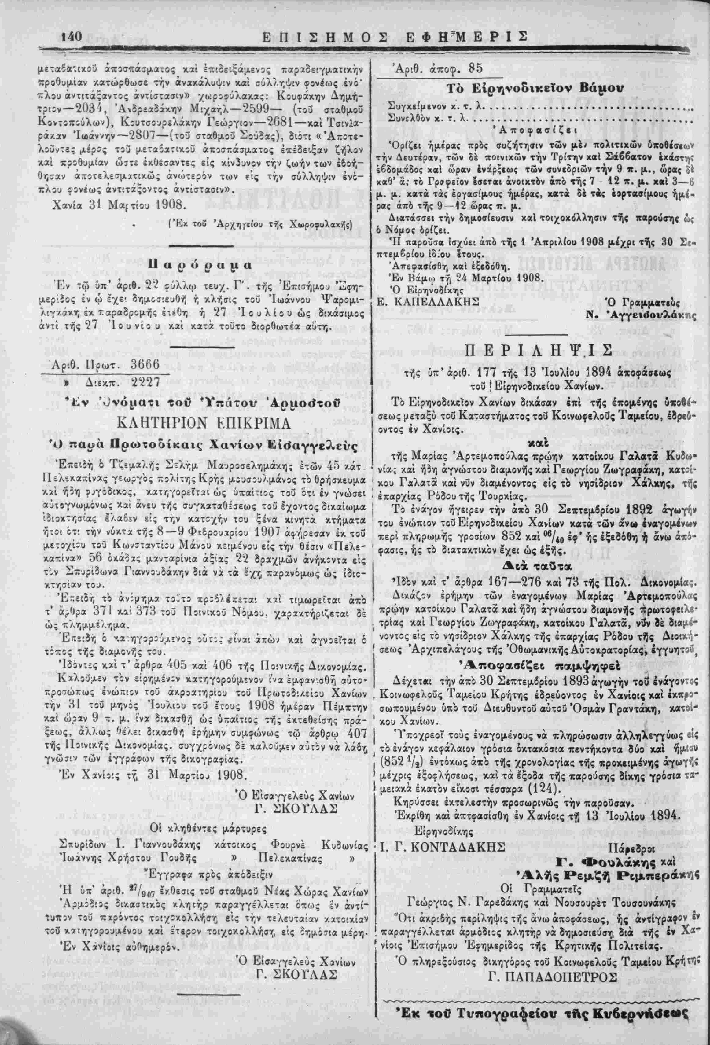 "Εκρίθη καί άπτφασίσθη έν Χανίοις τί) 13 Ιουλίου 1894.