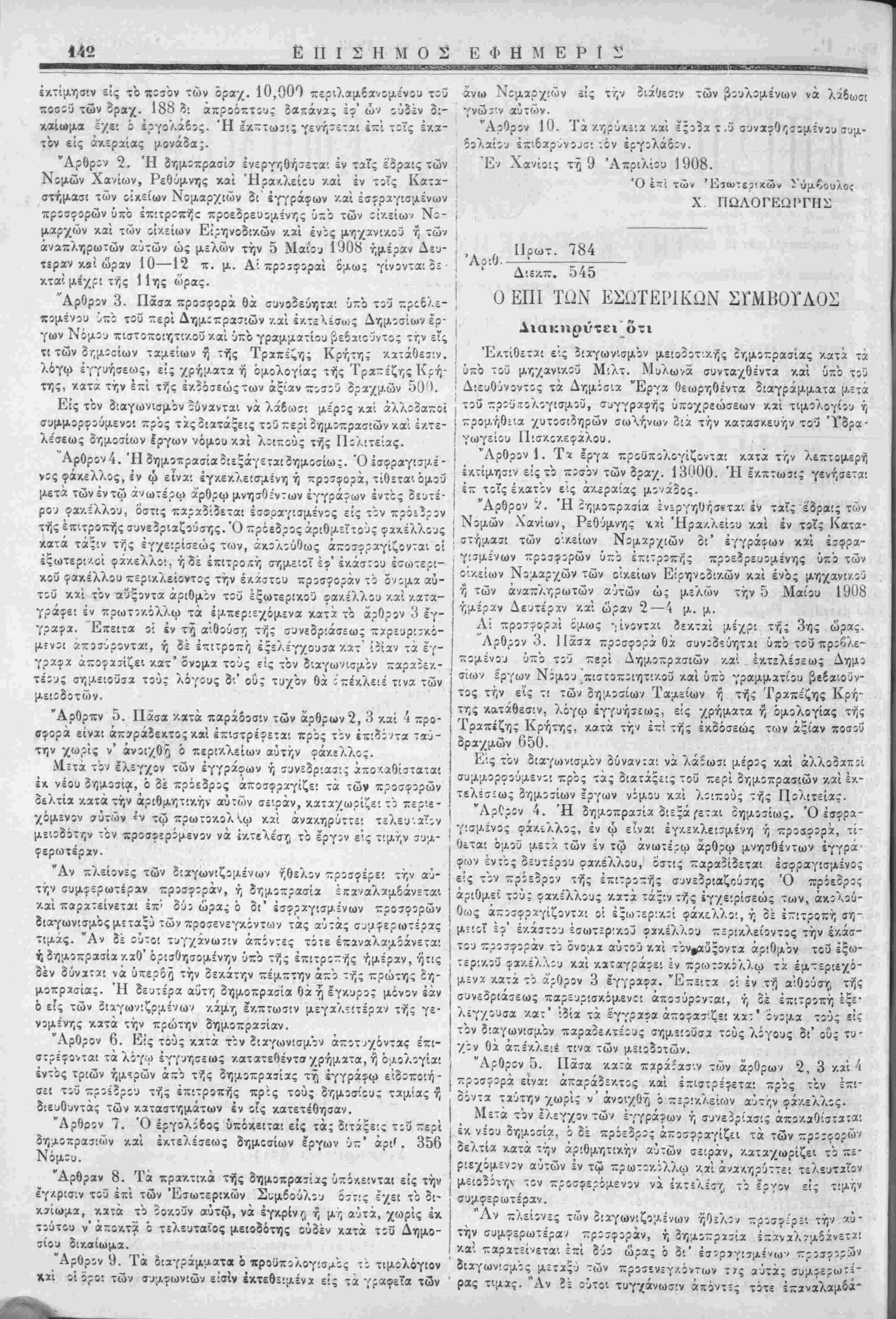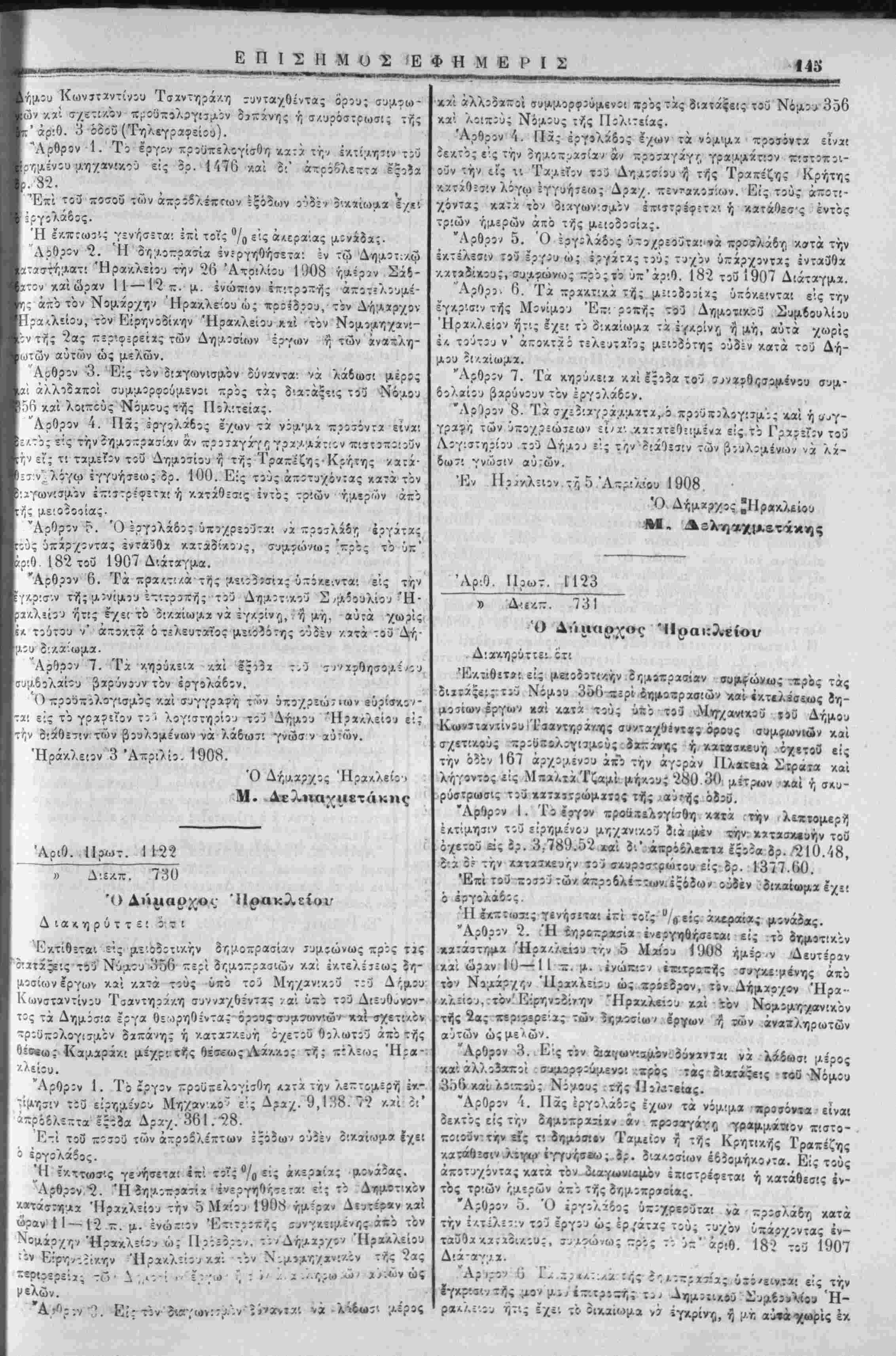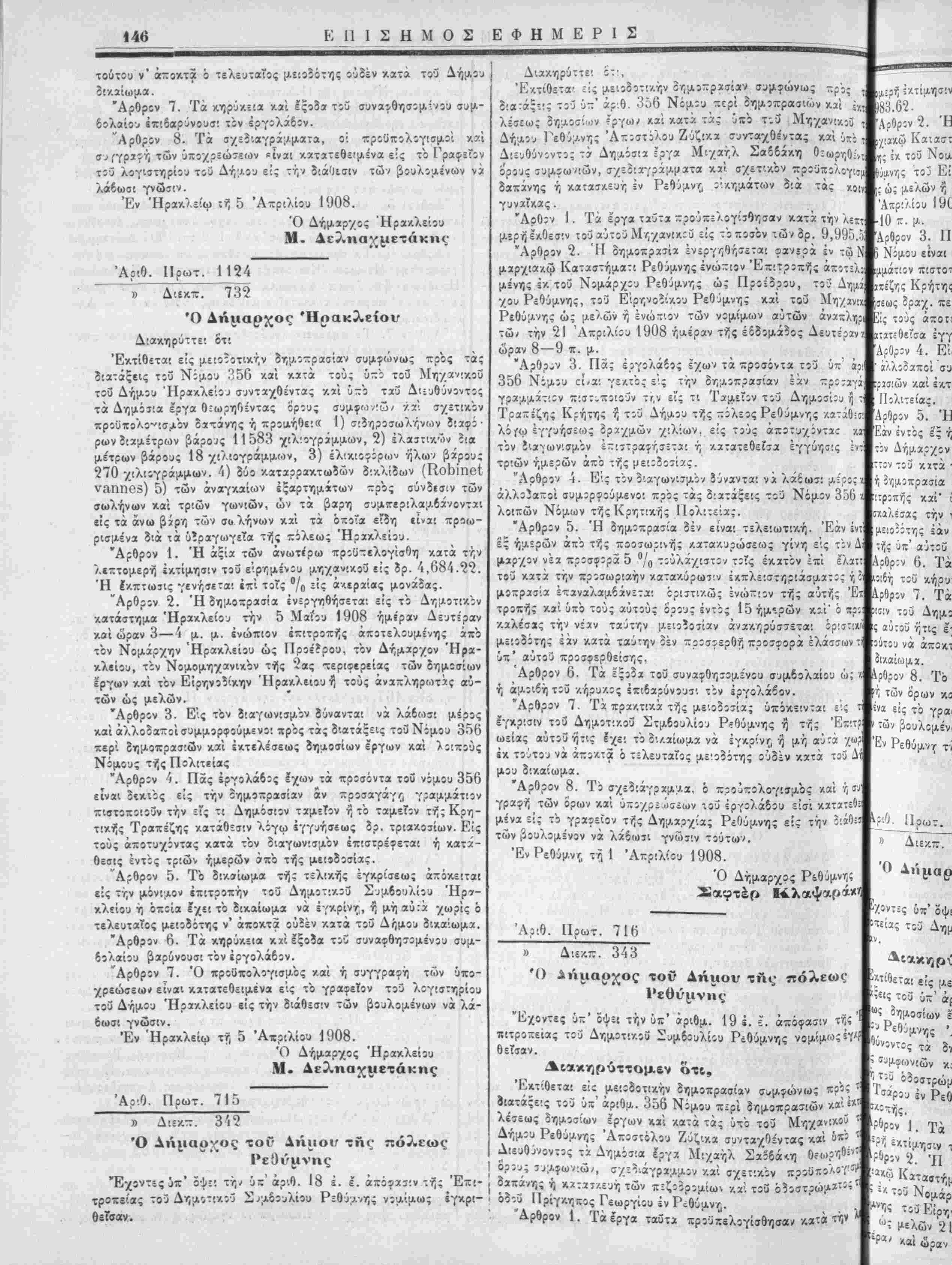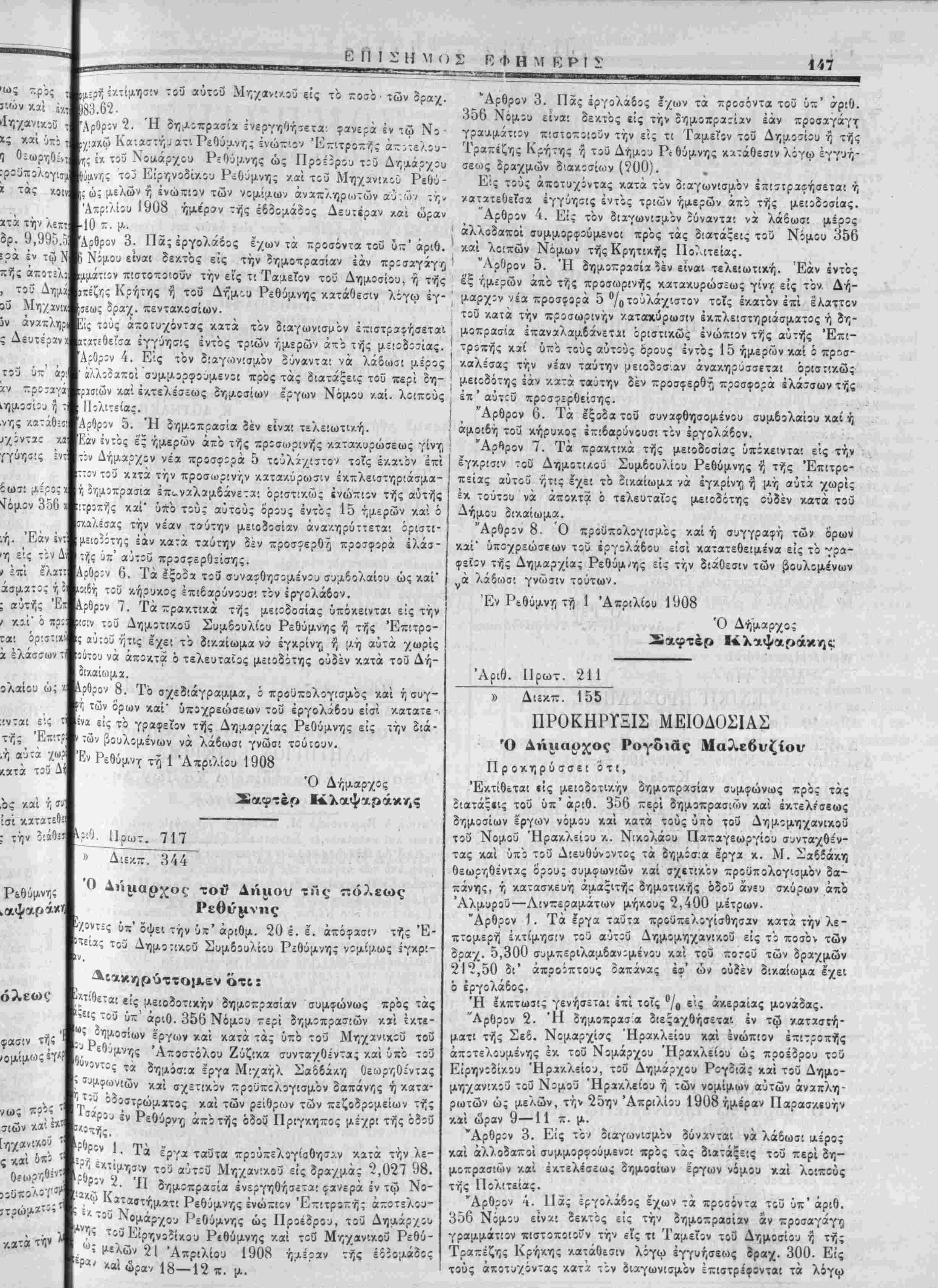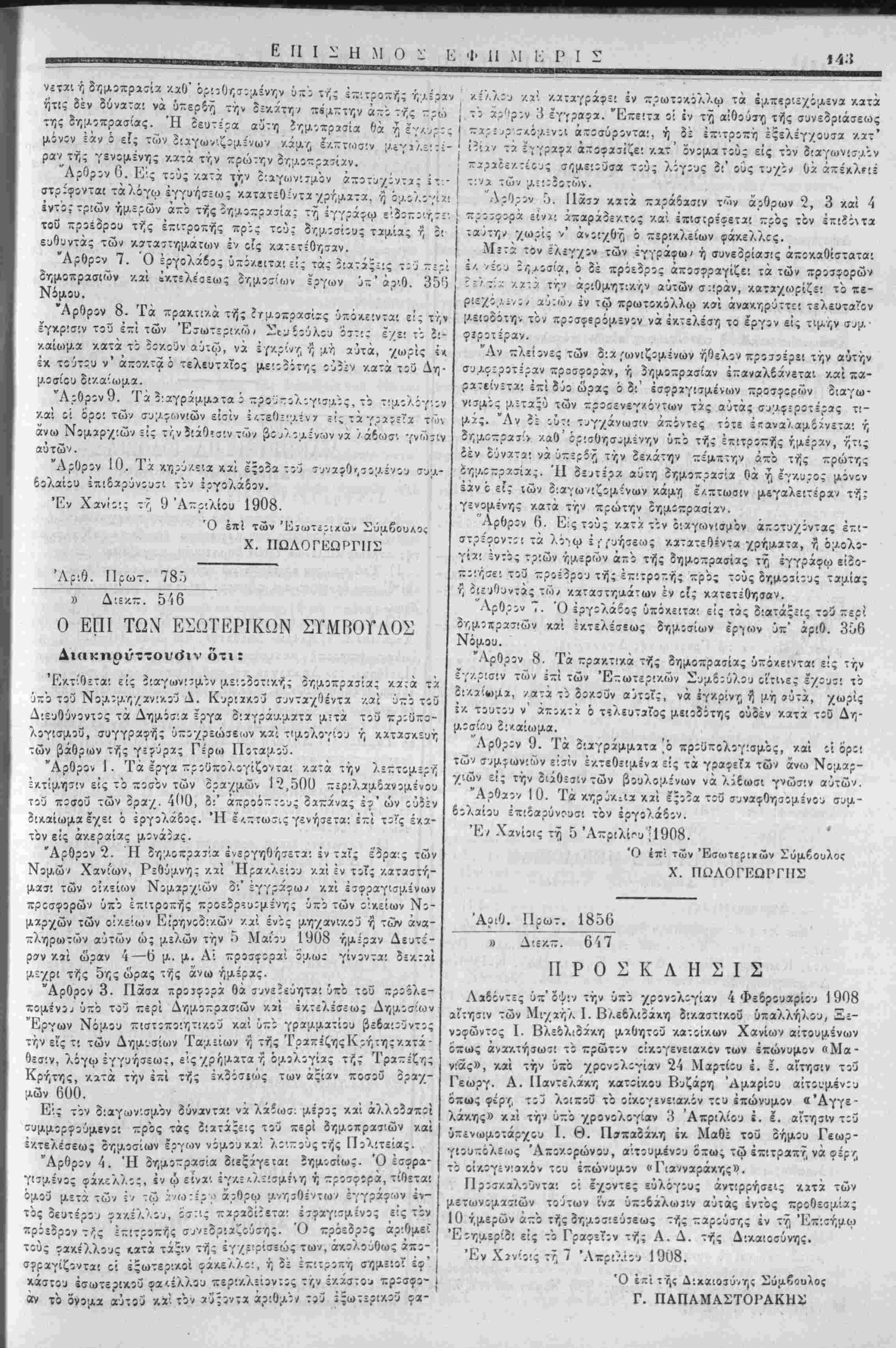 ϊ:σμίνος φάκελλς-ς, έν ώ. εϊκα'. ίγκϊ/.λεισμίνη ή προ·<ρορά, τ'.Οί ται όμοθμετά των έν τω ανωτέρω άρθρω μνηβθέντων εγγράφων ί'τ'ος δίυτέρίΐ) φακέλλου, όστις παραδιδ^ται έσφραγισμένβς είς " ' Ο όδβς άρ·Ο *?Ορίν ίΐ έγγρ..7. παρευρ·.7ΑΟμεν:: ά^5ϊΰ?5ντα·., ή δέ ΐτ.-.-.ρ—.Γ, έςελέγχουσα κατ' ιίιαν τα εγγραφα άζοφίσίζε! κατ' όνομια τούς εί; τόν δ'.αγωνισ- 1*5ν παρα?εκτέ;υς ση;ΑΕ'.5ϋΐα τού; λόγους δι' ούς τυχόν θά άπέ- '-Λειέ τ να των με!5δ;τών. ατόν έλεγχον των εγγράφων /; σ^ν^δριασ!ς α;:ον.ϊ0ιστϋΐται Ούμ*ης. 6) Π;οχήρυ;ις Δτμάρχου Ρο·[8ια;. 7) Γεν. ρή » . Δημο". Ταμίου Κβνδχ.ου κα! 6'. Ταμίου Λαγχά8ος κ^ί 8) Λ έ/, νέου δημισία, Ό δέ τ:ρόεδρ:ς άκςσφραγίζει τα των ττροσφορώνν δελτία κατά την άρ'.Ομητικήν αυτών σϋράν, καταχωριζει τό πϊ- ριεχόμίνΐν αυτών ίν τω πρωτο/,όλλω "/.αί άνακ.ηρύτ-8! τελευταίον μευδότην τϊν προΐφϊρόμίνςν να έκτελϊστ, το έργον είς τιμήν · συμφίρωτέραν. "Αν πλείονες των δίαγωνιζομένων ήθιλον προσφίράΐ την αυ¬ τήν συμφερώτερων πρίίφοράν, ή δ«;μ5ΐ:ρ:σία έπαναλαμ,ίάνετα:. γ.3ΐ ίταρα:είνεΐα! έ;τί ϊΰο ώρα; ό δ:' εσφραγισμέναι ζρΐσφορών ο:αγων;3μ.Ός μεταςύ των ιτρΐσενεγκόντων τάς αύτάς συμΐιρωτέ- ρας τιμάς. Άν 2ε ςύτ:ι τυγχάνωσί άπόντες τότε ίπανΐ)αμ6ά- νετα: ή ϊημο-ρ»σία καθ' ωρισμένην υπό τής έπιτροπής ημέραν ήτις ϊέν δύναται νά ύπερδί, την δεκάτην πέμπτην α~ό τής πρώ· της εηΛθπρασίας. Ή δευτέρα αυτή ίημ3"ρα;ία Οά τ| ί;κυρος μίνιν ίά» ό εί; των διαγωνιζομε'νων χ.άμΤ| ίκπτωσίν μεγαλειτΐ- ρίν τής γενομένης %χτα την πρώτην ζτ,μ.ζτ:ρα<:ία.ν. "Αρ6ρ;ν 6. Είς τούς -/.ατά τϊν δ'.αγο)νίσμϊν άποτυχόντας ί~:- ΐτρίφοντα: τα λόγωίγγυήσεως κατατεθίντα χρήματα, ήόμΐλίγίαι έν τ - ς τριών ημερών ά-ό τής δημ,ίπρασίαις τί) έγγράφψ ε''ο;~οιή- αει τοϋ προέόρου τής έπιτριπή'ς ~ρΌς τοΰς δημ,οσίους ταμίας ή διευθυντάς των καταττημάτων ίν οίς κατετέθησαν. Αρθρον 7. Ο έργολάδος ύτίόκειται είς τάς διατάςεις τοϋ περί δημίπρασιών καί εκτελέσεως δημοσίων έργων ύπ' αριθ. 356 Νόμου. "Αρθρον 8. Τα πρακτι/.α τής δημ.οττρασίας ύπόκ?ινται είς την Ιγνρ!σ;ν τοϋ επί των Έσωτερικών Συμδ^ύλου ό'στ:ς εχϋ τό δ'·- /αίωμα κατά τό 5οκο3ν αυτώ, νά έγ/ρίνΛ, η μή αΰτ3, 7.ωΡ'·ί έκ τούτου ν' αΐΓ:-/.τοί ό τΐλευταΐος μειοδότης ούϊέν κατά τοΰ Δη- μςΐίςυ 2ί"/.αίωμα. Άρθρον ί). Τα δ'.αγράμματα, ό πρ:ΰπολογί3μός, τ'ο τίμίλέ- γιιν καί ο·. ό'ρο'. των συμφωνίών εισίν έ/.τεθειμί'να εις τα γραφίΐα των άνω Νομαρχιών είς τί-,ν διάθεσιν των βίυλομ.ίνων νά λάϊωσι γνώσιν αυτών. "Αρθρον 10. Τα κηρύ/.ίΐα καί Ιςοδα τοθ συναρθησομένΐυ σομ· βΐλαί-ου έπιϊαρύνου;; τΐν εργολάβον. Έν Χανίΐίς τλ,9 ΆτιρΓ/.ίίυ 1908. "Ο ίπί των Έσωτεριχών Σύμβουλος Χ. ΠΟΛΟΓΕΩΡΓΗΣ ΆοιΟ. Πρωτ. 783 » Διε/.τΐ. 544 Ο ΕΠΙ ΤΩΝ ΕΣΩΤΕΡΙΚΩΝ ΣΥΜΒΟΥΛΟΝ τίΐ ότι: Έ·/.τί6ετα: είς διαγωνισμόν μεϋδστιν.ής δημοπρασίας κατά τα ύ~ό τοϋ έργοοηγοΰ Έμμ. Χρίστ.3Ϊου7.ά>·.η συνταχθέντα καί υπό τοδ