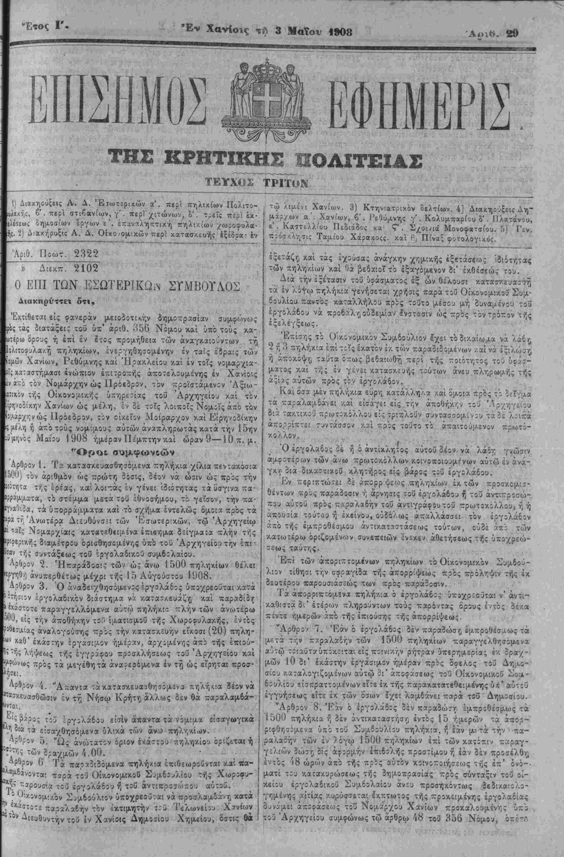 Έν Χανίοις τΛ 3 Μαΐον 1908