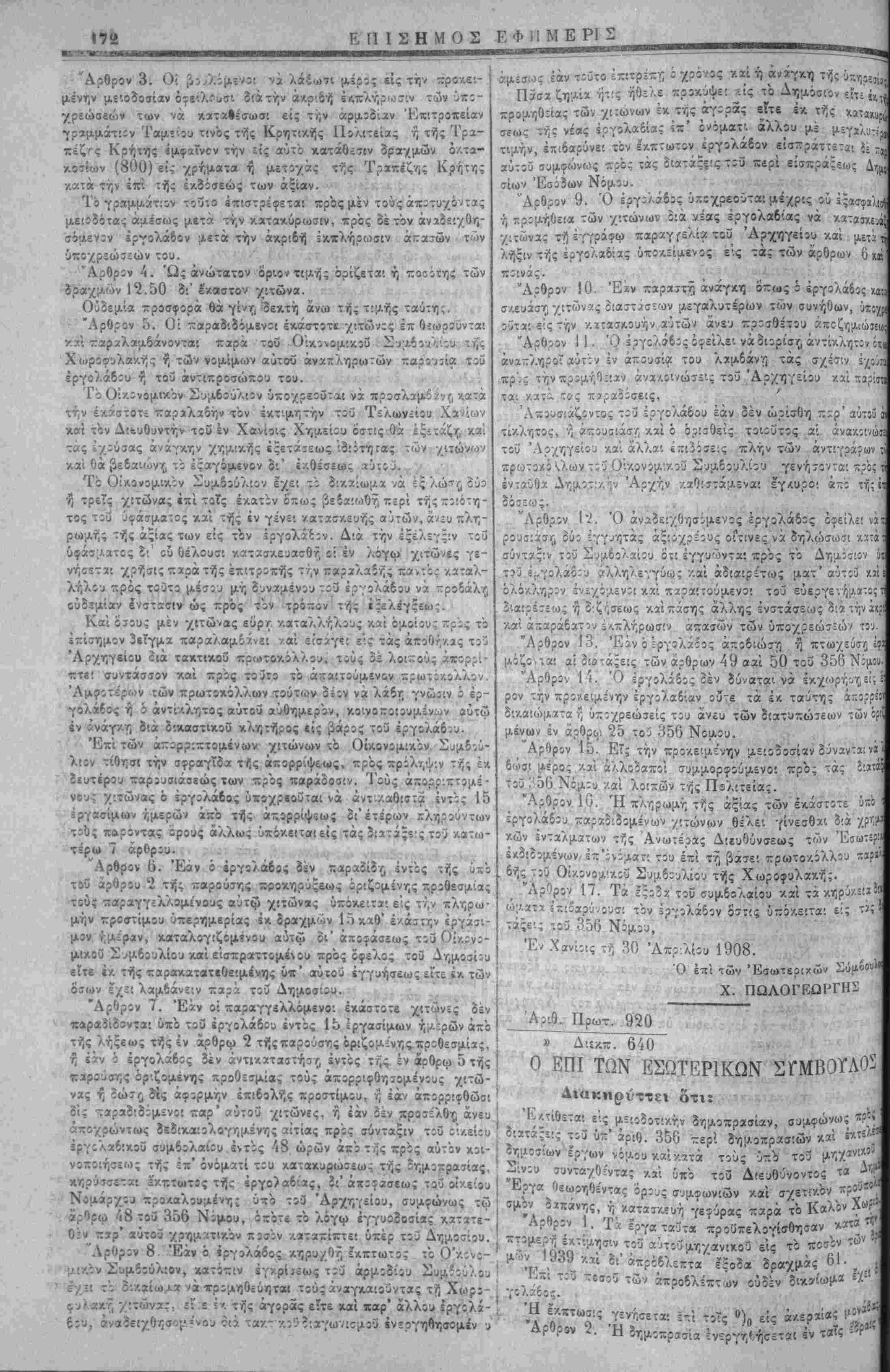 διά ταζ.τ<κ;ϋ -ρωτί'/.όλλου είς τριπλΐΰν υυντασσομ:-ν;υ τα δέ λοιπά «πορρίπτει Γοντάσσον %αί πρός τουτο τ'ο απαιτούμεν^ χρωτό- κολλον, Ό ίργολαδίς οβ ή ό άντίκλητος αϋτοϋ δέον νά λάότ; γνώσιν α;ο.βοτέρο)ν των άνω "ρωτθΆθλλων κοινοποιοομίνων αυτώ έν άνά- γκ/ διά δικαστΐΛοϋ κλητήρος είς βάρος τίΰ ίργολάδου. Εν "ερίπτώ'ει ?έ άπορρ ψεως τΐηληκίων ι* των τ:ροσ·Αομ.!ΐ- θέντων ·Λρός παράδοσίν ή άρνησις τοΰ έργολάδου ί τοΰ άντιττρΐσώ- που αύτοΰ πρός παραλαβήν τοϋ άντιγράφουτοΰ τρωτοκίλλου, ή ή αχουαία τούτου η έχείνου, ουδόλως άπαλλάσσεί τον εργολάβον άπο τής έμπροθέσμου αντικαταστάσεώς τούτων, ουδέ άπϊ των κατωτέρω όριζομένοιν συνεπειών ένεκεν άθετήσεως τής υποχρεώ¬ σεως ταύτης. Επί των άποριπτομένων πηληκίων τό Οικονομικόν Συμβού¬ λιον τίθησι την σφραγίδα τής άπορρίψίως πρός πρόληψιν τής έκ δευτέρου παρουσιάσ:ώς των πρός παράδοσιν. Τα άπορριπτάμϊνα πηλήχια ό έργολάδος ϋποχρεοΰτα: ν' άντι- ■Λαθιστα δι" έτέρων πληρούντων τοϋς παρόντας ορους ίντός δέκα πέντε ημερών ά—ο τής ϊχιούσης τής άπορρίψεω;. Άρθρον 7. Εάν ό έργολάβος δέν παραδώση έμ.προί(έσο.ως τα μετά την παραλαβήν των 1500 πηληκίων παραγγελθησόμενα αύτω το'.αΰταϋπό/.είτα'. είς πΐ'νιν.Γ,ν ρήτραν ύπερημερίας εν. δρα·/- μών 10 δι' εκάστην εργάσιμον ημέραν πρός όφελος τοΰ Δημο¬ σίου καταλογιζομένων αύτω 3ι' αποφάσεως τοΰ ΟΐκΐνομικοΟ Συμ- δουλίου είσκραττομένων ίί':ε έκ, τής παρακατατεθειμένης ΰιέ' αύτοΰ ϊγγυήσϊως είτε ίχ των ό'σων ϊγει λαμδάνεί ιταρά τοΰ Δημοσίου. Άρθρον 8. Εάν ό ίργολάδΐς δέν παραδώΐτ. έμπροθέσμως τα 1500 πηλήκί» ?, δέν άντικαταστήστ, έντ'ος 15 ημερών τα ατιορ- ριφθησόμενα υπό τοΰ Συΐλβουλίου πηλήκια, η εάν μ; τα την πα¬ ραλαβήν των ίν λόγω 1500 πηληκίων επί των κατόπιν παραγ- γίλιών ϊώΐτ, δΐς αφορμήν έπιβολής προστίμου ή εάν δέν προσαλθν>