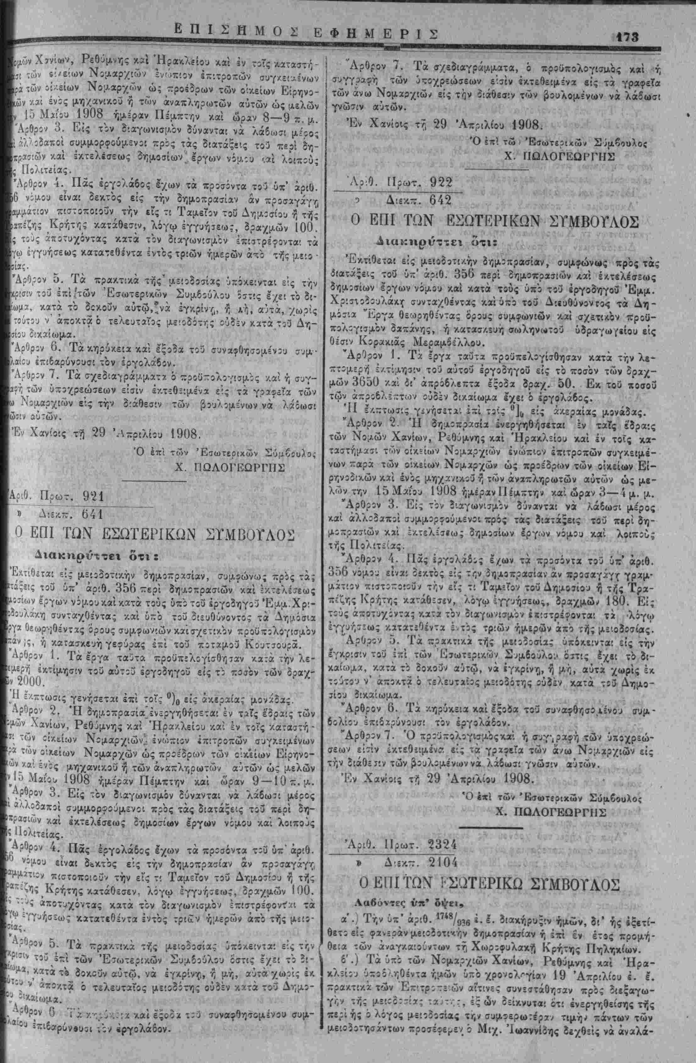 ίρηνοοάην Χανίων ώς μέλη, έν δέ τοις λοιποϊς ΝομοΤς άπ'ο τόν