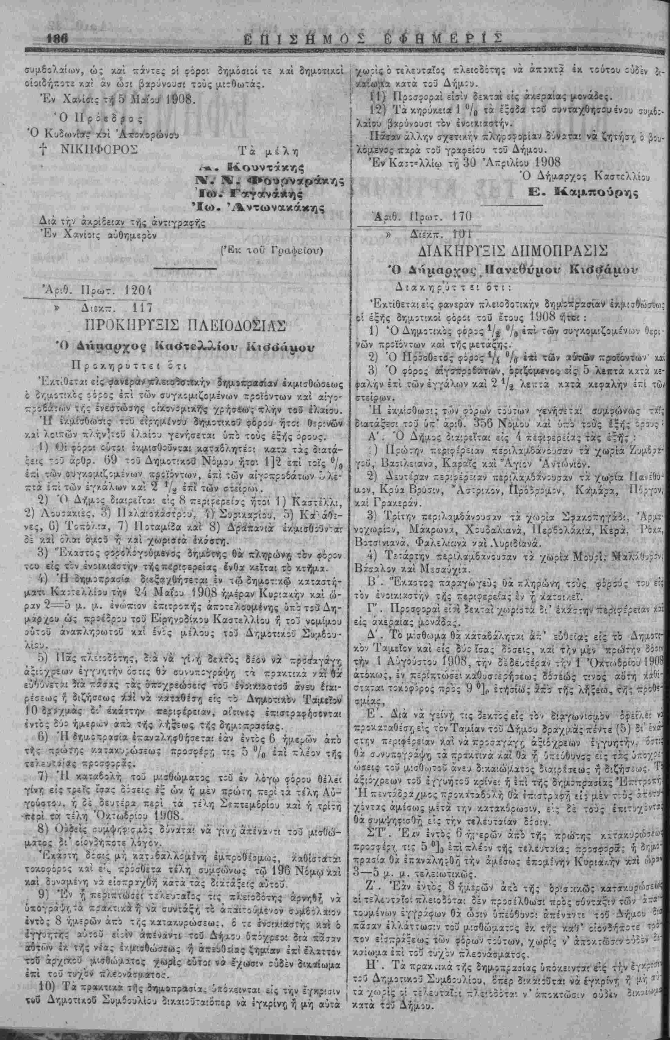 Ιιτροπ£''αι; Χαν'ων. 3) Δίαχηρύξεΐς Δημάρχων α'. Καστελλίου