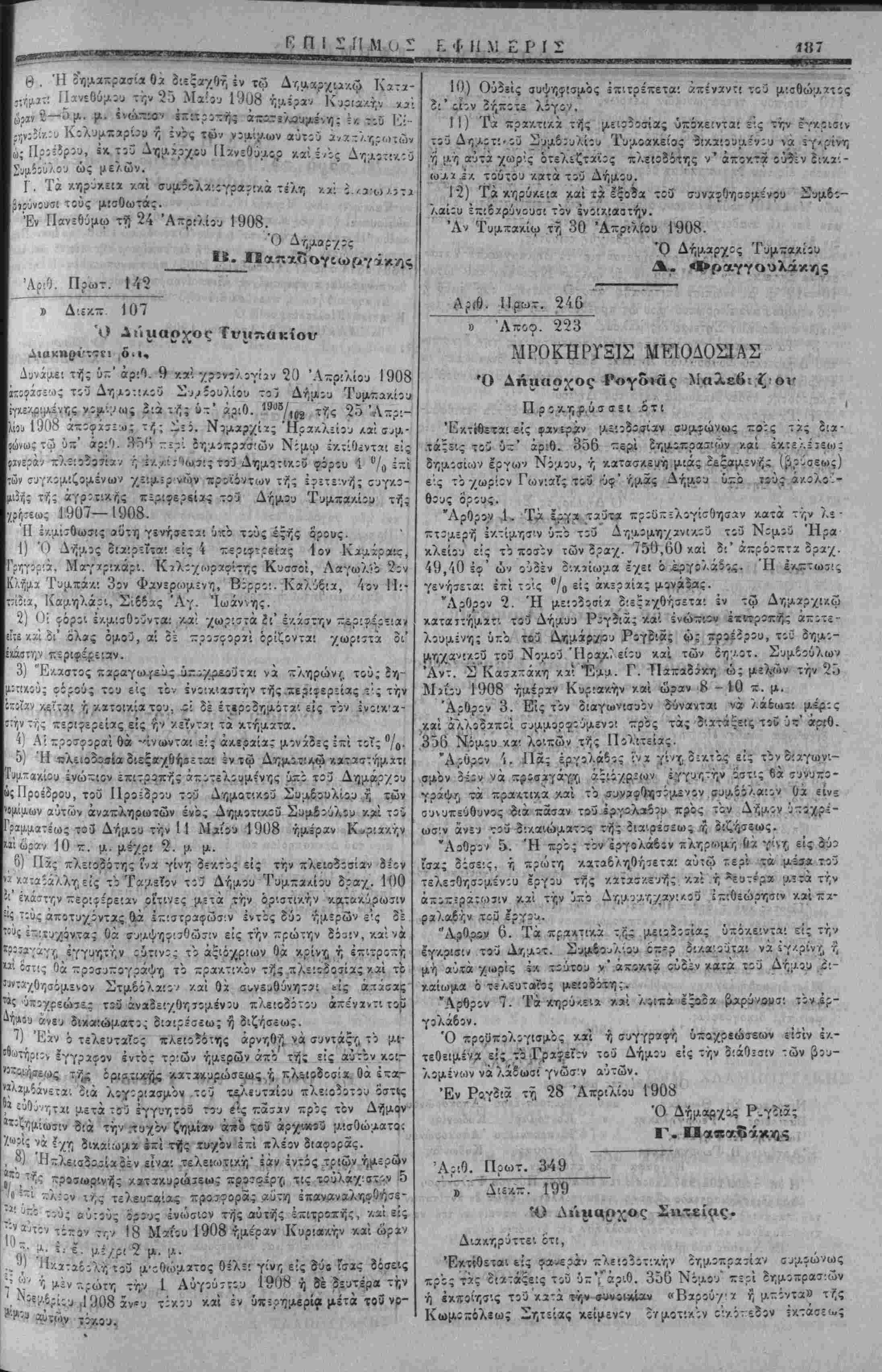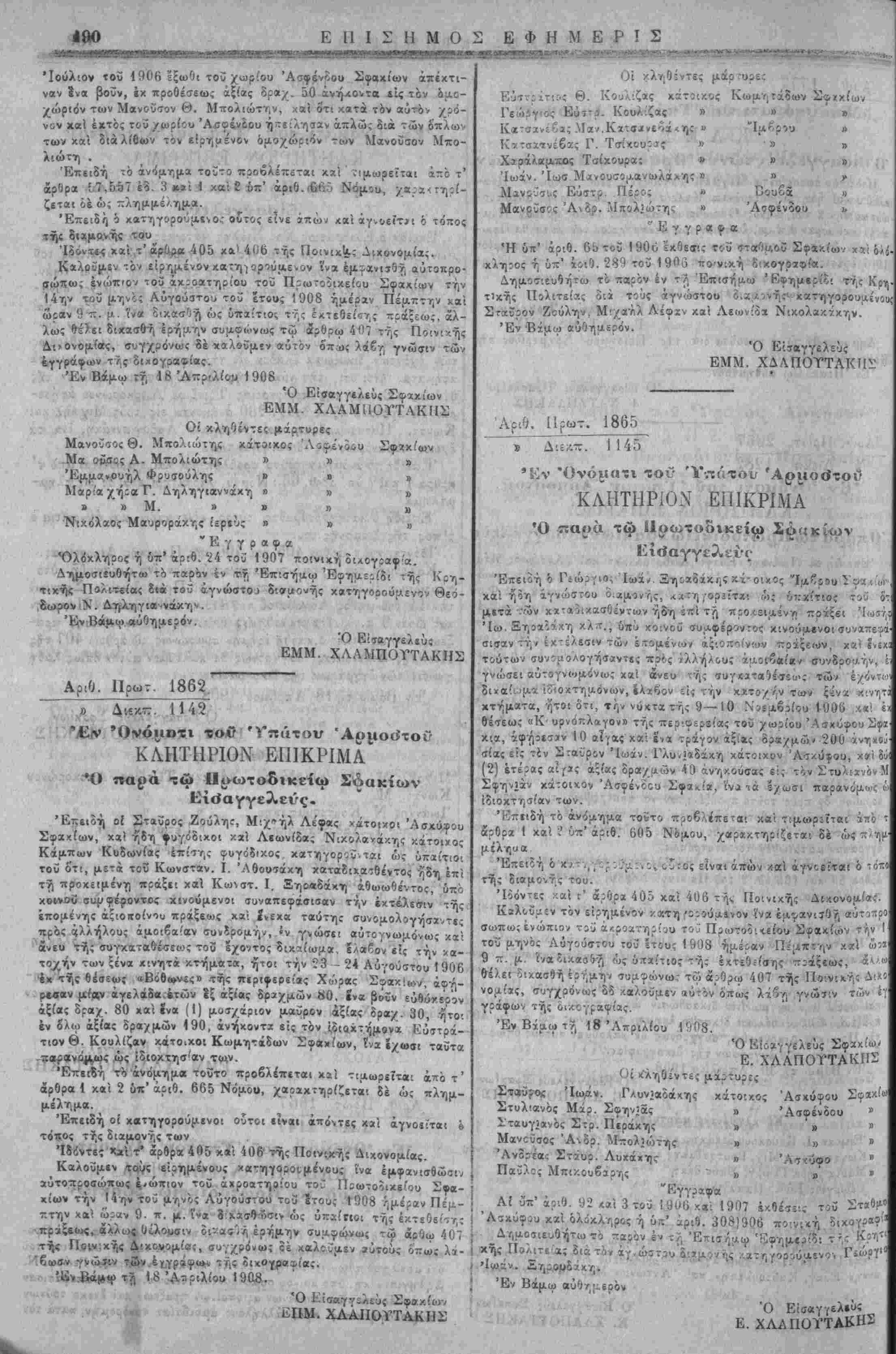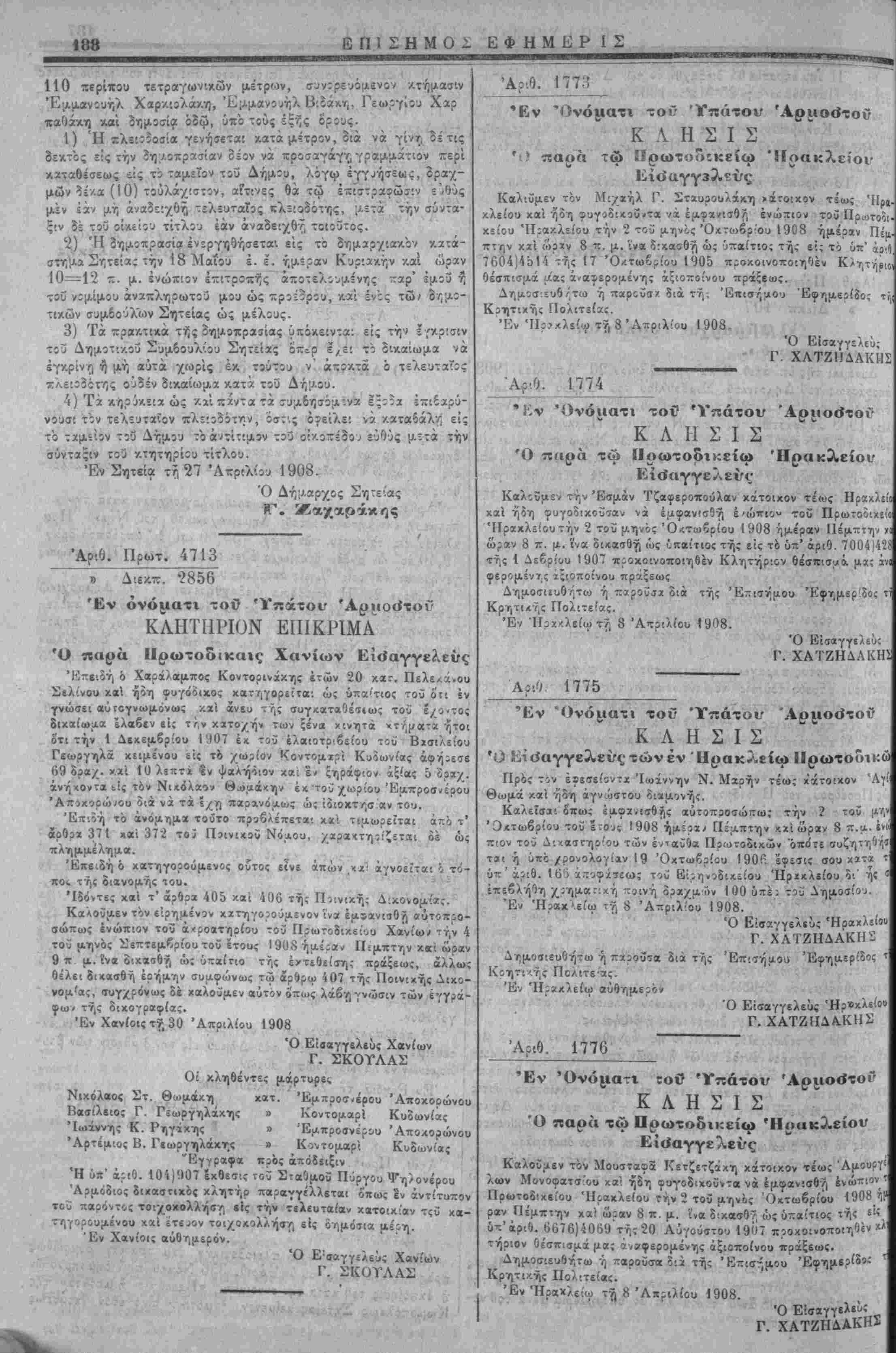 τοΰ 1/οντος διχχίιομα ίοιο<τηαονος ξένα: χ'.νητά χτη- αρθρα Ι χ.%ι 2 6τ' ί-ίθ. 6^5 Νόμου, /«ρχχτηοίζετζι 8έ ώς π/ημ- έλ " μ^ 'Ε"ει5ή ό χαΓηγορούμίνος όντος είναι άπών χαϊ άγνοβίτα; ό τό-' πο: ι ?,£ -ΐ.αμοντις τού. Ίίο.τες χ.-ϊ τ'άοθρα 405 χ»ί 406 τής ΠοΓνήίήί'ΔιχονΌ'μΓα-. Κ·ϋλο0α.!ν τον ε?ρϊ;αένον χαττ|γορούμενον 'ινα έμφ«νισβ/ϊ αύτο- πιοιώτυυ; ι ώπΐίν τοΰ*άκ:οατηρίου τοΰ Πρω'θδιχείου Σφ»χ'ων την ! 4 -ο; μηνό; Αύγΐύστου τοί Ιτους 1908 ημέραν Πέμπτην χαί ώραν 9 -.μ. ίνα διχαίβ/) ώς υπαίτιος τής έχτί&βίοης ττρίΐίωί·, άλλως Ι ϋέ/>5: Βιχαοθή έρήμην βυμφώνιος τώ ά;θρω 407 τής Ποινιχής Δι-