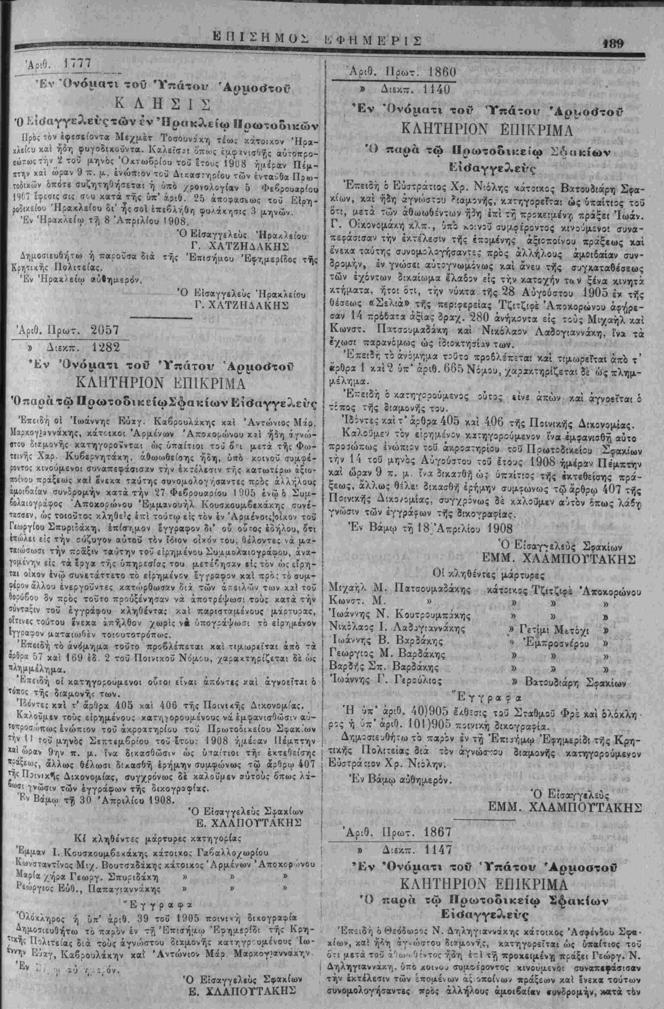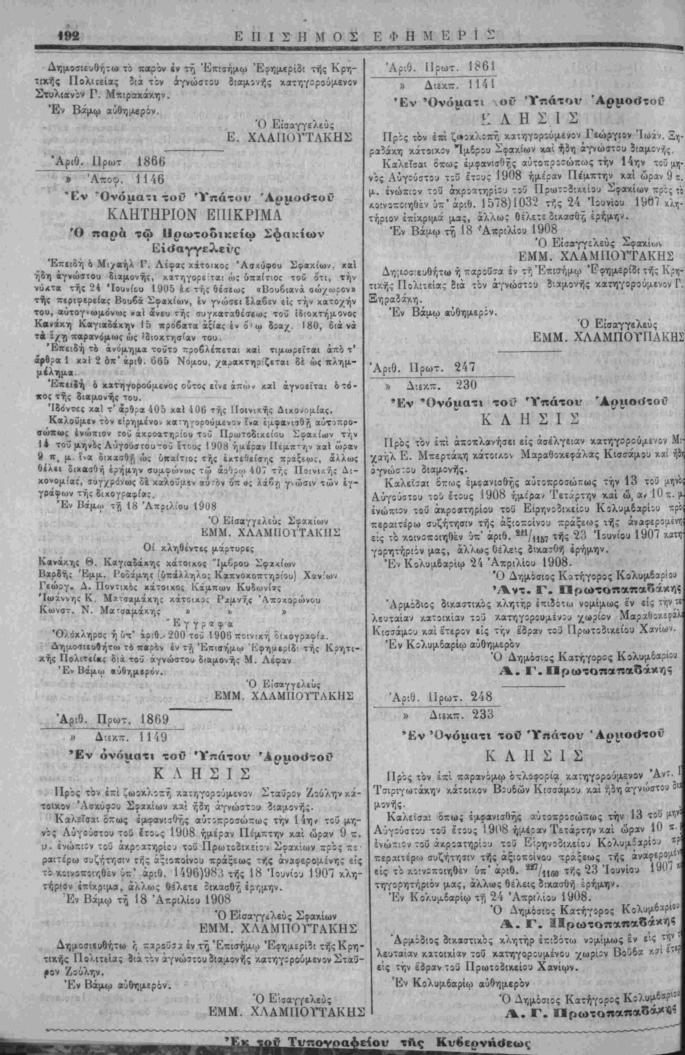 Έν Όνόματι ,οΐί Ύπάτον Άρμο<ίτοΰ Κ Λ Η Σ Ι Σ Πρϊς τόν επί ζ«§5κλ:πτ, κατηγοριύμενον Γεώργιον Ιωάν. Ξη· αΒάκη κάτοικον Ίμδρου Σφακίων καί ήδη αγνώστου διαμονής. Καλεΐσαι όπως εμφανισθή αυτοπροσώπως την 14ην τοΰ μη· ος Αύγΐύστου τ;ΰ ετ:υς 1908 τ^αν Πέμπτην καί ώραν 9 χ. ,. ενώπιον τού άκρίατηρίίυ τοΰ Πρωτίδί/.ίίου Σφακίων πρός το ο-.νοποιηθέν υπ' άριδ. 1578)1035 τής 24 Ίουνίου 1967 χ/,η- ήΐιον έπίκριμα μας, άλλως θίλετε δαασθγ, ίρήμην. ' Έν Βάμω τή 18 Απριλίου 1908 Ό Εισαγγελεύς Σφακίων ΕΜΜ. ΧΛΑΜΠΟΥΤΑΚΗΣ Δημοσιευθήτω ή ζαροΰ^α έν τή'Επισήμω Εφημερίδι τής Κρη- ι·/.ής Πολ:;είας διά τόν αγνώστου δ'.αμονής κατηγορούμενον Γ. Ξηραδάκ,η. Έν Βάμω αυθημερόν. Ό Εισαγγελεύς ΕΜΜ. ΧΛΑΜΠΟΥΠΑΚΗΣ Αριθ. ΙΙρωτ. 1861 Αριθ. Πρωτ. 247 » Διεκ-. 230 Έν "Ονόματι τοΰ Ύπάτον 'Δρμοο*τού Κ Λ Η Σ Ι Σ Πρός τόν επί άποπλανήσε! είς άσέλγβιαν κατηγορού^ϊνον Μι¬ χαήλ Ε. Μπερτάκη κάτοίλον Μαραθοκεφάλας Κισσάμου /.αί ήίΐ] 'γνώστου διαμονής. Καλεϊσαι όπως έμφανισθής αΰτοπροσώίτως την 13 τοϋ μηνοι Αΰγούστου τοθ Ιτους 1908 ημέραι Τετάρτην καί ώ, α* 10 —. μ ενώπιον τοϋ άκροατηρίου τοΰ Είρηνοδικείου Κίλυμδαρίου προι περαιτέρω συζήτησιν τής άξιοποίνου πράξεως χής άνβφερομβνη εις τό κοινοπίΐηθέν ϋπ' αριθ. 8ί1/ιι&7 τή? ^3 Ίουνίου 1907----- γορητήριόν μας, άλλως Οέλεις δικασθή έρήμην. Έν Κολυμδαρίω 24 Απριλίου 1908. Ό Δημόσιος Κατήγορος Κολυμδαρίου Άντ. Γ. Ηρωτοπαπαδάκηί Άρμόδιος ίιχαστικός κλητήρ Ιπιδόχω νομίμως έν είς ττ,ν«| λευταίαν -/.ατοικίαν -ου 7.ατηγορβυμ.ίνου χωρίον ΜαραθοκεφΛΙ Κΐσσάμου καί έτερον είς την έδραν τοΰ Πρωτοδικείου Χανίων. Έν Κολυμδαρίω αυθημερόν Ό Δημόσιος Κατήγορΐς Κολυμδαρίθϋ Α. Γ. Πρωτοπαπαδάκης Αριθ. Πρωτ. 248 » Διεκ,π. 233 Έν Όνόματι τον Ύπάτον ' Κ Λ II Σ Ι Σ Πρός τόν επί παρανόμω ό^λοφορία ζ,ατηγοροΰμενον Άντ. 1 Τσιρίγο)τάκην κάτοιν.ον Β;υ6ών Κισσάμου καί ήδη αγνώστου β» νής· Καλείσαι όπως έμφανισθής α-ύτοχροσώπως τήν 13 τοΰ μ·*Ίνί Αύγούστου τοϋ ετους 1908 ημέραν Τετάρτην καί ώραν 10 '■ ένώ-ιον τοΰ άκροατηρίου τοϋ Ε'ιρηνοΒιν.ίίοο Κολυμβαρίου π? περαιτέρω συζήτησιν τής αξιοποίνου -τράςεως τής άναφερο-*5" είς τό ν.οινοποιηθέν ΰπ' αριθ. 2Ϊ7/116Ο τής 23 Ίουνίου 1907 * τηγορητήριόν μας, άλλως θέλεις δικασθή έρήμην. Έν Κολυμδαρίω τυ] 24 Απριλίου 1908. Ό Δημόσιος Κατήγορος Κολυμβά"! Α. Γ. ΙΙρωτοπαπαδάκηί Άρμόδιος δ'.καστικός κλητήρ ίπιδότο) νομίμως έν εις τη» 1 λευταίαν κατοικίαν τοϋ κατηγορουμένου χωρίον Βοϋδα /.'ί ί*°'| εις τήν έ'ίραν τοϋ Πρωτοδικείου Χανίων. Εν Κολυμδαρίω αυθημερόν Ό Δημόσιος Κατήγορος Κολυμδ«Ρί3| Α. Γ. ΠρωτοπαπαδάκΐίΓ