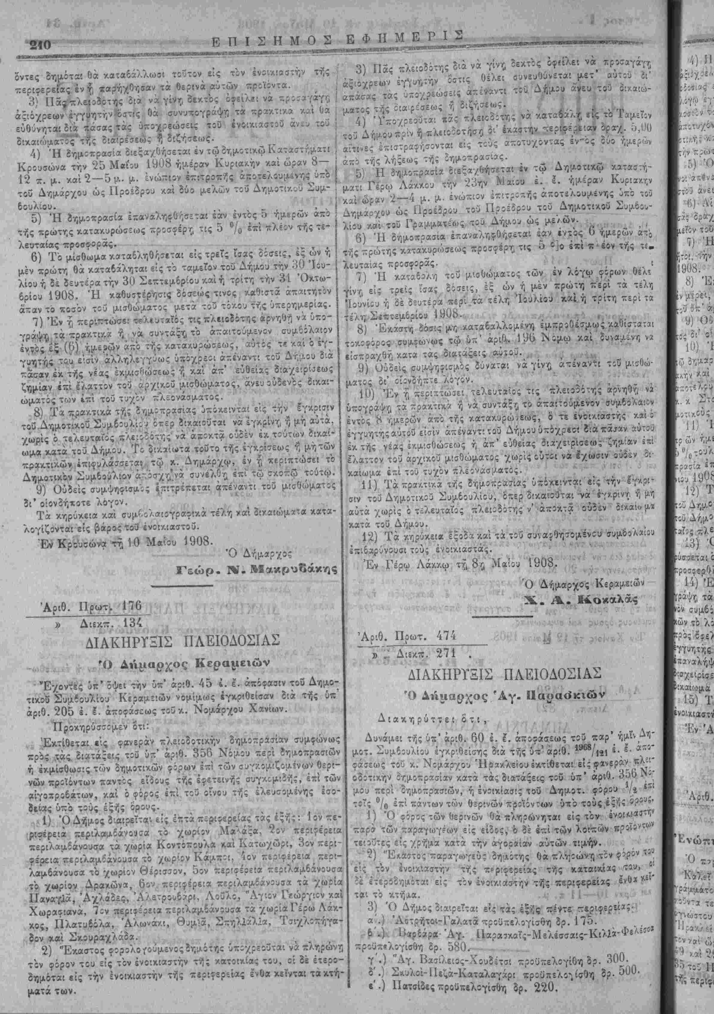1) Διακηι>νξεις: α. τρείς Δήμαρχον Χανίων, 6'. Δημάρχου