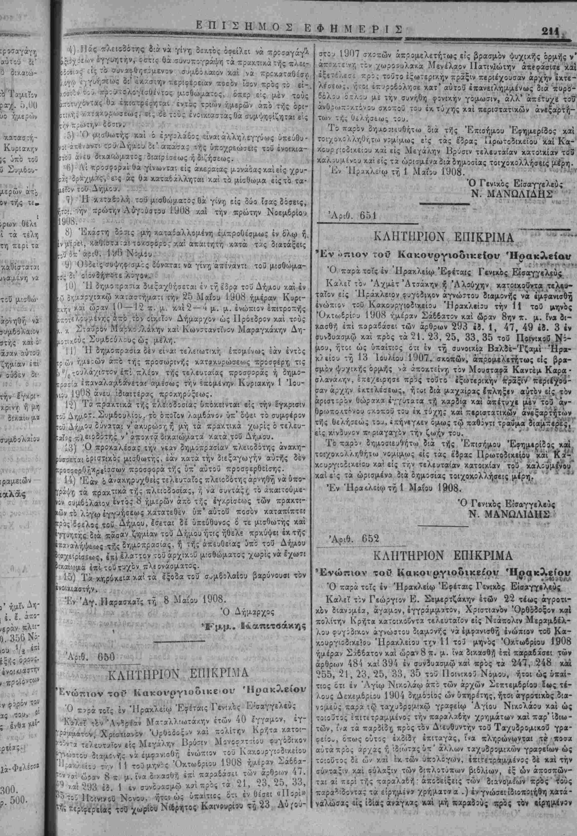 τοΰ χ,αλουμένου είς τα ωρισμένα διά δημοσίας τοιχβκίλλή«ι< μέρη. Έν Ήρα*λείφ τή 1 Μαίου 1908. Ό ΓενιχΌς Ν. ΜΑΝΩΛΙΔΣ. Εκ τοθ Τνπογοα^είοΐ'