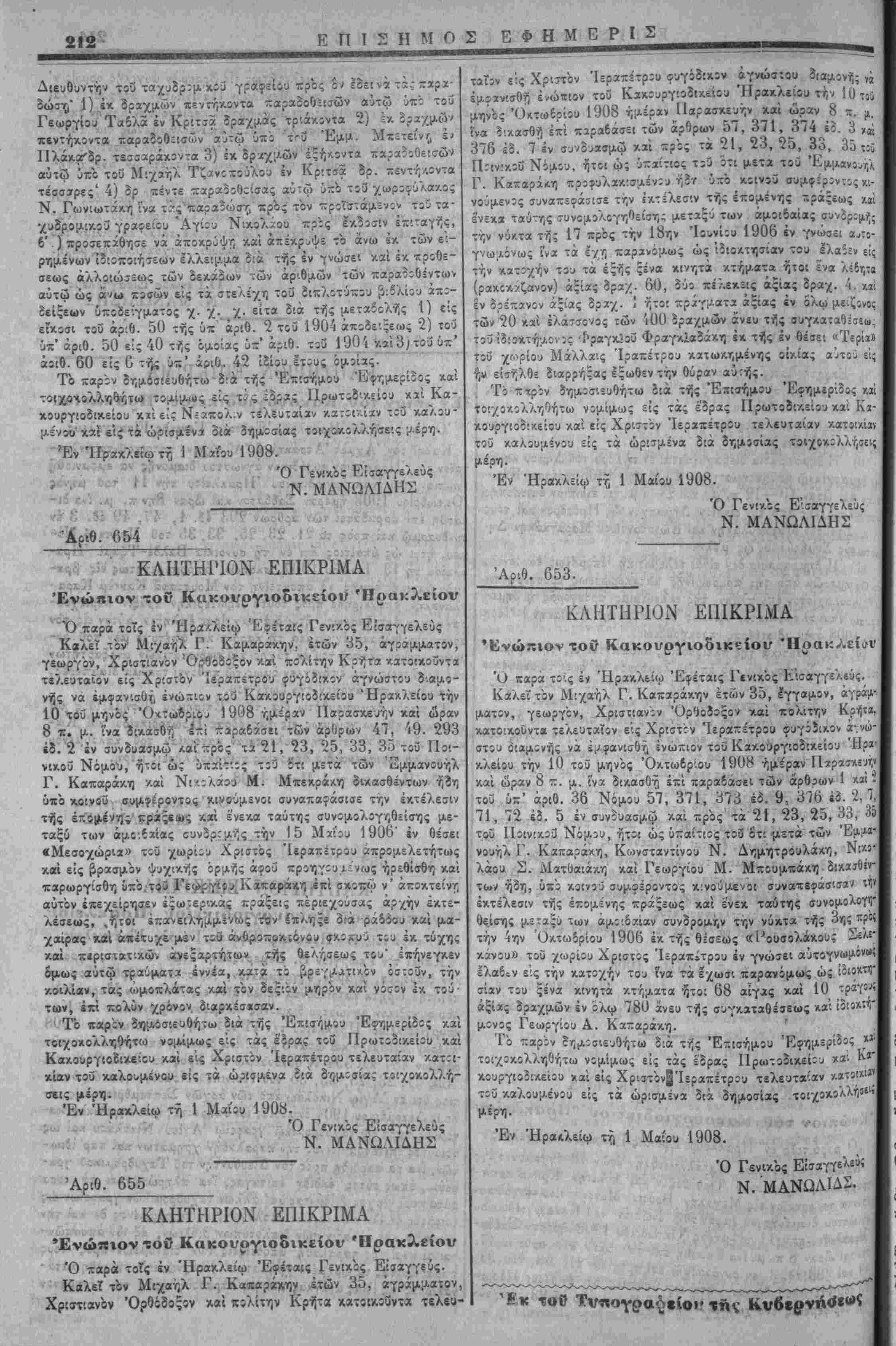στ;.< 1907 σκ:ζών απ,υμελετήτως είς βρασμόν ψυχικής όρμής ν' των τ/;ς 0ϊλ(|ΐ4ως τού. με την συντ,θη φ;νικήν γομωσιν, άλλ' άπέτυχε τού" υ σκοττοΰ τού ίκτύ/ης κ»ί περιστατ'-κών άνίζαρτή- καλ-υμίνο^ /.αίίίς τα ωρισμένα διά δημοσίας τοιχοκολλήσβίς μέ"ρη Έν Ήρ^λε-ω τί, 1 Μαΐ-,υ 1908. "«1 Ό Γενΐκός Εισαγγελεύς Ν. ΜΑΝΩΛΙΔΗΣ Αριθ. 651 ΚΛΗΤΗΡΙΟΝ ΕΠΙΚΡΙΜΑ -""*·*··· Έν «πιον τοϋ Κακονργιοδχκείου Ηρακλειον Ό παρα τοΤς έν Ηρακλείω Έφέταις Γ«.νικος Εισαγγελεύς. Καλεϊ τόν Αχμέτ Άτσάκην ή Άλούχην κατοικοΰντίτ τελ^ιί- Γον είς Ηρακλειον φϋγοδικον αγνώστου δίαμονής νά εμφανισθή ταΤ ς φ γ μής μφή ενώπιον τοΰ Κακουργιοδ'.χείθΛ Ήρακ/.«ί;υ την 11 τοθ μηνός ρΓυ 1908 ημέραν Σάββατον καί ώραν 8ην 1Ε. μ. ?να ίι- *ασθή επί παραβάσει των άρθρων 293 έδ. 1, 47, 49 β'8. 3 έν Συνδυασμώ καί πρός τα 21. 23, 25, 33, 35 τοϋ ΠοΐνικοΟ^ό- μου, ήτοι ώ; ύπαίτιος ότι έν τή συνοικία Βαλδέ-Τζαμί Ήρα- κ/είου τΫ) 13 Ιουλίου 1907, σκοτίων, άπρομελετήτως είς βρα¬ σμόν ψυ-/!)·.ής όρμής ά άποκτείντ, τον Μουσταφά Κανΐέμ Καρά · σλανά/.ην, επεχείρησε πρός το3το έξωτερικήν' πρΙιξΓν' Ιζεριί^Ι- σαν αρχήν ί«.τϊλέσεως, ή:*ι διά μαχαίρας έπληξεν αυτόν είς τόν άριστ:ρόν Οώρα/.α έγγυτατα τή καρδια καί άπέτυχε μέν τΌ3'άν- Ορωπολτ'-νου ο·/οτ:οϋ τ3υ ίκ τύχης χαί περιατιώ άξρτή"ώ ο·/.οτ:οϋ τ3υ ίκ τύχης χαί περιστατικών άνβξαρτή"τών τής θελήσεως τ3.ι, ίπήνεγ*εν όμως τώ παθίντί τραδμα δίαί*πεβές^Τ είς κ·ν3υνΐν π·ριαγαγϊν την ζωήν τού. τοιχο/.ο κουργιοδικείίυ κα! είς την τελευταίαν κατοικίαν τού καλούμίν'ί καίε'·ς τα ωρισμένα διά δημοσίας τοιχοκολλήσεις μίρή.' ' ν '** Έν Ήρα*λείφτϊ]| Μαίου 1908. Ό Γενικος Είσαγγελεΐς Ν. ΜΑΝΩΛΙΔΗΣ Αριθ. 652 ΚΛΗΤΗΡΙΟΝ ΕΠΙΚΡΙΜΑ Ενώπιον τοθ Κακοΐ ργιο&ικείον 'Ι^οακλείον Ό παρα τοίς έν Ήρακλείφ Έφέταις Γενικός Εισαγγελεύς. Καλεΐ τ:ν Γεώργιον Ε. Σεμερτζάκην έτών 22 τέως άγροτι- κόν Βιαν^μέα, άγαμον, έγγράμμΐτον, Χριστιανόν "Ορθόδοξον καί πολίτην Κρήτα κατοιν.οθντα τελευταίον είς Νεάπολιν Μεραμβέλ¬ λου 5ογ:δικιν αγνώστου διαμονής νά εμφανισθή ενώπιον τοδ Κα~ κοιιργι-ίικεΐβυ Ηρακλείου ττν 11 το3 μηνός Όκτωβρίου 1908 ημέραν Σάββατον καί ώραν 8 π. μ. ίνα δικασθή επί παραβάσει των άρθρων 484 καί 394 έν συνδυασμώ *αί πρός τα 247, 248 καΐ 255, 21, 23, 25, 33, 35 τοΰ Ιΐοΐνικοΰ Νόμον, ήτοι ώς ΰπαί- τιος ότι έν Άγίψ Νικολάω άπϊ των άρχών Σεπτεμβρίου Ιως τέ- λους Δεκεμβριΐυ 1904 δημόίίος ών ύπηρέτης, ήτοι άγροτικος δια- νίμεϋς ζαρα ιω ταχοϊρομικω γραφείω Άγίου Νικολάου καί ώς τοιούτος επιτετραμμένος την παραλαβήν χρημάτων καί παρ'Ίίιω- τών, Γ/α τα παρϊίδτ; πρός τόν Διευθυντήν τοθ Ταχυϊρομικοα γρα- φείο-, ο-ως ούτις έ/.δίδτ έπιταγάς, ί'να πληρώνωνται τέ *οσ« αύτάπρΌς αρχάς ή ιδιώτας ύπ' ά'λλων ταχυδρομίλών γραφείων ώς τουΰτο: δέ ώ/ καί έκ των ύπολόγων, «πιτετραμ·μ.ένος δέ καί την σύνταςν /,α'ι ιύλαξιν των διπλοτύπων βιδλίων, έξ ών άποσπών- τα·. αί -περΐ τής παραλάβη- άποϊείξεις των δΐανομέών πρός ΐούς παρα^'-δοντας τα είρημΐν» χρήμ.ατ'ϊα .) έν γνώσει ϊδιοπίΐήθη κατά- ναλώσας εις ιδία; άνίγκας κ« μή παραδίθς πρός τόν βΐρημ.έν5»