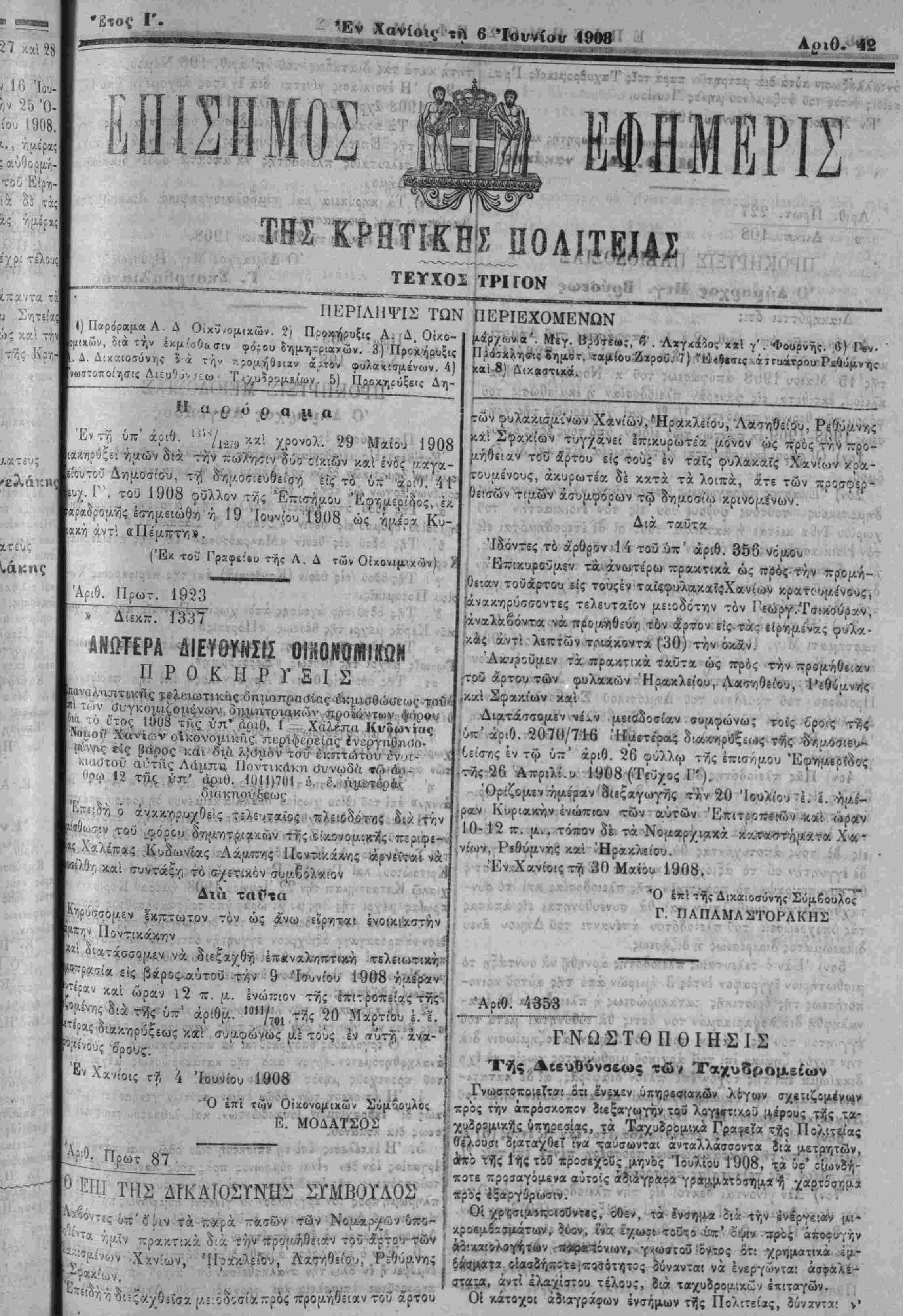 ,ρ«ν Κυριακήν ένώπί&ν <πΰν α'/τών Έ«ιτ|Κίτί#(ών-κ*ί ώραν •10-12 -π. (ΐ.. τόιτον δέ τα .Νομζρχιακά κ^ΛίβΜί'ό^ίατ'α Χ^' , Ρεθύμνης /.αί Ηρακλείου. ,ΈνχΧαντοιςτϊϊ 30 Μ*ίου 1908. Ό επ! τ^ςΔικαιοσόνης Σύμβουλος Γ ΠΑΠΑΜΑΣΤΟΡΑΚΗΣ άν . '4β5'3 ,' ^ΝΩδΤΘΠΟΙΗ-ΣΙΣ Τής διευθύνσεως τω/ Ταχυδρομείων ΓνωβτοκοΐίΪΜΐ ό'τι^εκ'ν .υπηρίσια^ών λόγ«ν σχεΐιζομε'νων έπΐ τϋν Οϊχονομιχων ΣΙυμζονλοί Ι, πρός την άπρόσκοπον διεξαγωγήν τήϋ λβγ|ε;τ:ιι>9.υ ^ίρους τής τ,α-