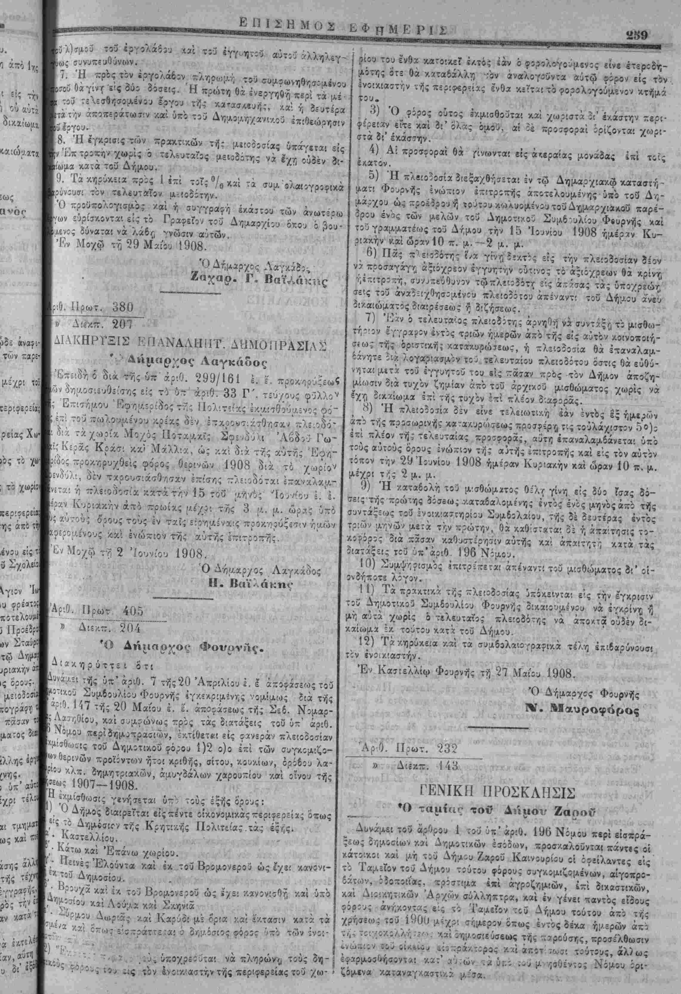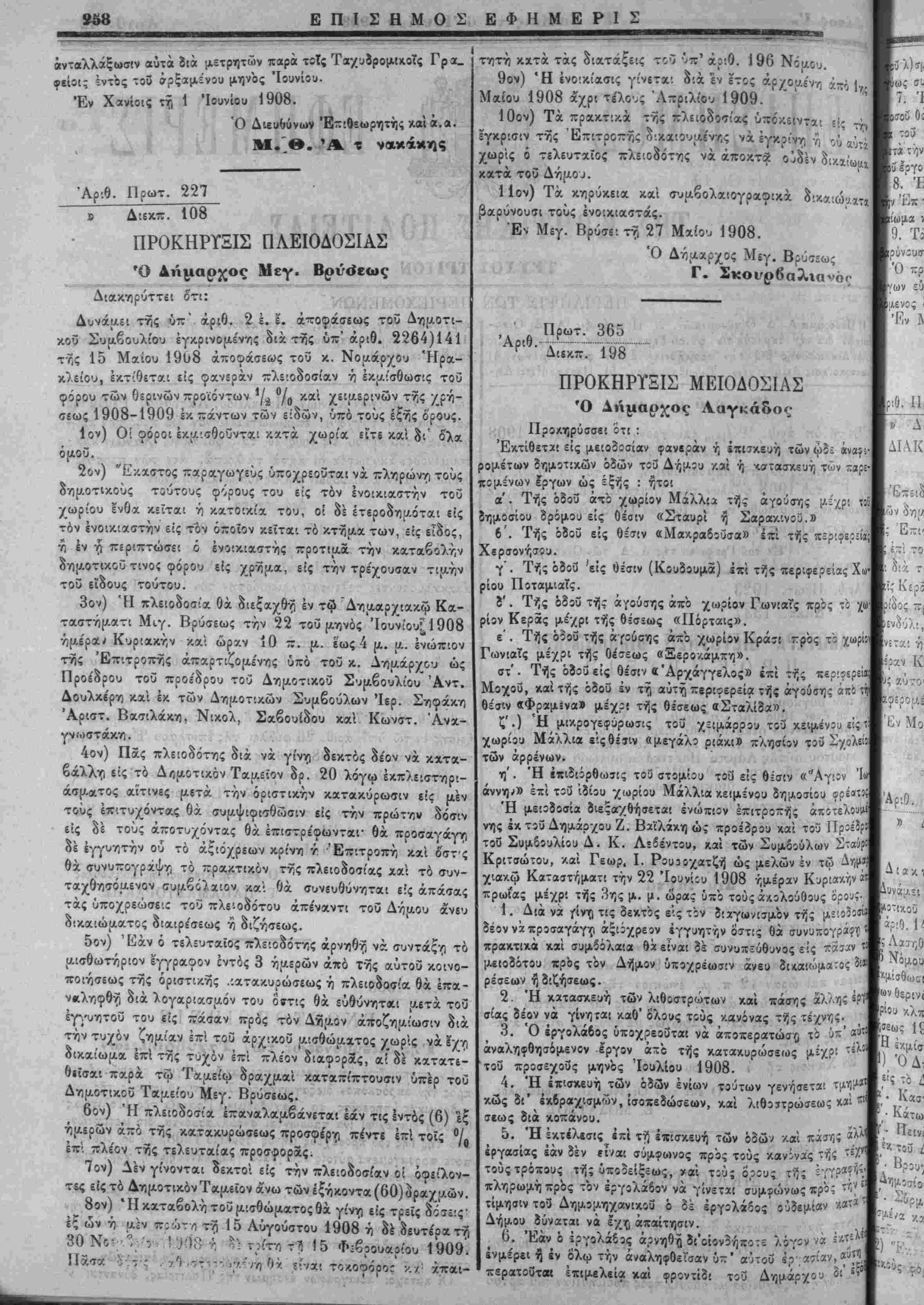 Ιον) Οί φόροι έκ[Λ!<ϊθοϋνται κατά χωρία είτε καί οι' δλα όμοΰ. 2ον) Έκαστος παραγωγεύς ύποχρεοΰται νά πληρώνη τούς δημοτικούς τούτους φόρους τού είς τόν ένοικ,'.αστήν τοΰ χωρίου ένθα κείται ή κατοικία τού, οί δέ έτεροδηριόται είς τόν ένοικιαστήν είς τόν οποίον κείται τό κ,τηρια των, είς ειδος, η έν $ περιπτώσει ό ενοικιαστάς προτιμα την καταβολήν δημ,οτικοΰ τινος φόρου είς χρημα, είς την τρέχουσαν τιμήν τοΰ εΐδους τούτου. 3ον) Ή πλειοδοσία θά διεξαχθή έν τώ Δηααρχιακω Κα¬ ταστήματι Μιγ. Βρύσεως την 22 τοΰ μηνός Ίουνίου[1908 ημέραι Κυριακην κ,αί ώραν 10 π. μ. έ'ως 4 μ. μ. ενώπιον της Έπιτροπτ,ς άπαρτιζομέννις υπό τοΰ κ,. Λημάρχου ώς Προέδρου τοϋ προέδρου τοϋ Δημοτικοΰ Συμβουλίου Άντ. Δουλκ,ε'ρη καί έκ. των Δημοτικήν Συμβούλιον Ίερ. Σηφάκη Άριστ. Βασιλάκη, Νικολ, Σαβουίδου καί Κωνστ. "Ανα¬ γνωστάκη . 4ον) Πας πλειοδότης διά νά γίνη δεκτός δέον νά κατα- βάλλη είς τό Δ/ιμοτικόν Ταμείον δρ. 20 λόγω έκ,πΛειστνιρι- άσματος αΐτινες μετά την οριστικήν κατακ,ύρωσιν είς μέν τοΰς έπιτυχόντας θά συμψιφισθωσιν είς τ·ήν πρώτην δόσιν - είς δέ τούς άποτυχόντας θά έπιστρέφωνται· θά προσαγάγη δέ ίγγυτιτήν ού τό άςιόχρεων κρίνη τ Έπιτροπη κζί δστς θά. συνυπογρχψγ) τό ~ρα.;ιτικόν της πλειοδοσίχς χαί τό συν- ταχθησόΐΑενον συμβόΐχιον κα'ι θά συνευθύνηται είς απάσας τάς ΰποχρεώσεΐί τοϋ πλειοδότου άπέναντι τού Δήιχ,ου άνευ δικαιώματος διαιρί'σεως Ϋ) διζησεως. 5ον) Εάν ό τελίυταϊος πλειοδότης αρνηθή ν~ συντάξν) τό [λΐσθωττιριον έγγραφον εντός 3 ημερών άπό τ-ης αύτοδ κοινο- ποιησεως τνϊς οριστικάς .:χτακυρώσ£ως ή πλειοδοσία θά έπα- θ δά ,χρι τέλθ'^ς Απριλ ΙΟον) Τα πρακτικ,ά τϊίς πλειοδοσίας ύπόκίΐντα: έγκρισιν της Έπιτροπτ,ς δικχιουαένης νά έγκρίντ, η χωρίς ό τελευτχΐος πλειοδότης νά άποκτ* ουδέν δ κχτά τοΰ Δήμοϋ. 1 Ιον) Τα κηρυκειχ καί συμβολαιογραφικά βαρύνουσι τούς ενοικιαστάς. Έν Μεγ. Βρύσε: τΫ, 27 Μαίου 1908. Ό Δημχρχος Μεγ. Γ Σ Ί* ού ρ Γ. , Πρωτ. 365 ΑΡ«Θ· λ-----" 198 ΠΡΟΚΗΡΥΞΙΣ ΜΕΙΟΔΟΣΙΑΣ Ό Δήμαρ^ος Λαγκάδος· Προκηρύσσει ότι : Έκτίθετχ! είς μειοδΐσίαν φανεράν ή έπιτκευή τώνώί: ρομέτων δημοτίκών όδών τοΰ Δήμίυ /.αί ή -«ττασκευή των ~αμ- ιΐομένων Ιργων ώς εξής : ήτοι λ . Τής όδοΰ άπό χωρίον Μάλλία τής αγούσης μςχρι δημοσίου δρόμου είς θέσιν «Σταυρί ή Σαρα/.ινο3.» δ'. Τής όδοΰ είς θέσιν «Μακραδοΰσα» επί τής π;?!?5::ία; Χερσόνησον. γ". Τής όδοΰ 'είς θέσιν (Κουδουμα) επί τής περιφερείας Χω ρίου ΠοταμιαΤς. ϊ'. Τής ό8οΰ τής αγούσης άπό χωρίον ΓωνιαΤς πρός το χβ ρίον Κερας μέ'/ρί τής θέσεως «Πόρταις». ε'. Τής όδοΰ τής αγούσης άπό χωρίον Κράσι ττρός τ; χωρία Γωνιαΐς μέχρι τής θέσεως «Ξερο/.άμπη». στ'. Τής όδοΰ είς θέσιν «Άρχάγγελος» επί τής -βρϊφερείβ Μοχου, καίτης όδοΰ έν ττ] αυτή περιφερεία τής αγούσης άπό ή θέσιν «Φραμΐνα» μέχρ! τής θέσεως «Σταλίδα». ζ'.) Ή μικρογεφύρωσις τοΰ χειμάρρου τοΰ κειμένοα είς τ χωρίου Μάλλια βΐςθέσιν «μεγάλο ριάχ.ι» πλησίον τοΰ Σχολώ των αρρενων. η'. Ή ίπιδιόρθωσις τού στομίίυ τοΰ είς θέσιν «"Αγίΐν Ίοι άννη;» επί τοΰ Ίδίου χωρίου Μάλλια κειμένου δημοσίου βρί^' 'Η μειοδοσία διεξαχθήσεται ενώπιον έπιτροπής άποτελουι νης έκ τοΰ Δηαάρχου Ζ. Βαιλάκη ώς προέδρου καί τοϋ Πρ5=5ί τοθ Συμβίυλίου Δ. Κ. Λεβεντου, Λαί των Συμβούλων Στ«ϊ| Κριτσώτου, καί Γεωρ, Ι. Ρου^οχατζή ώς μελών έν τώ Δψ χιακω Καταστήματι την 22 Ίουνί:υ 1908 ημέραν Κυρίοο'.ην «* πρωίας μέχρ1. τής 3ης μ. μ. ώρας υπό τούςάλθλούθους ορους- μχρ 1. Διά νά δέον νά πρ ά τις δεκτός είς τϊν διαγ<ι»ν!ίμόν τής μειοϊοσίί άξιίχρεον έγγυητήν όστις θά συνυπογρίίΐ πρακτικά καί 