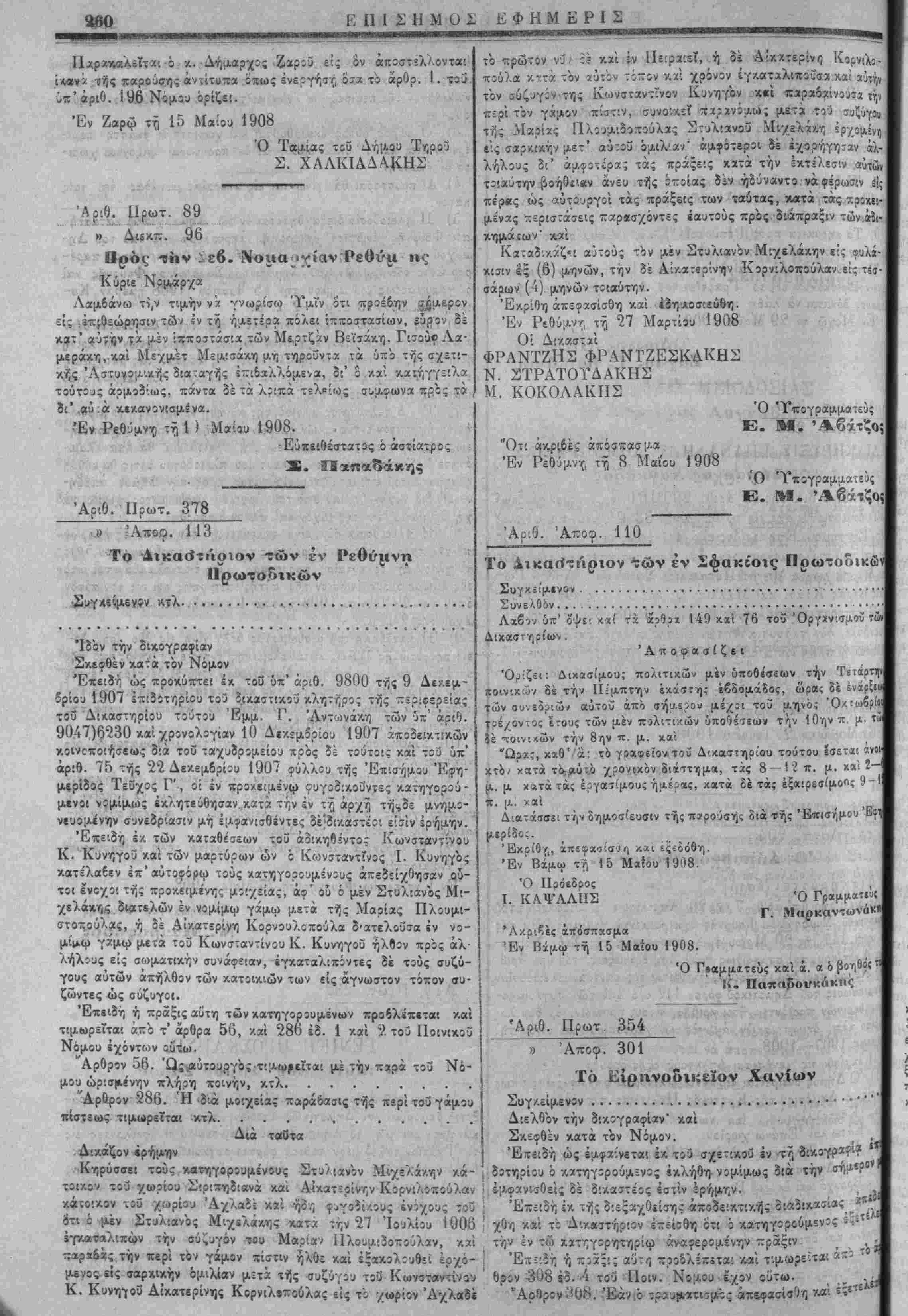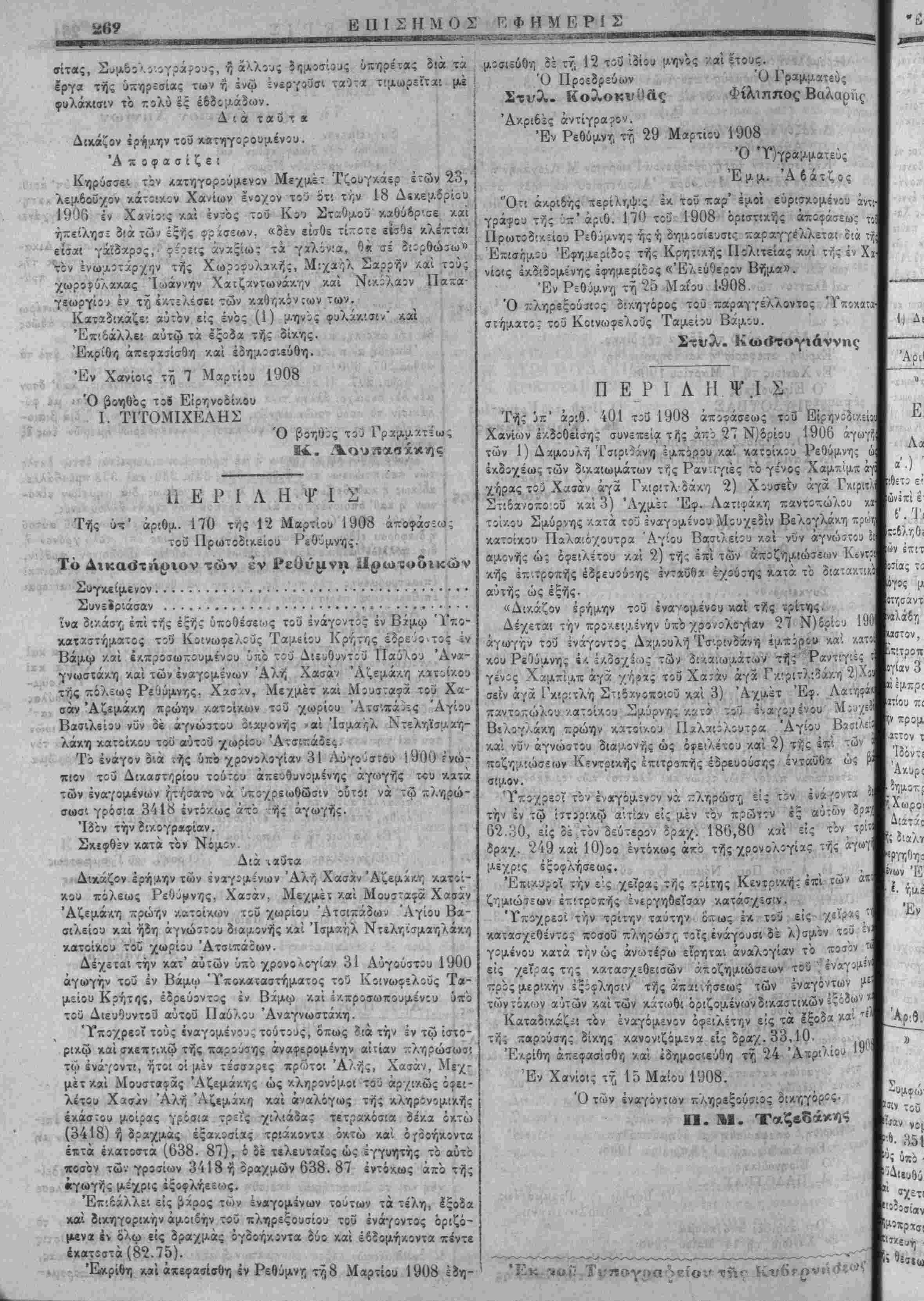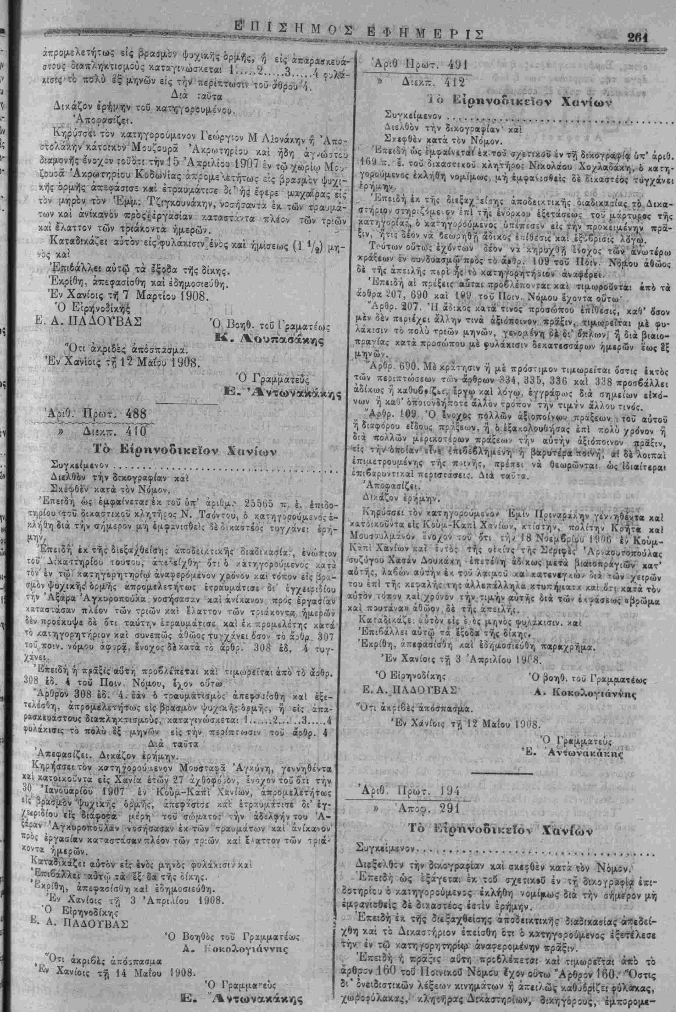 Τής Ιπ' άρ;θ. 401 τοΰ 1908 άποίάσεω; τοΰ ΕίρηνοίϋΚΗΐ