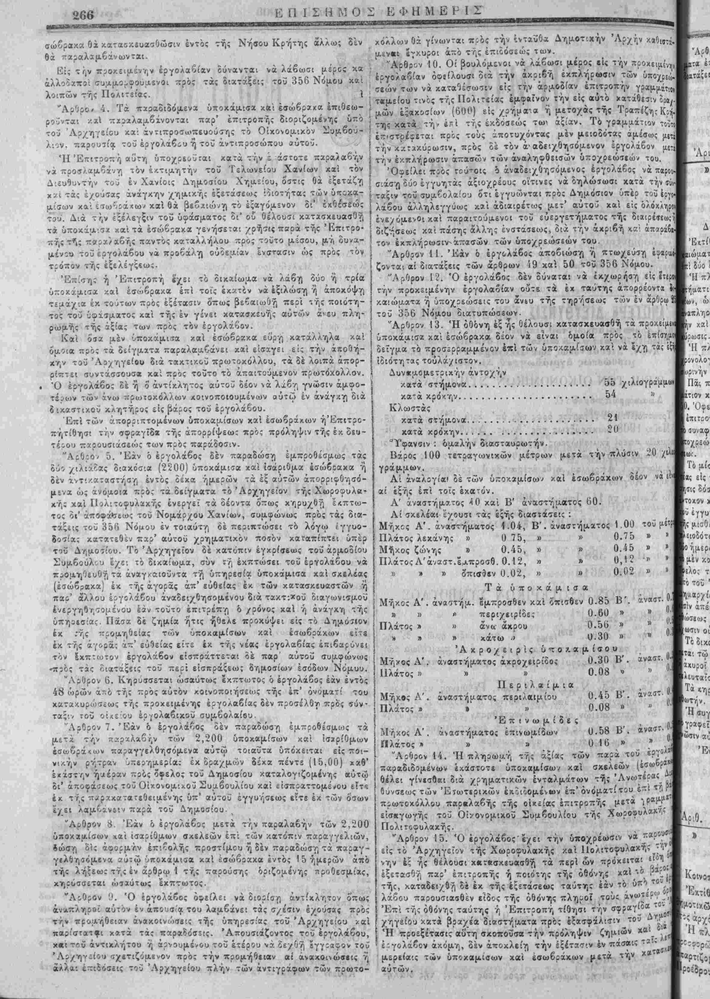 τος τοΰ Οφχσματος χαί τής έν γένει χατασχευή; αυτών ά<ευ πλη- ρωμ.ή; τής ϊξία; των πρό; τόν εργολάβον. Καί ό'ΐα μέν υποκάμισα καί έσώβρακα εΰργι χαταλληλα καί ίμοια πρό; τα δείγματα παραλααβάνει χαί είσαγει εί; την άποδή- χην τοΰ Άοχηγείου διά τακτικοΰ πρωτοκόλλου, τα δέ λοιπά άπορ- ρίπτει αυντάσσουσα καί πρό; τουτο τό απαιτούμενον πρωτόκολλον. Ό ϊθ"{οί&ο^ δέ η ο άντίκλητος αύτοϋ δέον ν ά λχβτ] γνώσιν άμοο- τέροιν των άνω πρωχοκόλλων χοινοποιουμένων ούτω έν άνάγ.ιν) διά διχαστικοϋ κλητήρο; εί; βάρο; τού έργολάβου. Επί των άπορριπτομένων ΰποχαμ.ίσων χαί έσωβράχων ή'Επιτρο- πήτίθησι τί-,ν σψραγΐδχ τή; άπορρίψεω; πρό; πρόληψιν τή; έκ οιιι- τέ-ου τ:7ρουβιασε(ό; των πρό; παράδοσιν. "Αρθ;θί 5. "Εάν ό έργολάβος δέν παραδώση έμπροθέσμως τάς δύο χιλιάδας διαχόαΐα (2200) υποκάμισα χαί ϊσάριθμιχ έσώβ:αχα ή δέν ΐντι/ατοιστήσ·/) έντός δέκα ημερών τα έξ αυτών άπορριοθησό- μενα ώ; άνόμοια πρό; τα δβίγματα τό Άίχηγείον τής Χωροφυλα- χή; χαί Πυλ:τοφυλακή; ένεργεϊ τα δέοντα όπως κηρυχθή έ*πτω- το; δι' αποφάσεως τού Νομάρχου Χανίων, συμφώνως πρό; τα; δ'.α- τάξίΐς τοΰ 356 Νόμου έν τοιαύτη δέ περιπτώσει τό λόγω ΐγγυο- ίοσία; κατατεθέν παρ' αύτοϋ χρηματικόν ποίον καταπίπτει Οπερ τοΰ Δημοσίου. Τό Άργηγεΐον δέ κατόπιν έγχρίσεω; τοΰ ίρίθαΙου Συμβούλου ε/ει τό διχαίω.αα, συν ΐ?| έχπτώσει τοΰ έρνολάβου νά προμηθευθή τα άναγ>-αιοΰντα τή ΰπηρεσία υποκάμισα χαί σχελέας