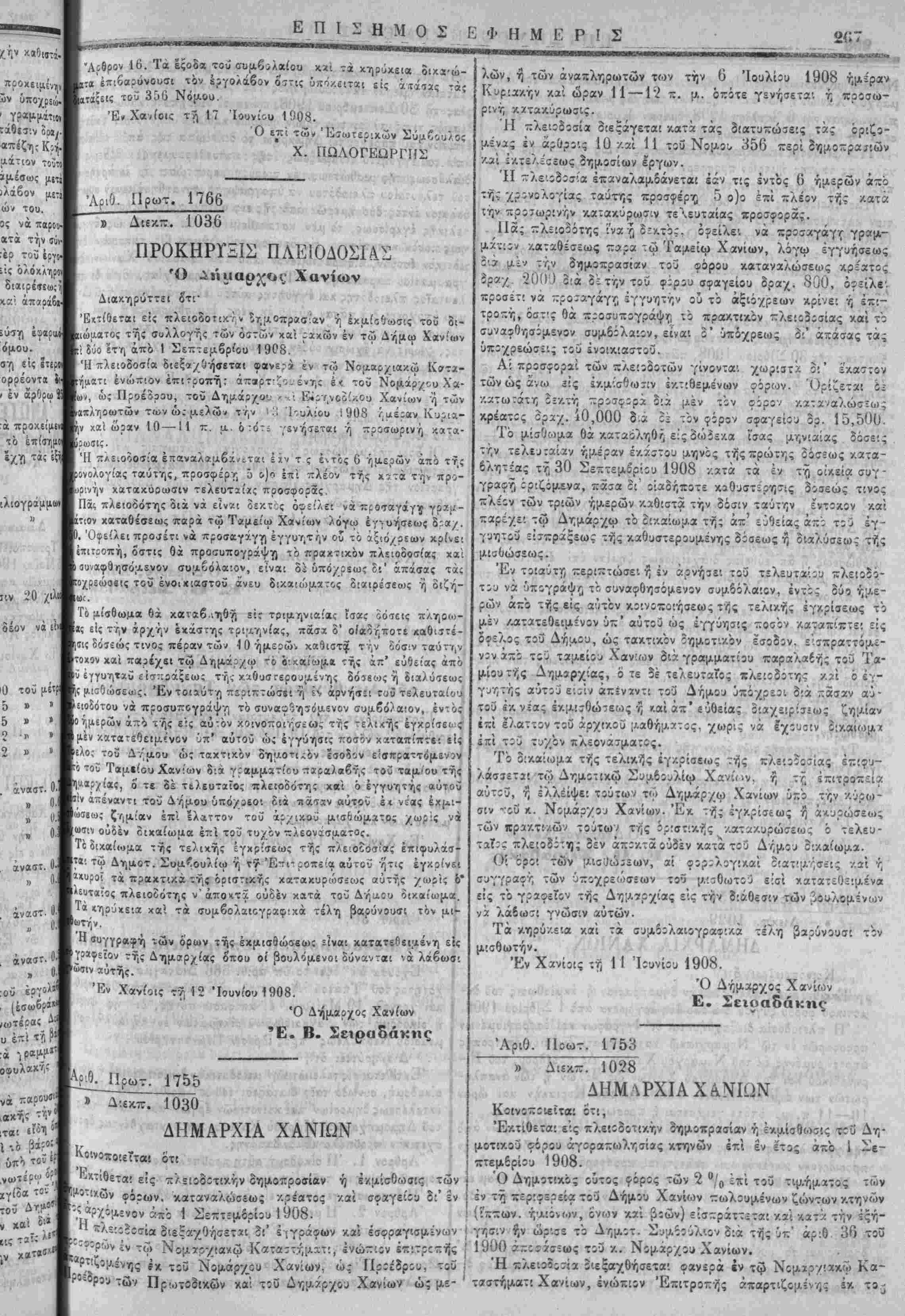 ιιχΓ|ΐήςεί? αυτής. Β'. δύο Α. Λ. Έσωτεριχών, περί ποο,χ·ηθε!«<; :τώνων Χωροφυ/αχτ,ί, χαϊ περ'ί ΰποχνμΐβ'ον χα'ι ί-τωβράχων ΙΙο- ιτορυλαχής. Γ'. τε'σσαρε; Δημίο/ο^ Χανίων πεοί ?έχμισ0<όσίΐ«; ΑΝΩΤΕΡΑ ΔΙΕΥΘΥΝΣΙΣ ΤΩΝ ΟΙΚΟΝΟΜΙΚΟΝ Ιϋιοι ί003!βπο»ή({εως τοΰ τετάοτοιτ όΌοι/· τΛςίτπ'άρ»β. ι~843]!276 καί ;,ρ-ϋ8 ΜαΐοιΜ9(ΙΒ δϊακηρνί/ω; ιΛς "Ανωτ. Δ»£ΐ'βν'νσ*ωι; τφν Οικονομικόν «:τγοϊ έκ- ιπόΟώόΓως άγριάδων ■»·(? Δηιιοιϋον. ,α<.·^· Ο ΕΠΙ ΤΩΝ ΟΙΚΟΝΟΜΙΚΟΝ ΣΥΜΒΟΥΆΟΣ"' Διαχηρύττει ότι, Τροχ:-οιεΓτα! ό τέταρτος όρος τής ύπ' αριθ. 184ϊ/<ί7δ και ΧΡ· )Μϊί:υ 1908 δίαχ,ηρύξεως τής Ανωτ. Διευθύνσεως των Οϊ- |ν:μιχ.ών «π:ρί έκίΛίσΟώσεως άγριάδων τ;3 δημοσίου» ώ; έπεται ιό αίΐθωμα εκάστου Ιτους ν.αταβληθήσίται είς δύο Γαας 5όσε:ς, ιί; μια την 1 Απριλίου, ή 2ί έτίρα την 1 τοϋ άμεσως έ~ομέ- ρ μηνός Αΰγοόσιου». Έν Χανίοις τί) 14 Ίουνίίυ 1908. Ό 4τγ( των ΟΊνίθνομιχών Σϋμβουλο; .. ,ν , Ε. ΜΟΔΑΤΣΟΣ ΠΕΡΙΕΧΟΜΕΝΟΝ οημοτιχών φορων. 2) Γνωστοποίτ,σκ Δΐίο'^ιΐνσεως 31 -ιΐχηΐύί·«ι α'. Μονεστ. 'Κ~ι*ρ. Λασηθίου, 6' Έ·.ωο 'ϊίπιτρ. Κρουσώνίς Μαλεβυζίου, γ'. Δτ,μίο,, ου Κυ.·πανού, δ . Λΐ)ϋαί;χί« Ση-ίίϊί,β'. Δηαάρχου Πραιίοϋ Σην«ί«<, βτ'. Ληυΐνχΐ,υ Βιάν- νουρ χαϊ Ί] Διχβστηχά. φθίϊση; ύτ:' αρ'.θμ. ""/κοβ *· ί· διακηρύςίω; ημών, Ινεργηθη- σομένην ίνώττιον των 5ΐα τής διβκηρύςΐως ταύτης ό,-ίζΐμέοην, 'Ε]π·.τροιτε'.ών /.αί ίν ταίς αύτοΤς τ:χο:ς την 26 'Ιβυνίου 5. ί. ήμέ- ρΐν Ιϋμτττην /.αί ώραν 9—10 π. μ. .ο Έν Χβνίίΐς τή 17 Ίουνίίυ 190Η V» Ό επί των Έτωτιριχών Σύμβΐυλο; Χ. ΠϋΛθΓΕΙίΙ'ΓΗΣ ^- ΙΙρωτ. 338-2 » Διιχιτ. 2610^ 0 ΕΠΙ ΤΩΝ ΕΣΩΤΕΡΙΚΟΝ ΣΓΜΒΟΤΛΟΣ Λαβόντες ύπ' όψει ." ;χ *..ΐ.» ?■ ι; "^,. (· >Ί Την ύπ' άρ-.θμ. !791/23«6 <· ί- ίιβκήρυξΐν ημών* δ(''ής Ι«6«:ο^εις φανεράν δημ3~ρ:>σίαν ή β—ι έ'ν έ*;ος προμήθεια των