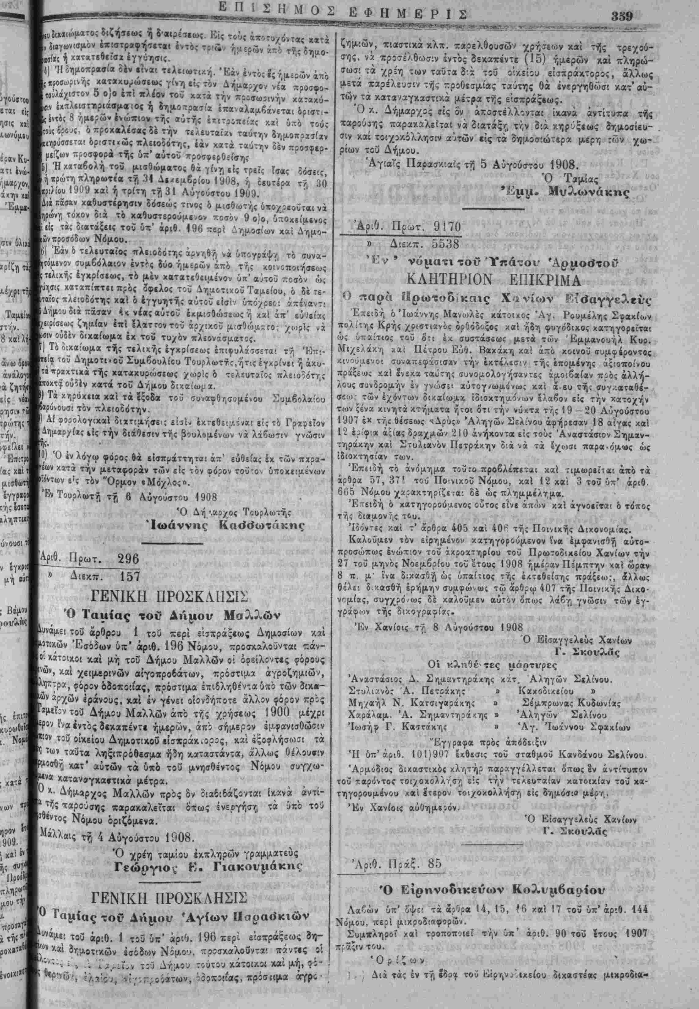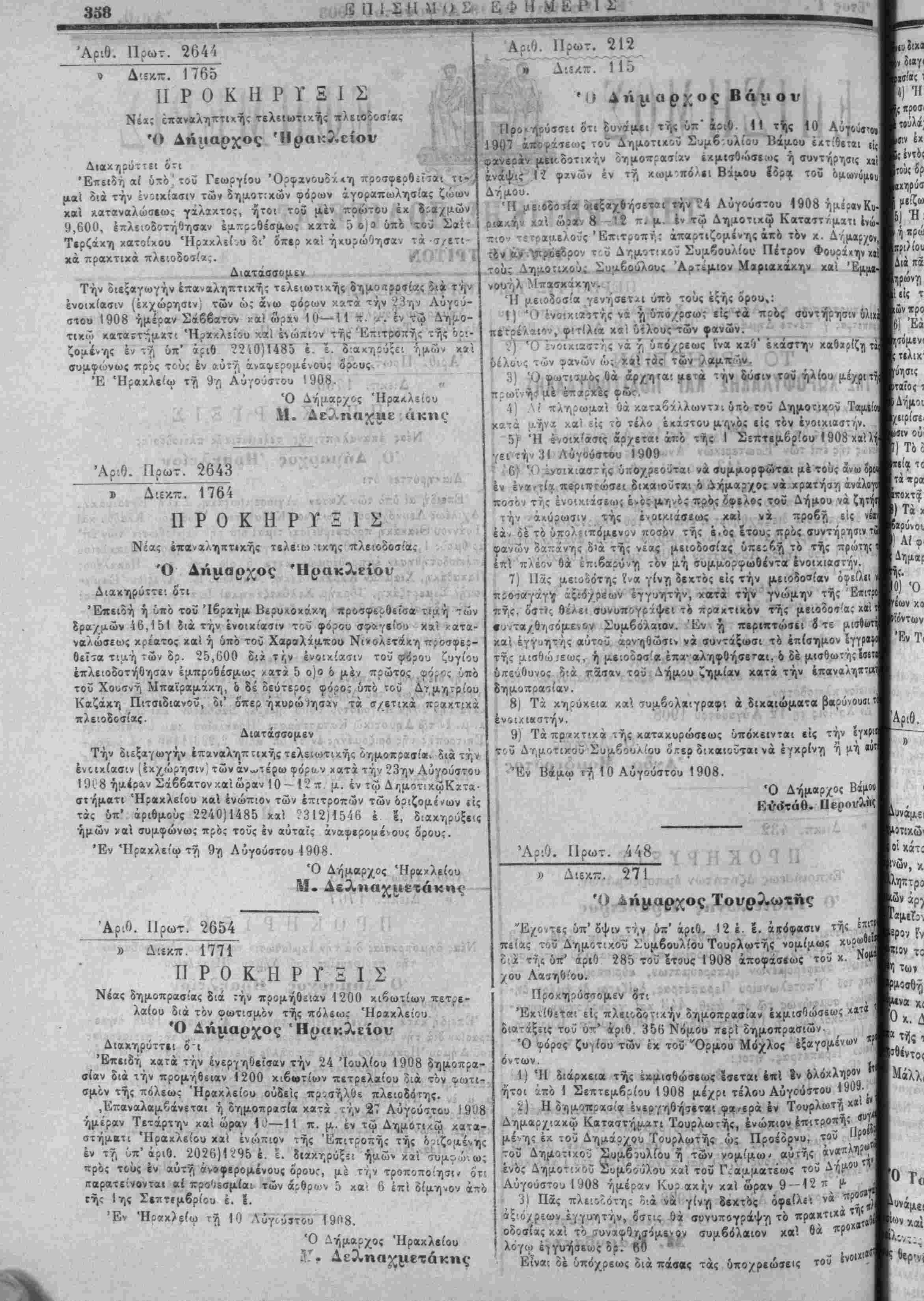 σ-ιου 1908 ημέραν Σάββατον ?α! ώριν 10—Η π. <χ: έν τω Λ-η^ο- τιχω χαταϊτήμχτι Ήρχχλείου χαϊ ενώπιον της Έπιτροχής τή; ορι¬ ζομένης ϊι -?, ΰπ' ϊριβ 2210)1485 έ ? δύζ ηώ ί συμφωνως πρός τοΰς έν »ΰτ?, άναψερομένου; ορ&υς. Έ "Ηρακλείω χ/) 9τ; Αύγο^υτου ' 908. .' „ Ό Δήμαρ/ος Ηρακλείου 11. Δελιια^ιιε άκης Αριθ. Πρωτ. 212 Ό ή μάριος Βάιιον. 1Ιρο»ηρύσσίΐ ότι δυνάμει τής ύπ'«οι6. 11 τ^ς 10 Αύγ&ύίΌιΙ 1907 αποφάσεως τού Λημοτικοΰ Συμβ.υλίου Βάμου έχτ'ξεται ,;(Ι φχνεοαν μειοδοτικήν δημοπρασίαν εκμισθύβιως ή συντγ,ρτ,ϊις Χ,Ι ίνάψις 1? φ*νών έν τή χωμΊτόλει Βάμου »δρα τοϋ ό|*ωνι1μ(υ| ?. δ-αχηεύζει ημών ·.»1 Λ'ί- Αριθ. Πρωτ. 2643 » Διεκ,π. 1764 'ίΙ — ΠΡΟΚΗΡΪΗΙΣ ,. Νέας έχαναληπτικής τβλε'ω ιχης πλειοδοσίας Ό Δήμαρ^ο^ Ηρακλείου γ ' Διακηρύττει ότι Έπειδή ή υπό τοΰ Ίβραήμ Βερυχοχά/.η πρς>σφερβείσα τίμή των