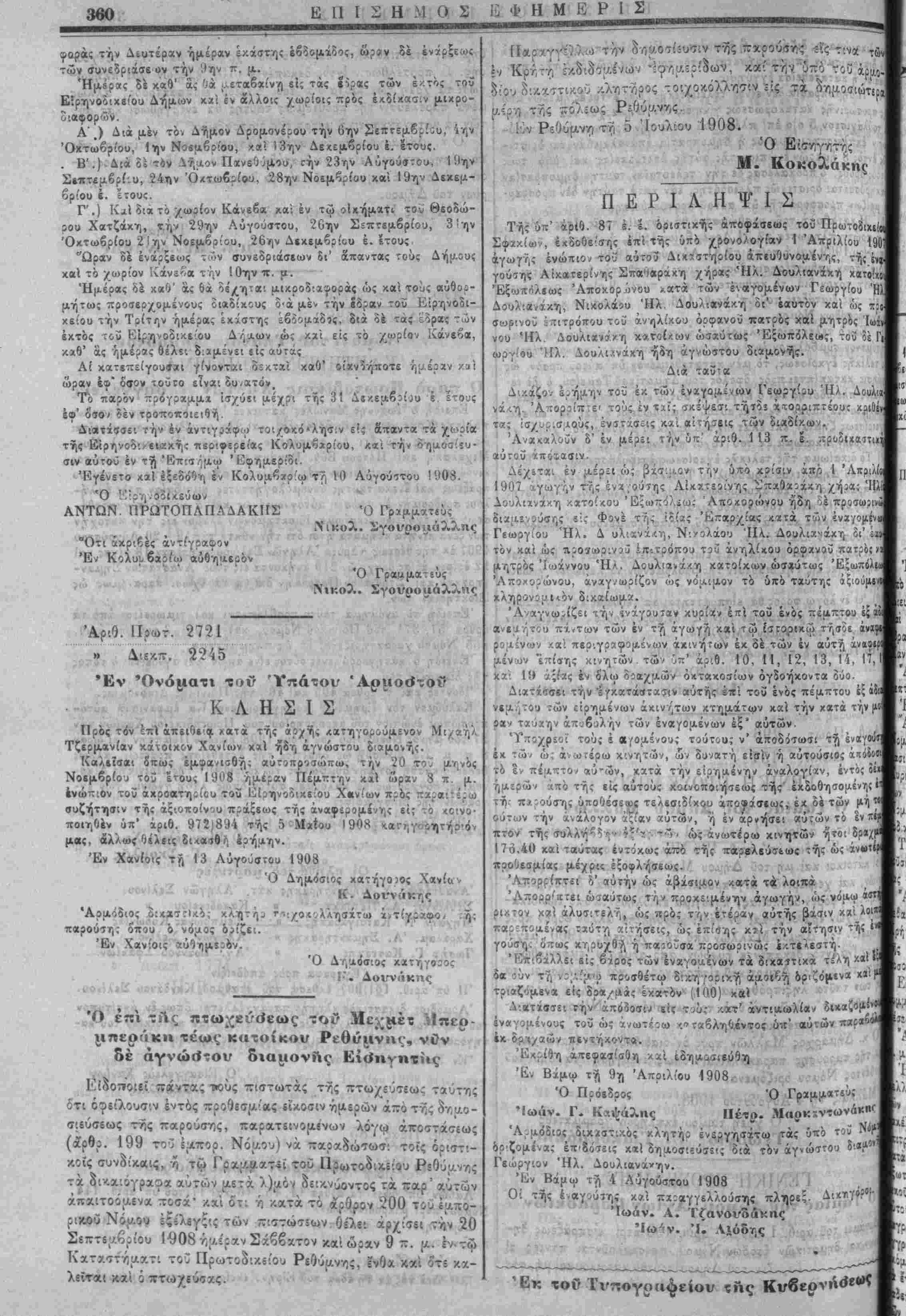 τής Εΐρηνοδΐ/εΐιχχής περιβερείας Κολυμβϊρίου, <«ί τή» ο()ΐι.οσ:5υ- σιν αυτού έν τή Έπισ^μω Έφτ,μερίδΐ. Εγένετο χαϊ εξεδόθη έν Κολυμβχρ'ω τ?, II) Αϋγούιτου !'.)08. ΑΝΤΩΝ ΠΡαΤΟΠΛΠΛΔΑΚΗΣ "Οτι άκριβές αντίγραφον Έν Κολυι^δαρίω αΰθ·ηαίρόν Ό Λικολ. ϊγουροαάλλης Ό Γραμματεύς Νικολ, ϊγονοοιιάλληζ ι»Αριθ. Π?ωτ. 2721 .» Διεκττ. 2?ί5 Έν Όνόματι χοϋ Ύπάτον ε Κ Λ Η Σ Ι Σ Πρός τιΐν επι άπ$ιθ«'α χαχά τής άρ/ής χατηγορούμενον Μιχαήλ Τζερμανίαν χάτοικ&ν Χανίων χ»ί ήδη αγνώστου διαμονΐίς· Καλιϊίαι οΊΐιυς έμφαίΐσθ/); αύτοπροσώπω, την 20 τοϋ μηνός Νοιμβρίου τοϋ ετους 1908 ημέραν Πέμπτην χχΐ ώραν 8 π. μ. ενώπιον τοϋ άχροατη;ίου τού ΒΙοηνοίιχείου Χανίων πρός ΐτχραιιέρω συζήτησιν τής άξιοποίνου πράξϊως τής αναφερομένη εί; τό <οινο· ποι-ηθέν ύπ' αριθ. 972)894 τής δ Μαίου 1908 καΓηγορητήρ'ίν μας, άλλως 6ίλιις δικασθή έρήμην. Έν Χανίοις τή 13 Λϋγούίΐτου 1908 - ' " - *-Ό Δημόσιος χατήγοιος Χανίαν ν1/. .τ~χ ; | ;τ> Ι