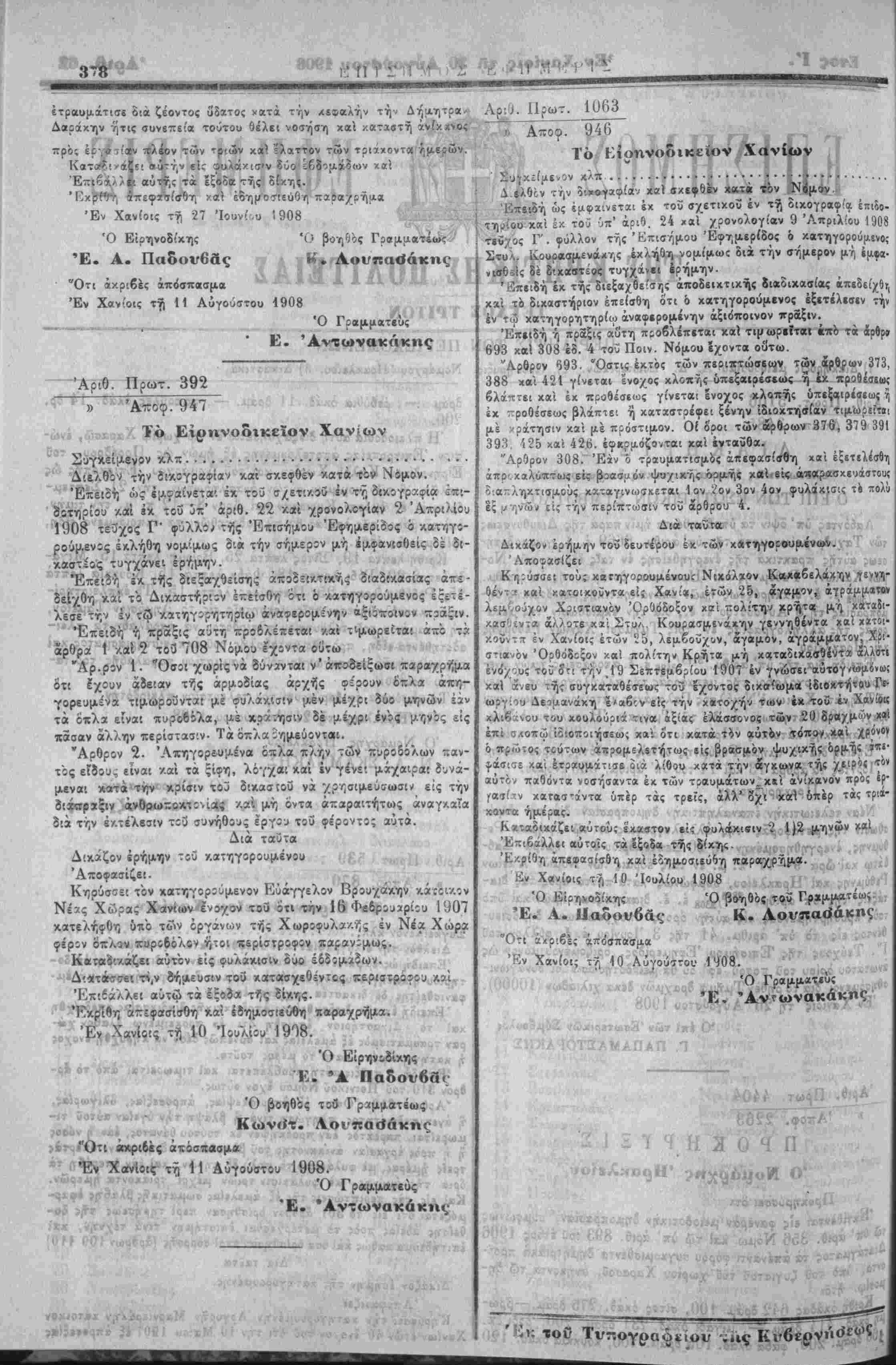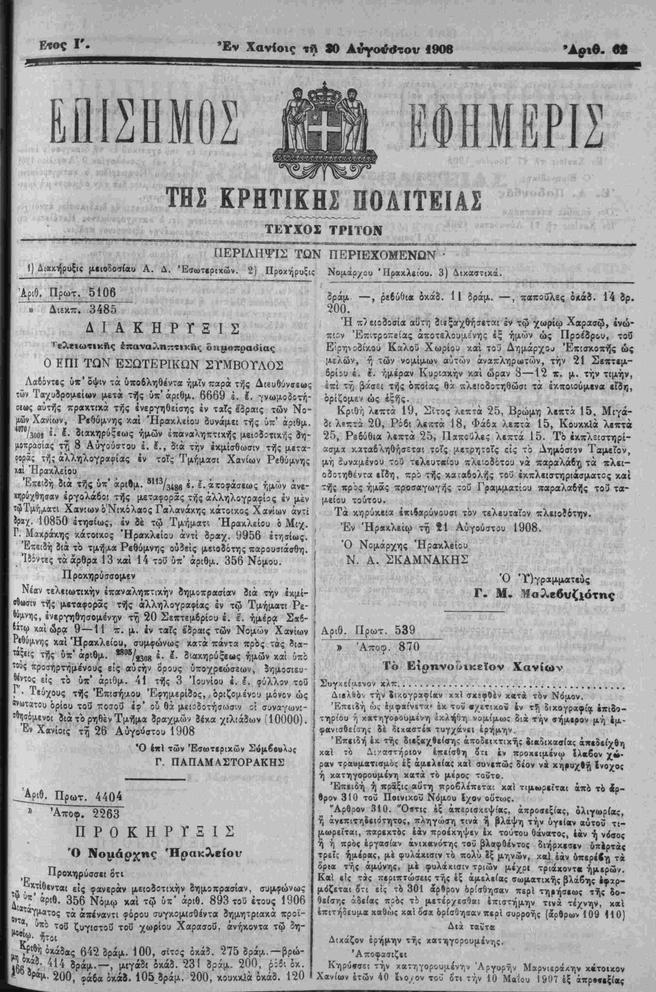 Έν Χανίοις τη 11 Αΰγούστου 1908 .