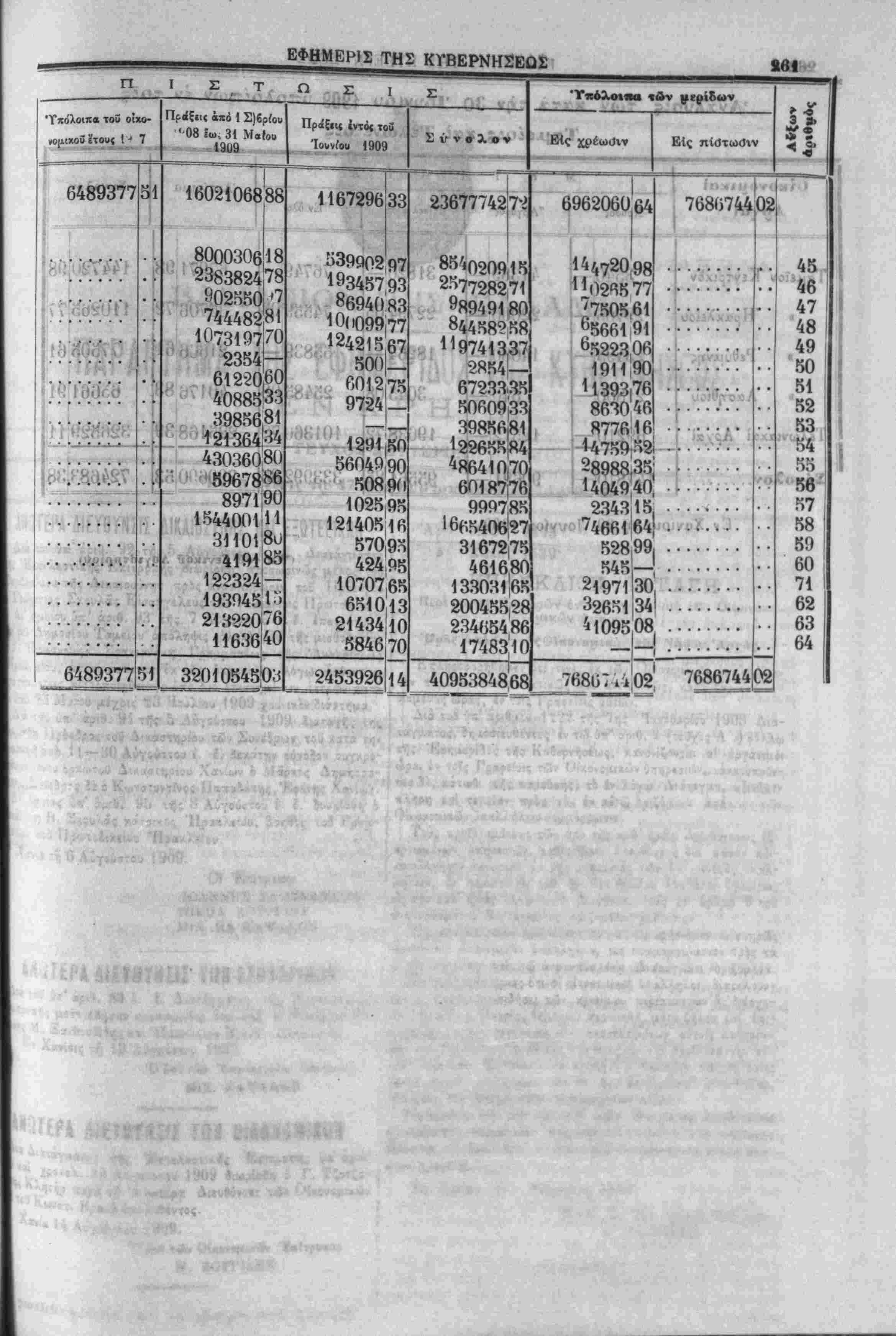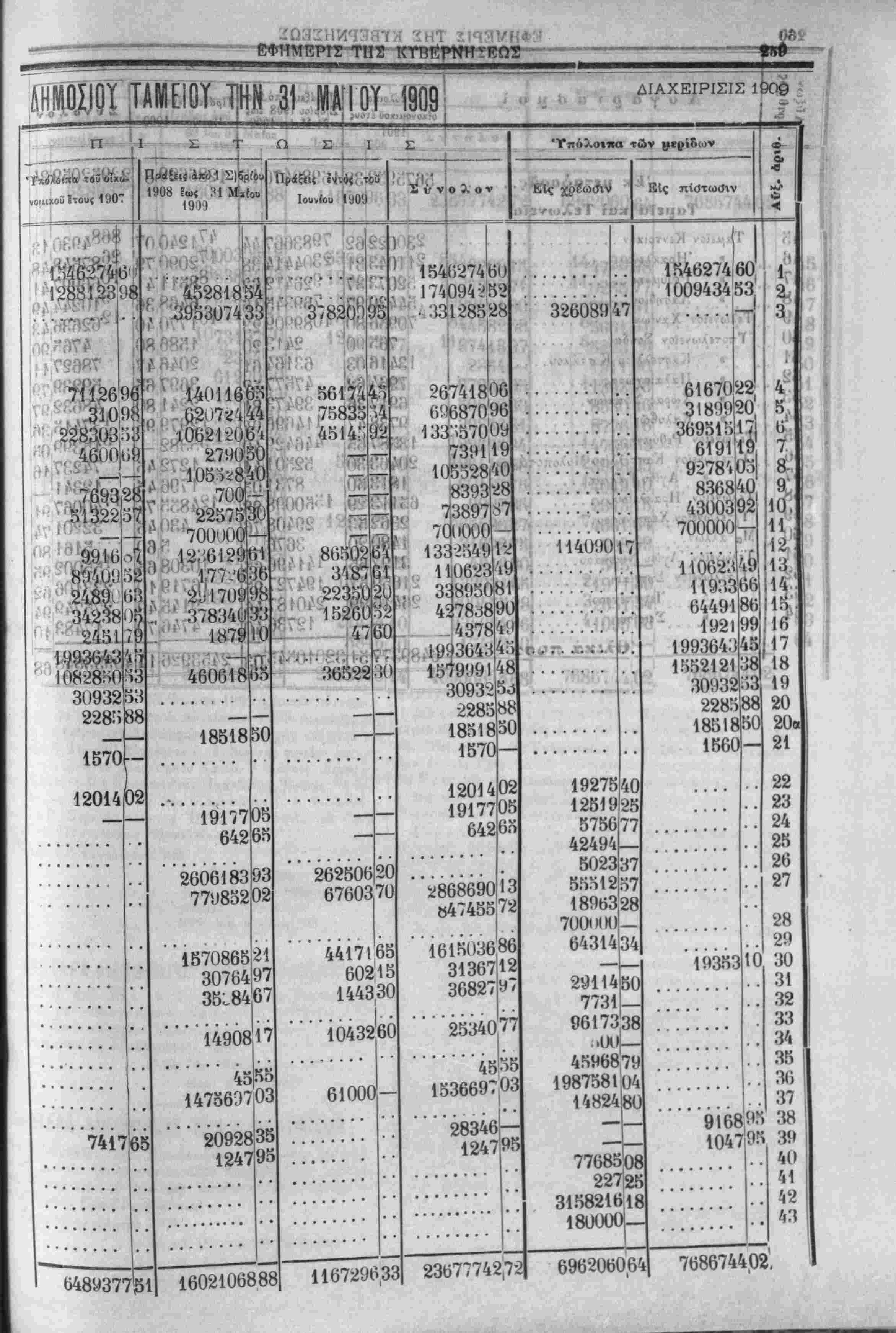 Πράξίΐ< άπό 1ης Σ)6ρ'οο 1908 Ιω{ 31 Μαίου 1909 15989476 Ο . Ι ( 15 23002262 ,.21104331 52073,37 54430,97 709»ί6 80 765 90 1341603 7964 .ΑΙ. Γ " " , - 7 '.' 6917ι36 ,ρ 9738(47 Λ' 1358765 2046330 18,13150 65113|29 236253 . 148020 319765 '.«: 21659,57 ■ 264,169,9, "6489377 51 983667ι44 2304414,38 92641263 769345,16 1089909 §3 2413,20 63164 47577.Κ2 ' 3947381 114696ΙΒ4 44642940 5250141 «73105. 1-550098,88 2940876 3676 14149665 ' 194727|95 .24018746 Πράξΐις εντός τοδ ■Ιουνίου 1909 128662981 ^124007 .. Λ ^2090,79 -^8754848, ^66997,41 ί 6468 36 12736 40 3201054503 101770,40 1586,80 204647 3697 6Η 2241 80 Ί 2979 95 ^5382 1272 4? 1796,45 124855,74 43045 5 60 10308,65 16719|1Ο 9145,49 4746 70 2453926 126263643| 476" ρο' 7862711 ,48632,97 ^7415, 5 36 7423716 12341_ 1740067,α.ι 32201,74 ,.5161 «π 23310662 7' 9Α 1.748^10 14 409538486^; Ι- 8!? —|οτ<