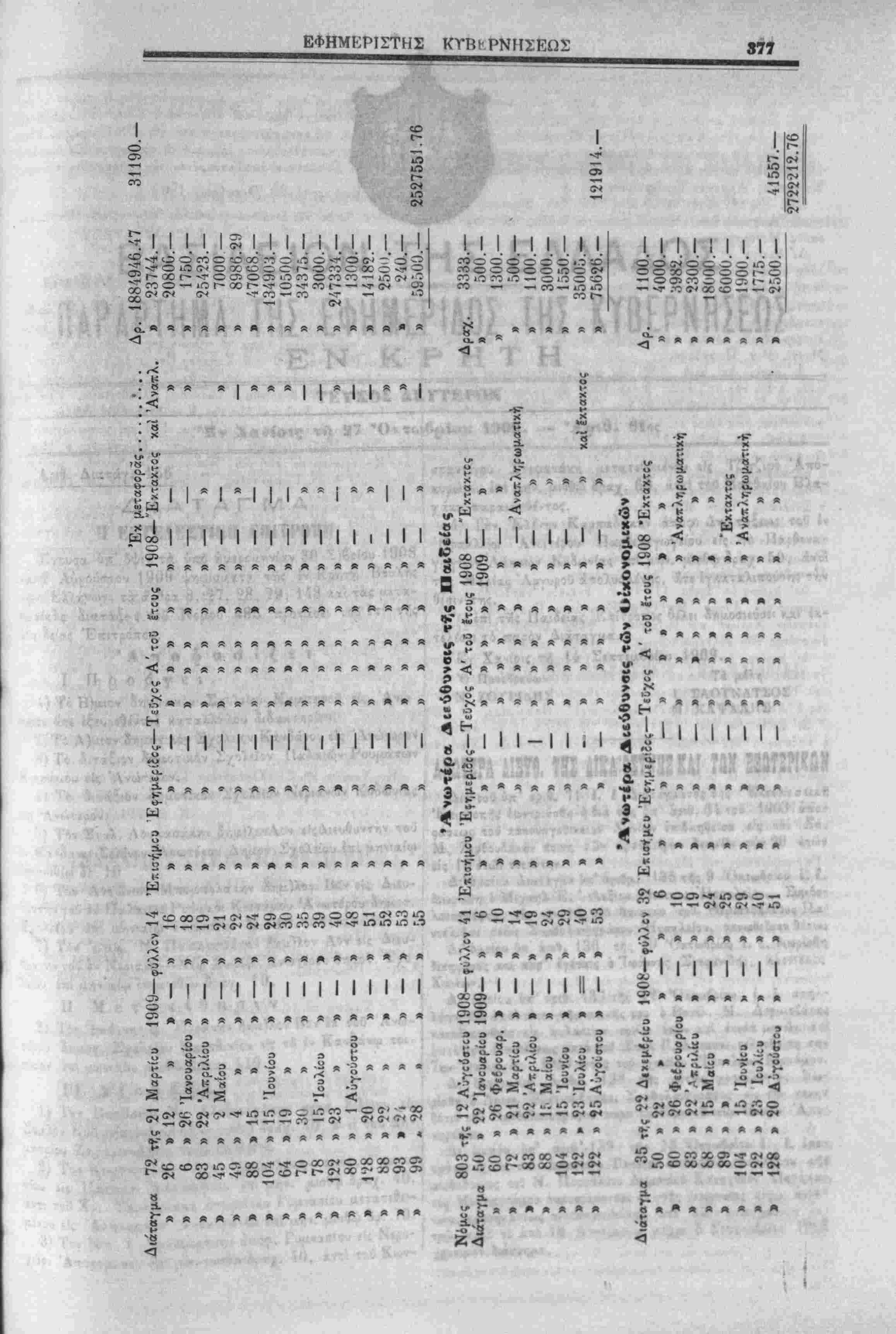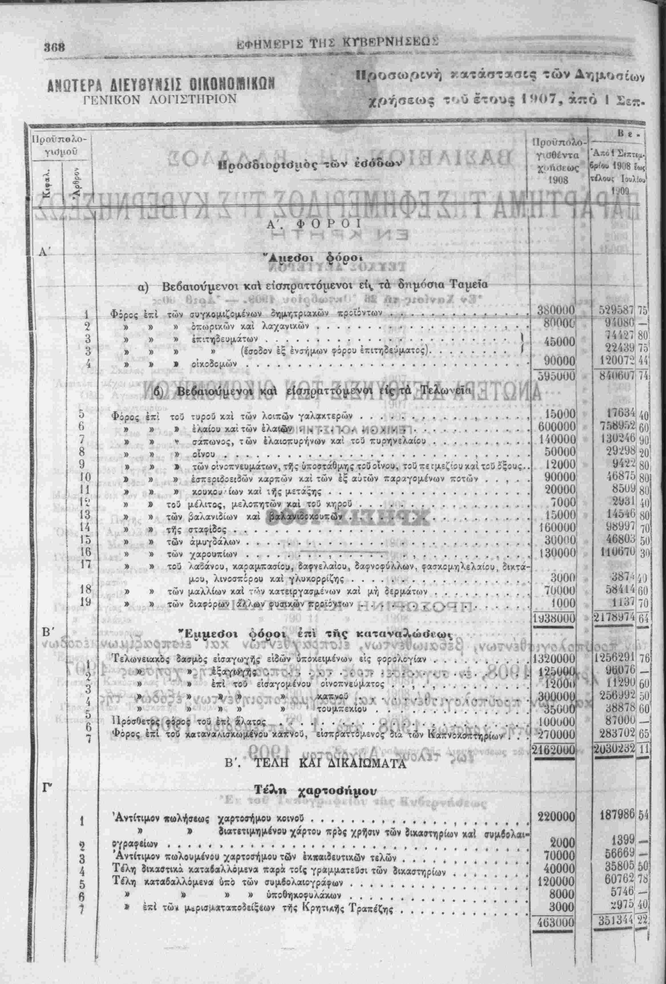 "Ειιμείίοι <^όοοι επί τής καταναλώόνω·, Τελωνειακός δασμός ε'ισαγωγής ε'ιδών υποκειμένων εις φορολογίαν ! γγ Χ ν? Τ » επί τού ε'ισαγομένοα ο'ινοπνεύμΐτος ϊΐρόσθετρς φόρος τού έ«ι ϊλατος . V . Φορος έχϊ τοϋ καταναλισκωμίνου χάιίνού, ε'ισπρ*αττόμενον οΗ» ων ι » Β'. ΤΕΛΗ ΚΑΓ ΔΙΚΑΙΩΜΑΤΑ )ΛϊΤ ^ Τέλη 'Αντίτιμον «ωλήσεως χαρτίσήμου κβινοδ.................... » » ίιβτετιμημένο» χάρτου πρός χρήσιν των ίικαίτηρίων καί «μίβλ'βι βγραφείων.....................,........... Αντίτιμον κωλουμένβυ χαρτοσήμου των έκκαιδευτικών τελών.......... Τέλη ϊικαατικά καταίβλλομενα παρά τοίς γρβμματεϋσι των ίικαστηρίων .' ..'.'! Τέλη κατβδαλλόμεν» 6πο των συμβολαιογράφων......... » » » » ύποθηκοφυλάκων ........... > έκί τώ» μ*ρισμ~ιχποδείξεων τής Κρητι*ΐ)ς Τραπέζης.......'.'!'