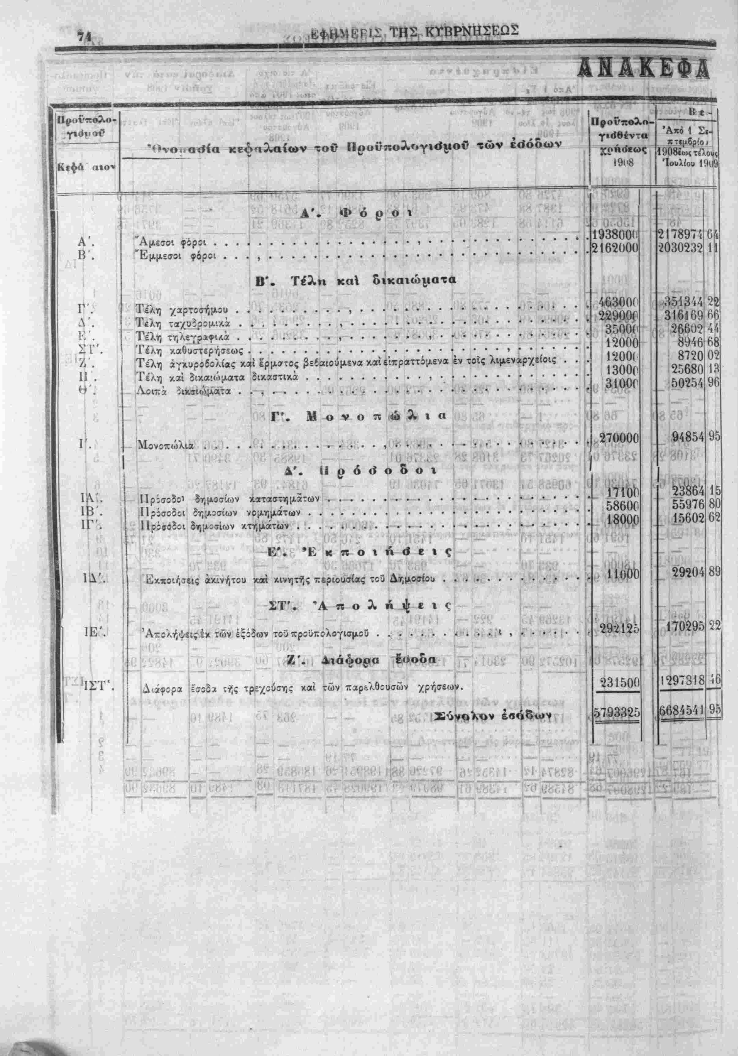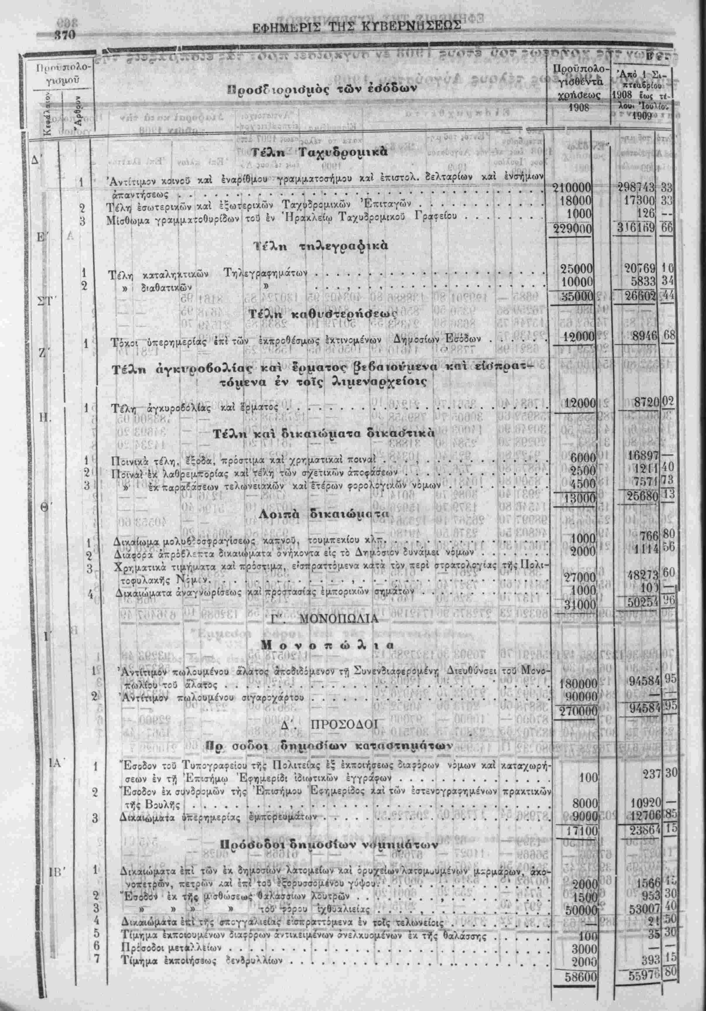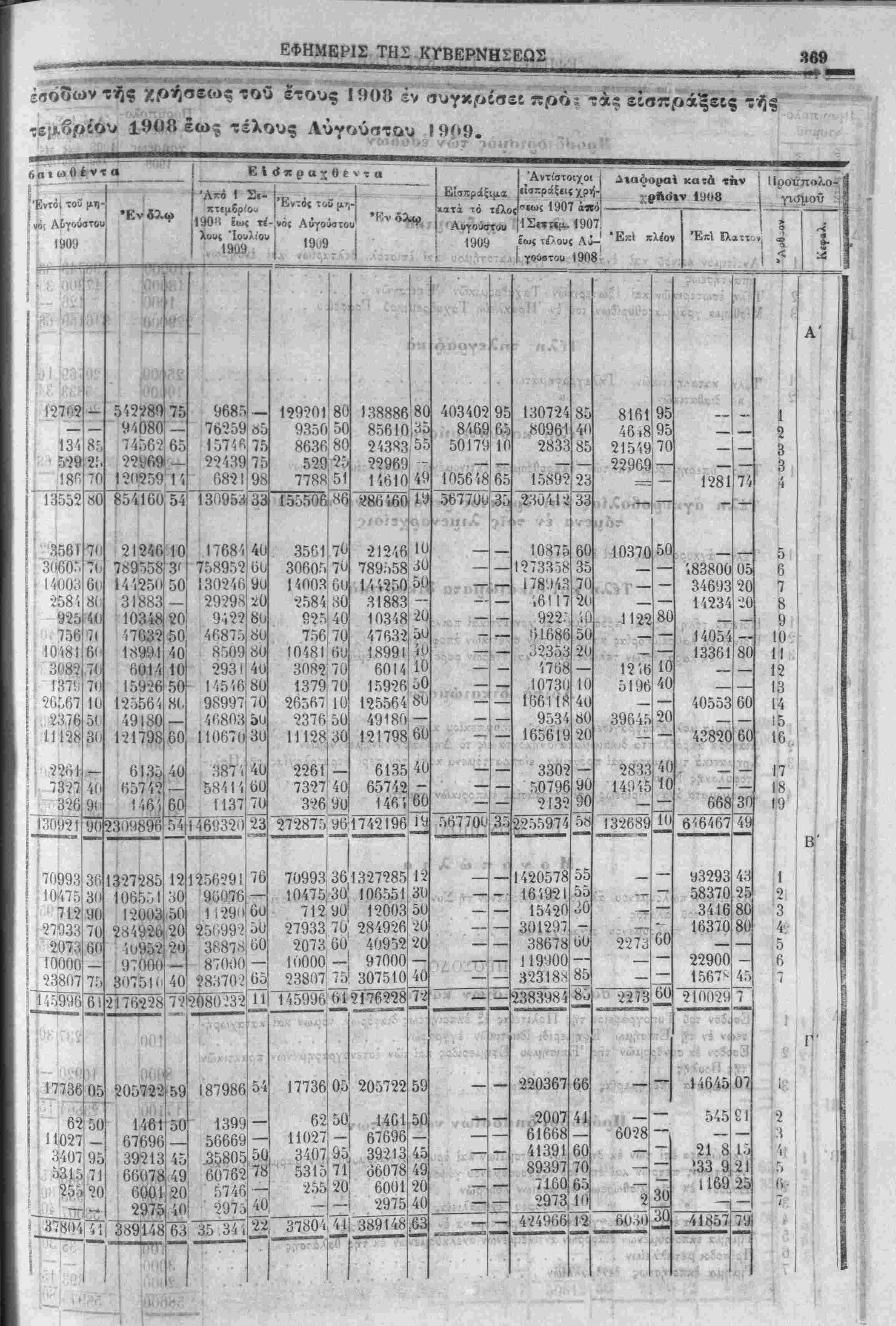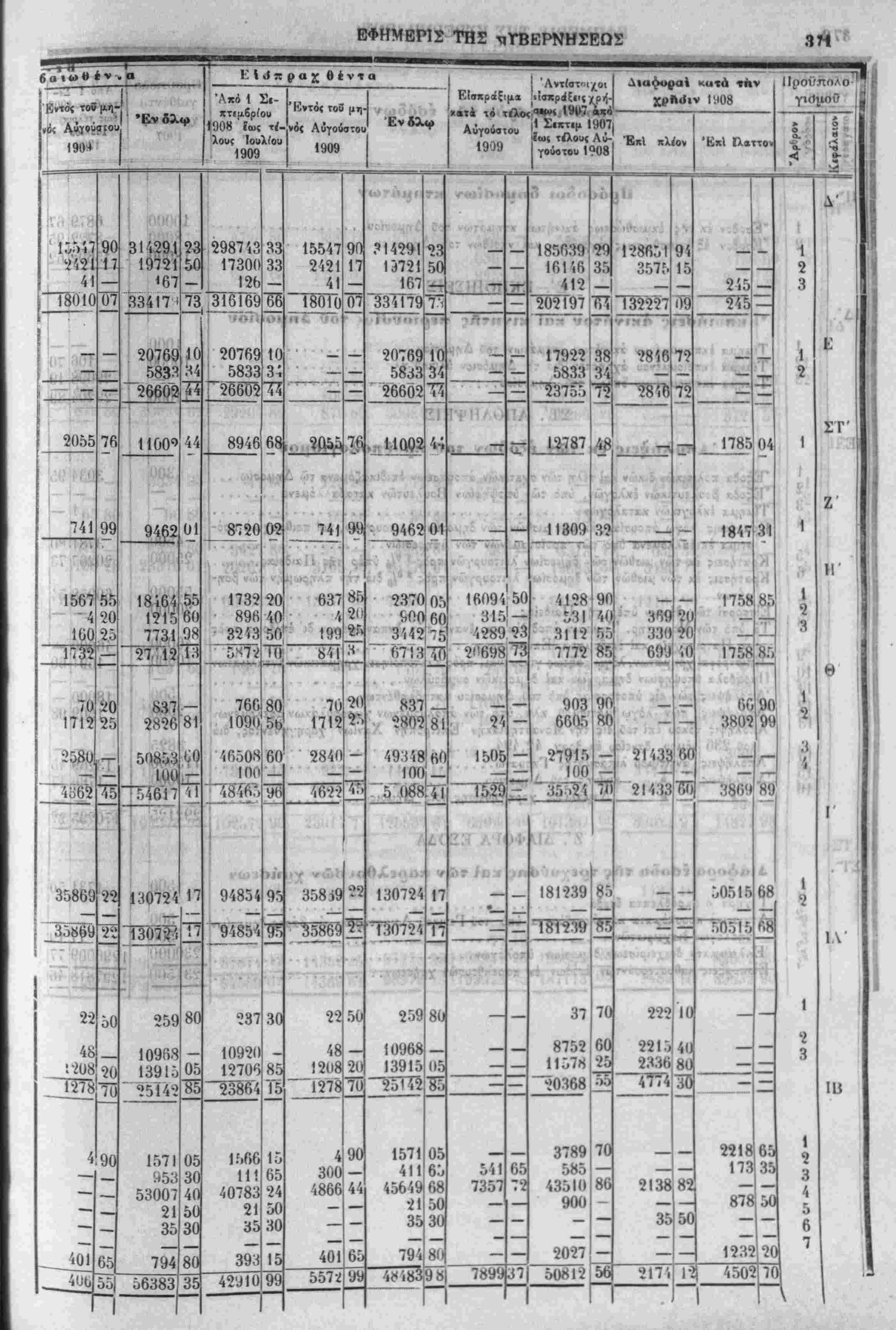 .< -. ■?, . των Προνπολο- γΐίίθίντα •• 1908 'Όυ 1908 ϊω,' |τίλους Ιουλίου5 ι Ι ΪΒΦ31ΊΑΜΙΤ ι , 7 ! 8 9 10 11 Ιί' 1 13 ! |ί ■ ιο Ί 16 17 ! 18 3 4 | 5 Ι 6 '· 7 Α'. ι Φ Ο Ρ Ο Ι α) Βεβαρυμένοι κα είσπραττόμενοι ε( τα Ταμεΐα Φόρος επί των συγκομιζομένων ϊγ^ητριακών χροϊοντων ,*_«,_.._ .._. ._.« «-■»,-» .» -* » » » οπωριχών καί λαχανικών.................., . » » » έπ·.τηδευματων........................ Ι » » » » (εσοδον έξ ένσημων φόρου επιτηδεύματος)........ / » » » ο'ικοοΌμών........................... ■<5) Φορος επί τού τυρού καί των λοιπών γαλαχτερών » » » ελαίου καί των έλατφν Μ Ν Γ·μ Υ>+