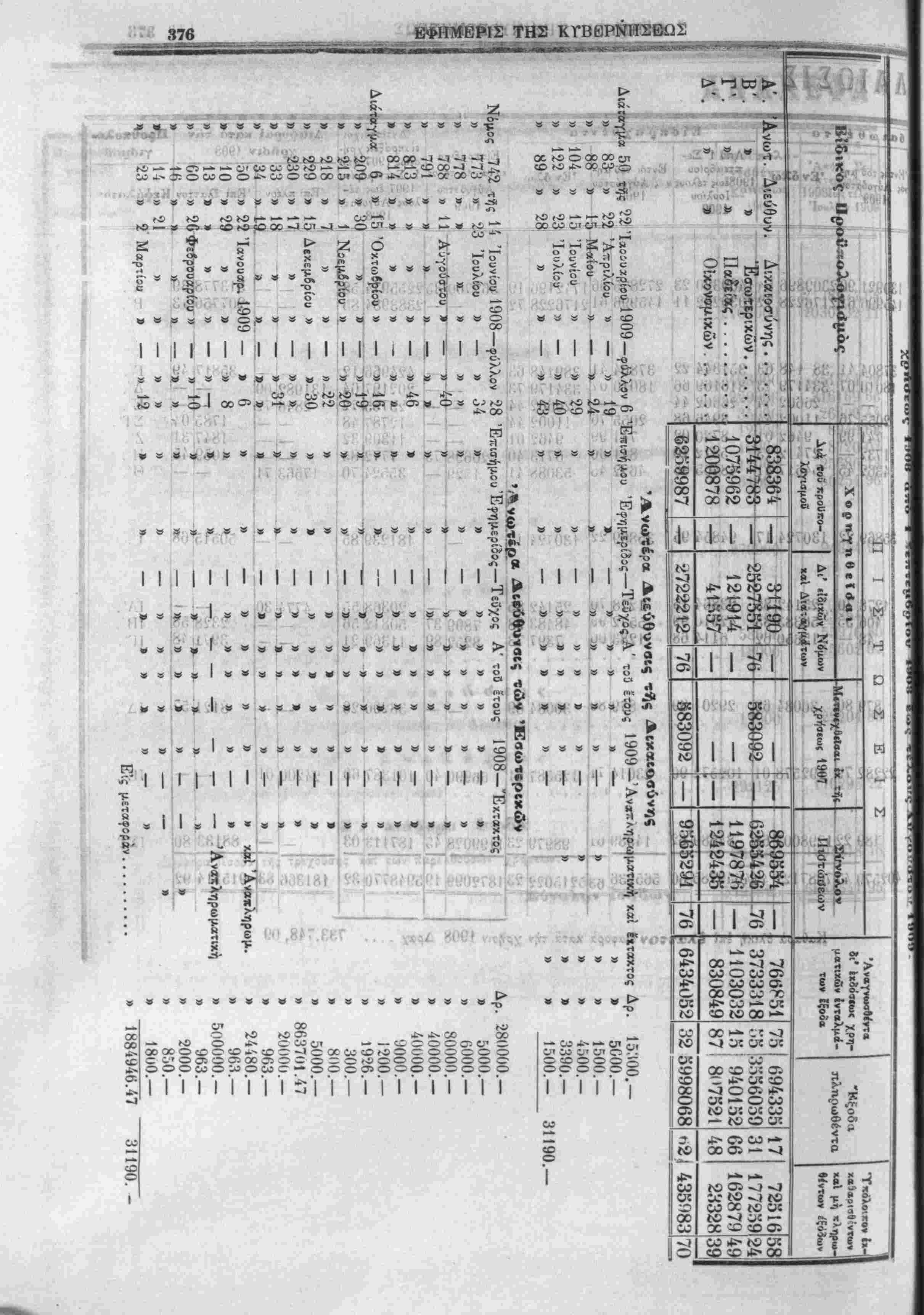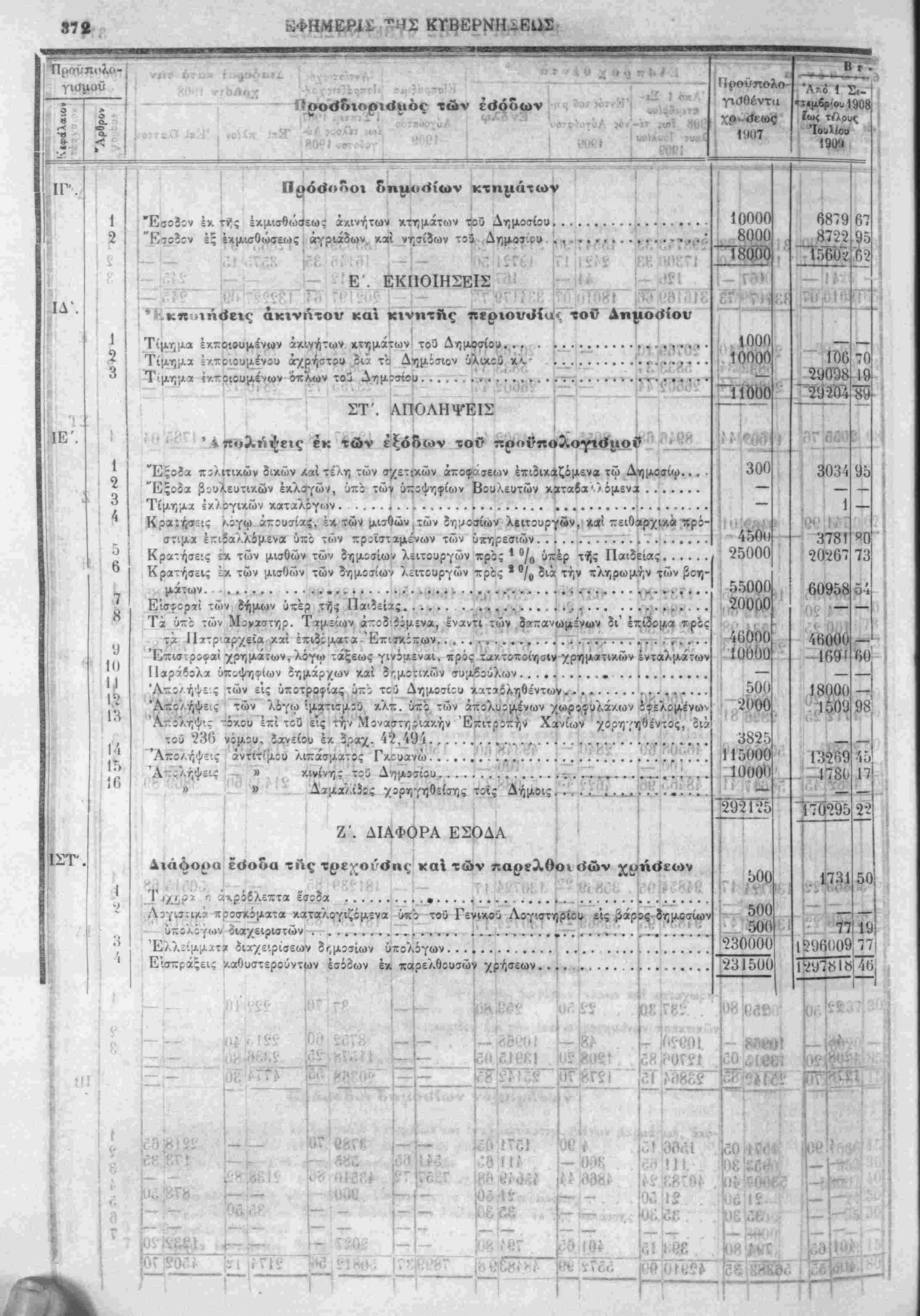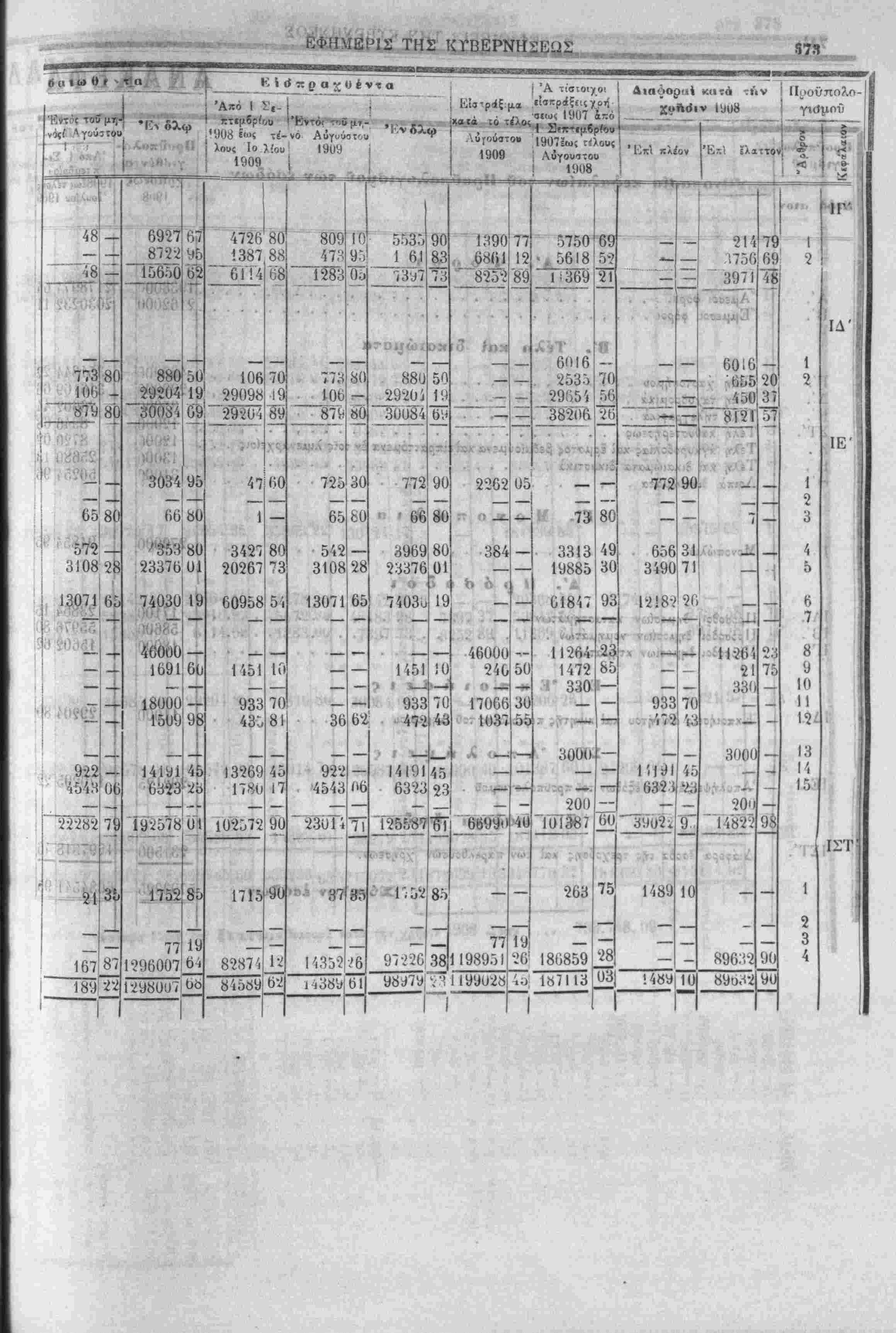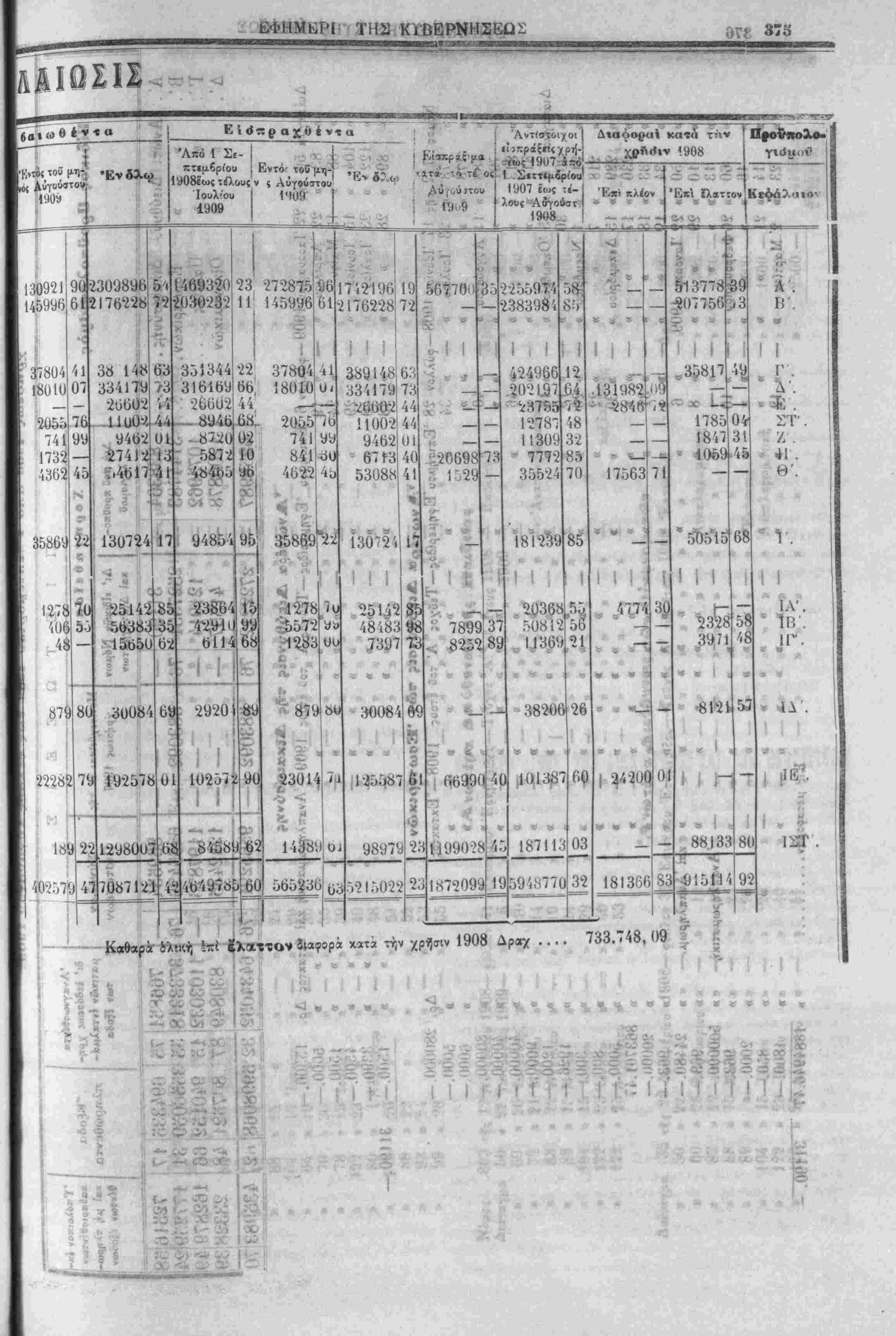 .< -. ■?, . των Προνπολο- γΐίίθίντα •• 1908 'Όυ 1908 ϊω,' |τίλους Ιουλίου5 ι Ι ΪΒΦ31ΊΑΜΙΤ ι , 7 ! 8 9 10 11 Ιί' 1 13 ! |ί ■ ιο Ί 16 17 ! 18 3 4 | 5 Ι 6 '· 7 Α'. ι Φ Ο Ρ Ο Ι α) Βεβαρυμένοι κα είσπραττόμενοι ε( τα Ταμεΐα Φόρος επί των συγκομιζομένων ϊγ^ητριακών χροϊοντων ,*_«,_.._ .._. ._.« «-■»,-» .» -* » » » οπωριχών καί λαχανικών.................., . » » » έπ·.τηδευματων........................ Ι » » » » (εσοδον έξ ένσημων φόρου επιτηδεύματος)........ / » » » ο'ικοοΌμών........................... ■<5) Φορος επί τού τυρού καί των λοιπών γαλαχτερών » » » ελαίου καί των έλατφν Μ Ν Γ·μ Υ>+