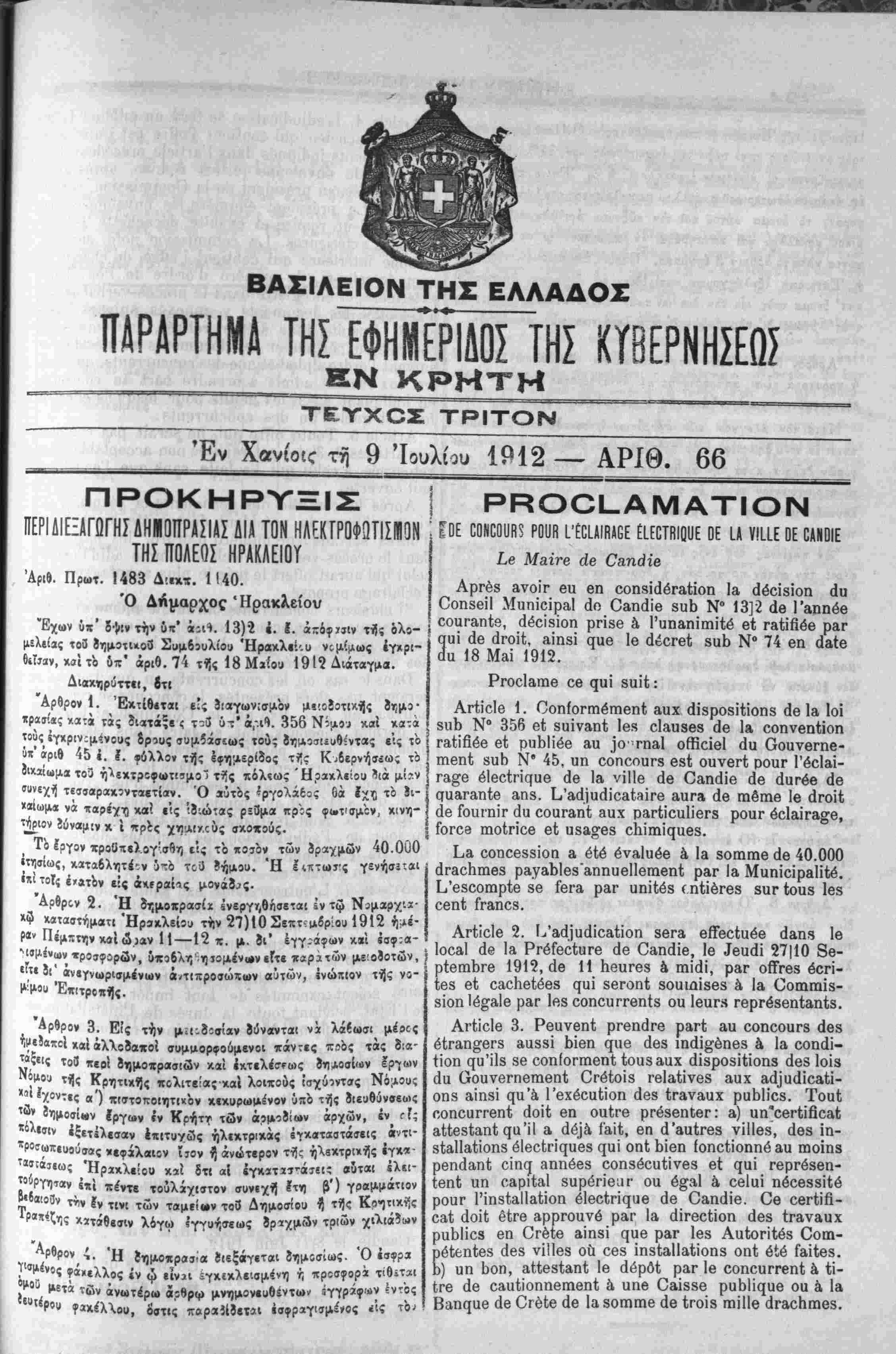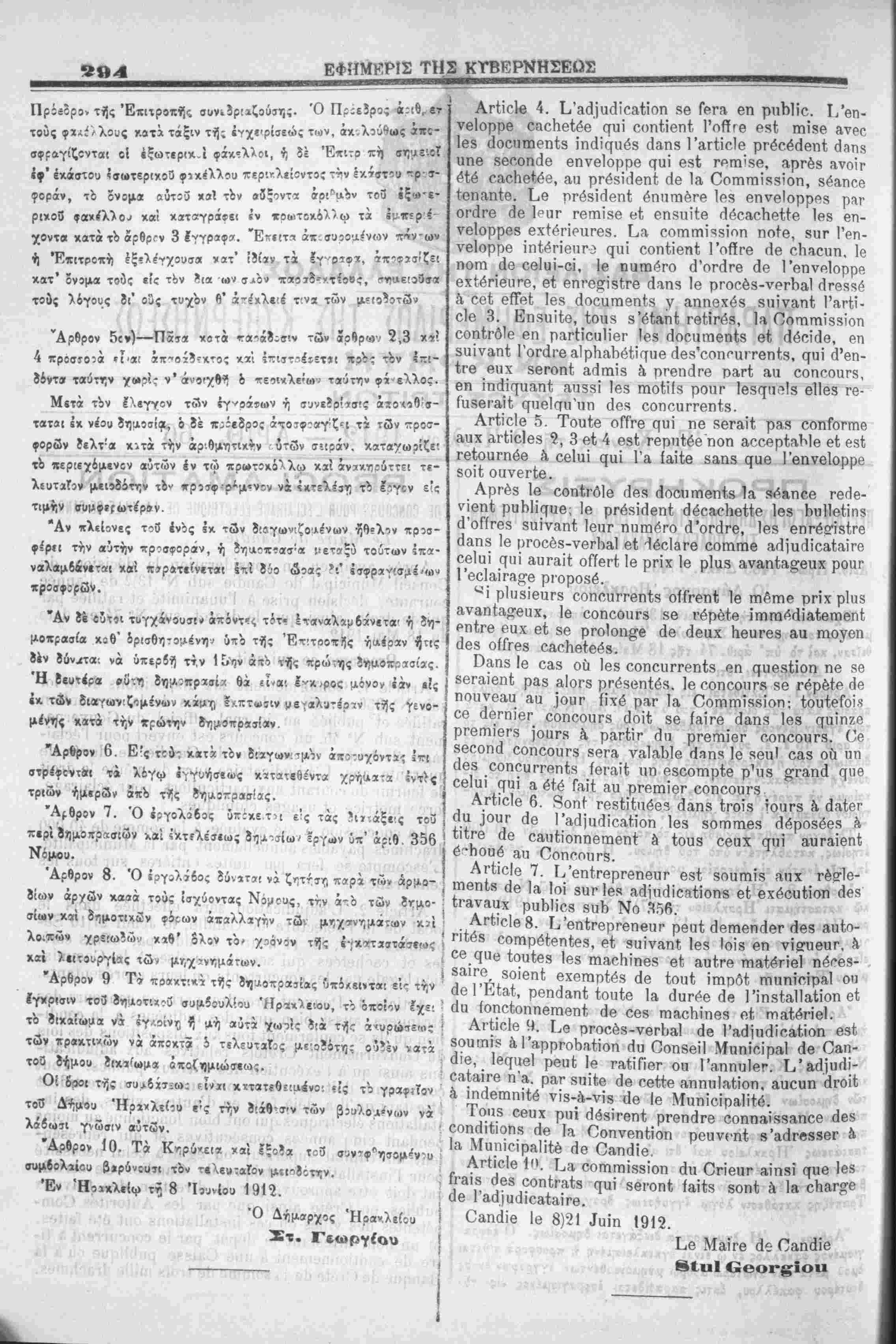 >ι καταστήματι Ηρακλείου την 27)10 Σεπτυιδρΐου 1912 ή^έ- Ρ«ν Πέμπτην κοί ώιαν 11—12 π. μ. δι* εγγράφων κ*ί έσφ;α- Μίμίνιον «ροσφορών, ύ·κο6λη ηΐομέναν είτε «αρατών με'οϊοτών, 1 ϊι άνϊγνωριβμένων ά<τιπροσώτ[«»ν αυτών, ΐνώπιον τής νο- -' Έτ»τρο-τΙς. ΡΡΟΟΙ-ΑΐνΐΑΤΊΟΝ ϋΟΝϋθυ«? ΡΟυΗ ίΈϋίΑΙΗΑΕΕ ΕίΕϋΤΒΙθυΕ ΰΕ ίΑ νΐίίΕ ϋΕ ΟΑΝΟΙΕ Ί^,β Μαϊνο άβ ϋ&ηάΐβ ρ ανοΪΓ βυ βη οοη8ΐα.όΓ3,ίίοη & άόοίδΐοπ άυ ΟοηβθΐΙ Μιιπϊοΐραΐ <1ο Ο&ΐκϋβ 8υ1) Ν0 13]2 άβ Γ&ηηόβ | οοιΐΓ&πίβ, άόοϊδίοη ρπδβ ^ Γυη3,ηίηιίί;6 βί Γ&ίήίΐόβ ρ&Γ υί άβ υΓθΐί, αίπδί ςαβ 1β άέθΓθί βαΐο Ν0 74 βη ά&ιβ 18 Μ&ί 1912· «5ί^^^ 06 81ΐΐί : ΑγϊιΌΙθ 1. ΟοηίθΓΓηΟΓηβηι αυχ άϊδροδίΐΐοηδ άβ ά Ιοΐ ΐ Ν° 356 βί δυϊνβ,ηΐ 1β8 οΐειυβββ άβ 1» οοηνβηιϊοη ΓΆΪΐ&έβ βί ριιΐοΐίβ'β »ϋ ]θ' γπ3,1 οίτιοίθΐ άα ΟοιινβΓηβ- ΐηβηί βυτ) Ν" 45, υη οοηοουΓδ βδί ουνβΗ; ρουΓ Γ6ο1»ί- Γίΐ^β όΐβοίπςαβ άβ 1& νϋΐβ (1β Οβηάϊβ άβ άυχθ'β άβ ααβ,Γίΐηίβ 3.Π8. Ι_ι'3,άίΐΐάΪ0£ΐί3ΪΓ6 &υΓ» άθ ΓΠέΠΙΘ 1β άΓΟΪί άβ Γοιιγπϊγ άα οοαΓ&ηί 3ΐιχ ρ»Γϋοα1ίβΓ8 ρουΓ έοΙήΓ&^β, ίθΓθβ πιοιπΌβ βί ϋ8&ο;βδ οΐιϊΐηΐηυβδ. ^£ι οοηοβδδϊοη ά έϊέ ένΆΐυέβ ίι ά δθΓηπιβ άβ 40.000 άΓ3θ1ιΐηβ8 ρ&γεΐΓοΙβδαηηυβΙΙβτηβηί ρ»Γ Ι» Μυηΐοΐρβΐϋό. ^'β8^ο^ηρίβ δβ ίβΓ» ραΓ υηϋβδ (ηίίβΓβδ δΐΐΓίοιΐδ Ιβδ οβηί ί τ,·. 2. Ι/Εΐάϊυάϊο&ίίοη δβΓ» θίΤβοΙαέβ άβ,η^ 1θ [ οοά άβ 1» ΡΓβΤβοίυτβ άβ Οϋηάίβ, 1β ^βϋά^ 27)10 8β- | ρίβπιΙΐΓβ 1912, άβ 11 ΙιβυΓβδ 4 ηιϊάΐ, ρ»Γ οίΪΓβδ έοή- ίβ8 βί οαοΗβίέβδ ςαϊ δβΓοηί δοιιιαϊδβδ ^ 1& ϋοιηππδ- ΙΙ ΆΓ Ιβδ οοηοιΐΓΓθηΐδ ου ΙβιΐΓ.·* ΓβρΓόδβηίαηίδ. ο* 3. Είς την μ.ι:8οσίαν δύνανται νά λάίωσι^ μς ,ί χβ'( «λο8α-οί συμιιορφούμενοι ιτάντες ττβος τάς δ:α- ταξεις τοί περΐ δημοπρασιών καί εκτελέσεως δηΑοσίιβν έργων ,^ου Τί<: Κρητικϊ)ς πολιτβ!ας·κα1 λοιπους ΐσχύ?ντοις Νόμους ««ιίχοντες α') πιστοποιητιχόν κεκυρωμένον υπό τής διευθύνσεως ™» ίημοσί«ν !ργων ίν Κρήττ των άομοδιων άρχών, έν^ τί; «λεσΐν ίξετΐλεσαν έπιτυγώς ήλεκτρικάς ενκατβστάσεις άντι- ΙΡθσωπευούσας κεφάλαιον ίτον % ανώτερον τή; ήλεκτριχής εγκ*- Τ»»;«ΐεως Ηρακλείου καί δτι αί ίγκατΐσ'-ά-εις βδται ΐλει- "οργηταν επί πέντε τουλάχιστον συνεχή 2τη &') γοαμμάτ'ον Ρ«β«ο3ν τ»ιν ίν τινι των ταμείβν το3 Δημοσίου ί τβς Κο«)πκής Ρ"'*ζης κατίθεσΐν λόγω ίγγυήσεως δρΐχμΛν τριών χιλιάδων ΑρβρΟν 4, Ή ϊημοχρασ.α ίιεξάγεται ίημοσίως. Ό έσφρα Τ «μίνβς φβχ(λχΟς ^ν ψ $Ινη ίγχίχλβιομ^νη ή προσφορά τιθ.ται μ μετα τών ανωτέρω άοθρφ μνημονευθίντων 5γγράφ'ι>ν έντός