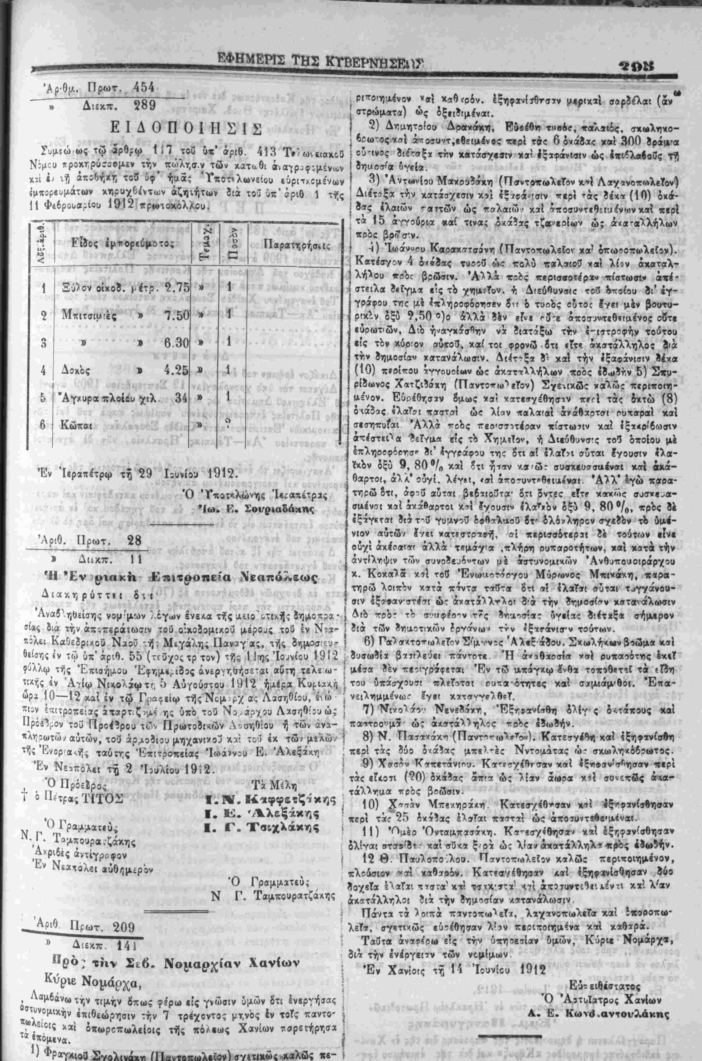 πλούσιον "« καθϊβόν. Κατ·β/έβη<ΐϊν Α«ί ίξηφοινίσθησαν ίόο ϊοχβΤα ΙλαΤαι ττκστα'κ·»! "*χ·ίτχ! <7ΐ άιτίΐιιντ-:1*»1 «νίνχΐ κα'. λ'βν άκατίλληλθ! ?ιά την δημισίαν Λ"ανάλωσιν Πάντα τ» )οιπά ιτίντίπΐΛ^εΤϊ, λαχανοπωλεΤα καί ίποβοπ»· λε?ϊ, σγ«τι»ώς ευρέθησαν λ!?ν χεοιτοιημ^να κΐί κχΒχρά. Τα3τβ άναϊ^ρω είς ττιν ϋχη3εσία» δμών, Κύριΐ Νομβρχ*, 8ιΐ τή» ένίργεΐϊν των νομίμων Έν Χανίοις τη 14 Ίουνίου ■{V Ο ·%■<*·% Ι -Εην τιμήν 8πως φέρω είς γνώσιν ί.μων δ'τ; ενεργήσας ' έπιθϊώρησιν την 7 τρέχοντος μτ,νός έν τοίς παντο- | β' έχωροπωλεΐοις τής πόλεως Χανίων τορετήρησα . Σνολινάκγι ίΠαντοπωλεϊον) σγίτΐκώς καλώς «- λ- 1912 Εύ- ειθεστατος Ό Άϊτι<ϊατρος Χανίων Α.] Ε. Κωνβ.ανϊονλάκης 4" *** -ε