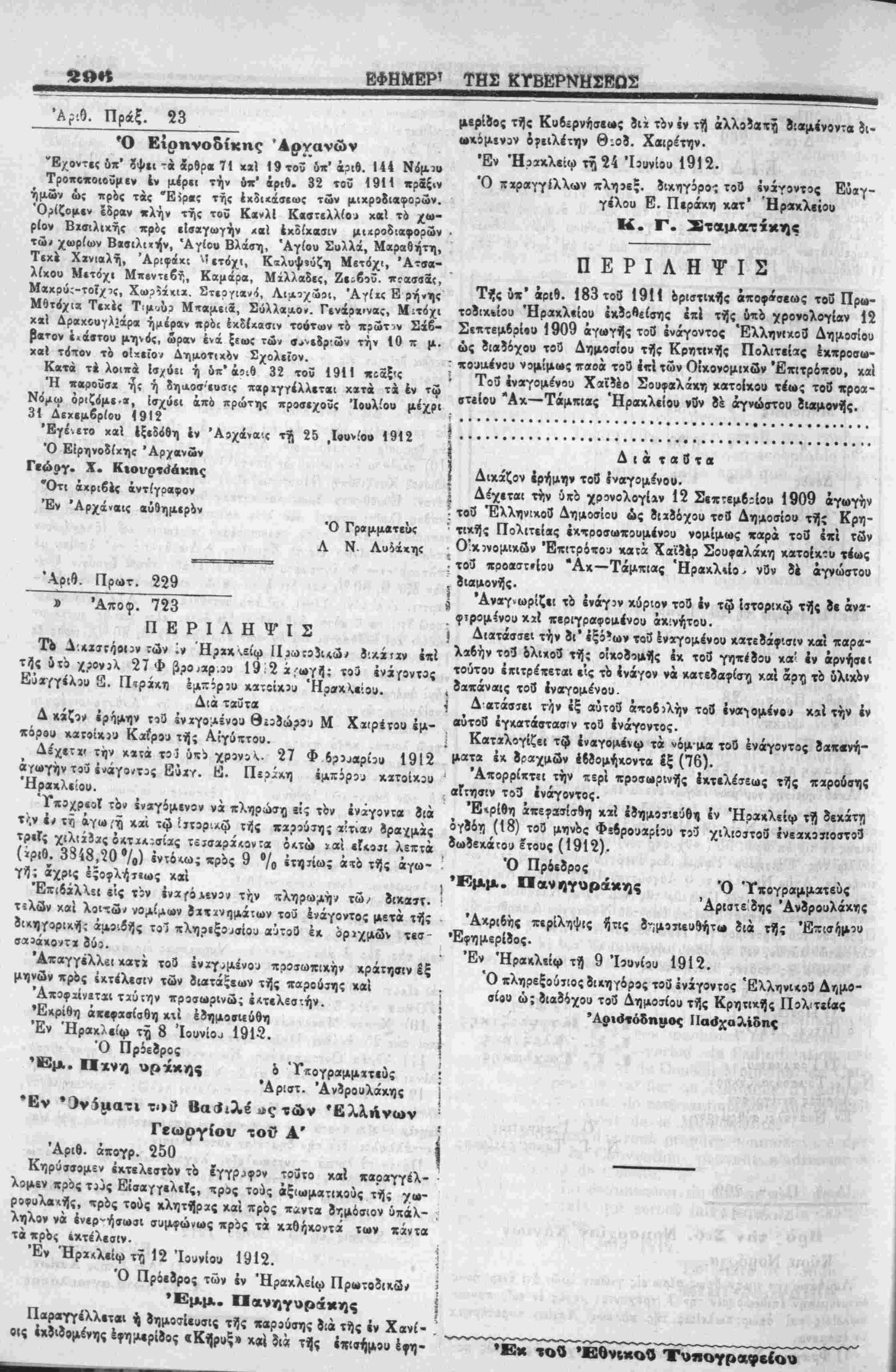 Έγέ.ίτο χαι έξ«5ο8η έν Ά»χάνα<< τή 25 ,Ιβυνίο» 1912 Ό Είρηνοδίχης Άρνανών Γιώογ. Χ. Κ«ονο«4βκης Ότι άχριβέΐ άντίγοαφον Έν Άρχαναις αύ9ημιρον Ό Γραμματεύς Λ Ν Λ»4άχη« μερίδος τί)ς Κυβίρνήσεβς δι» τόν άν τί} άλλυϊατίί Ϊ!«μίνοντα δι- βχόμίναν όρειλέτην θ.οί. Χβιρέτην. Έν Ήίϊκλβιω τί 24 Ίουνίου 1912. 4 ,.| Ό πϊραγγίλ«ν πληϊβξ. δικηγόρον τοθ «νάγ9ντ5ς Εύαγ- γίλου Ε. Περάκη κβτ' Ηρακλείου Κ. Γ. Σταματάκης ΠΕΡΙΛΗΨΙΣ Τί|ς δ*' *ρΐ9- 183 τοθ 1911 βριστικτΐς αποφάσεως τού Πρ<*- το3ικ*ίοι> ΉρΛχλίίου έκϊοίείσης επί τή*ς όιτο χρονολογίαν 12
