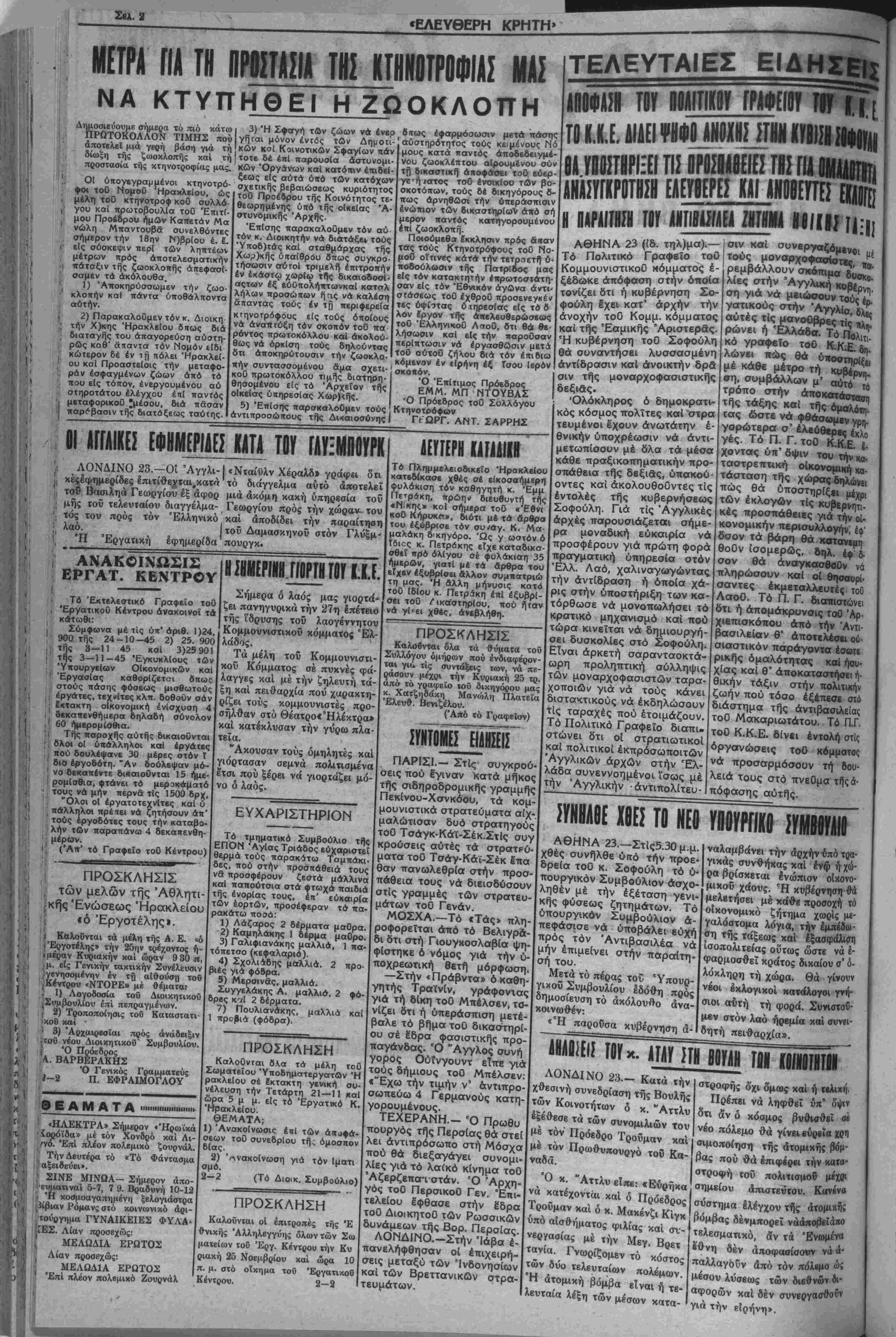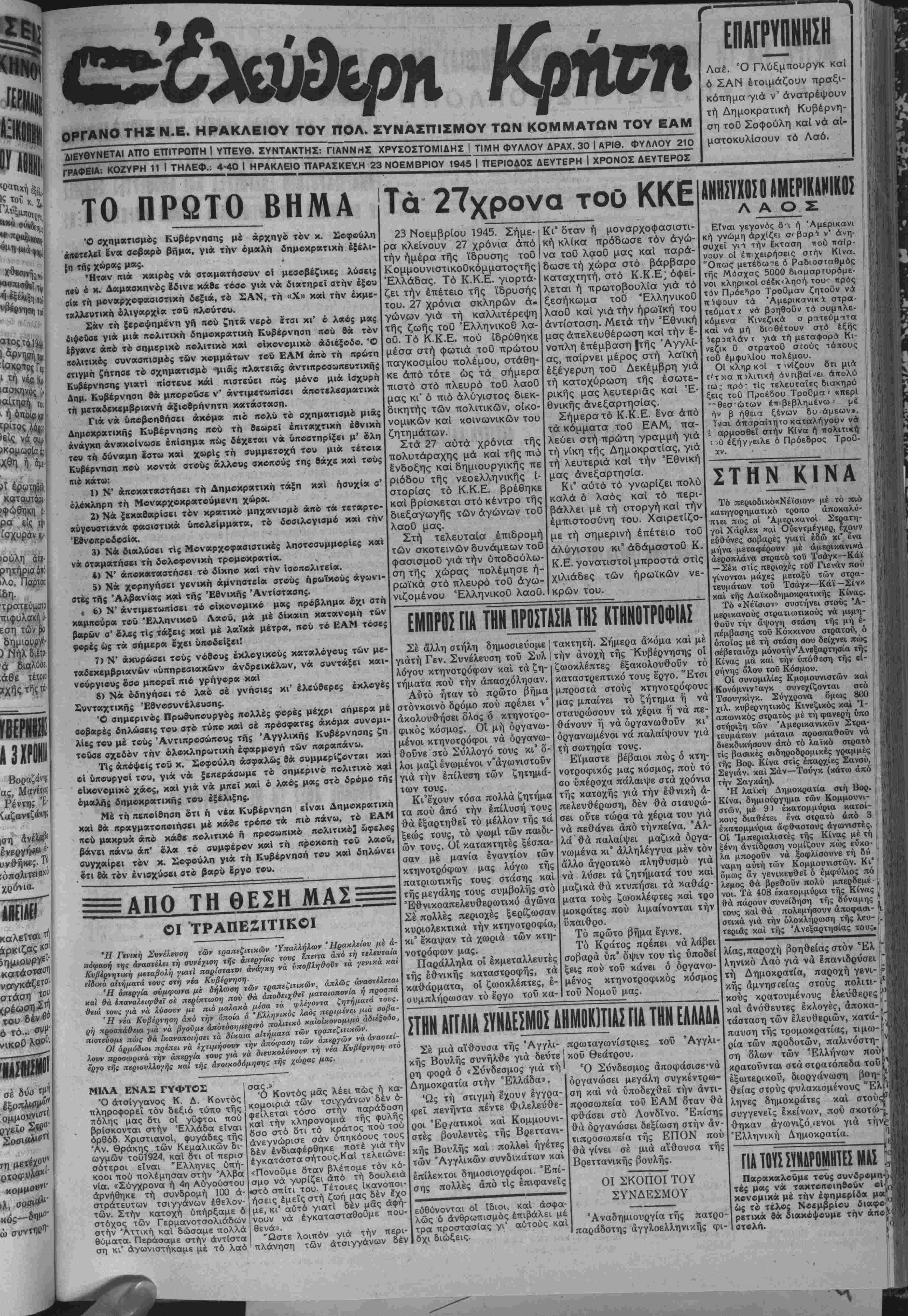ΓΡΑΦΕΙΑ: ΚΟΖΥΡΗ 11 Ι ΤΗΛΕΦ.: 4-40 Ι ΗΡΑΚΛΕΙΟ ΤΤΑΡΑΣΚΕΥ.Η 23 ΝΟΕΜΒΡΙΟΥ 1945 Ι ΠΕΡΙΟΔΟΣ ΔΕΥΤΕΡΗ | ΧΡΟΝΟΣ ΔΕΥΤΕΡΟΣ