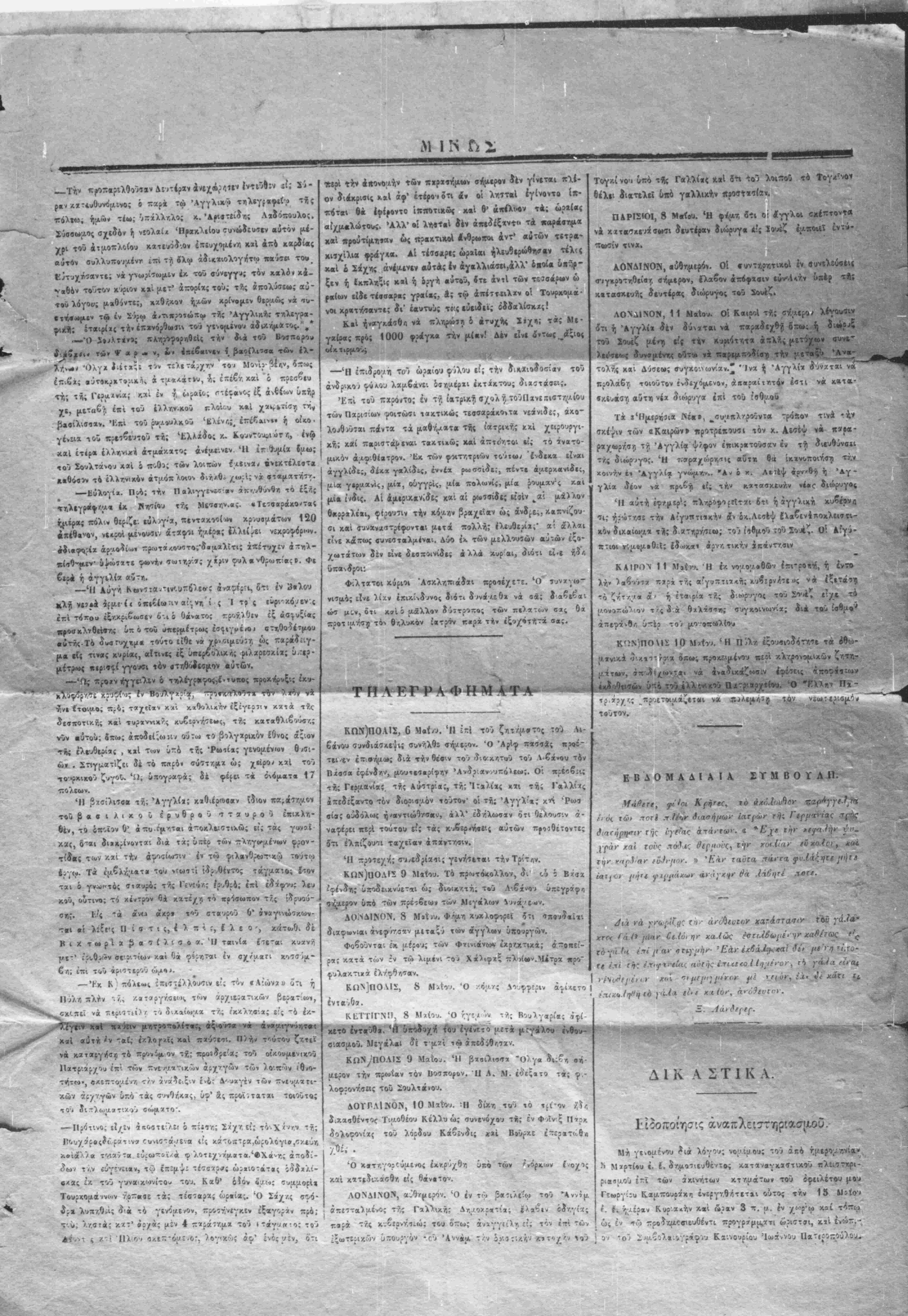 κά/τοτβ έν άγωνί<χ,'πάτθ"ίε μετά προ-ρΑάξεω; εζερ- ^'όρΐίία εί; τα; έδοϋ;. φοβούμενοι μή πέσωμεν ®ορρά εις την λύσσιν των οίλθ^όρων έ-ίδικητών. Καί είναι μέν άλ^Οέ; βτι αί άστυνομ'καΐ τή; πόλεω; αρχαί έν ' ται; περιστάίεσιν εύόρκω; έ/.*ληρουαι το καθξ- ;ών καί λΛμοάνοντα», έ^ίοτε έχτσκτα ΐιέτρα, ως ^^^^^^Γ*^εΡτ^ΜΡI^Κ^εΛΟόντ¥'^β^.ιβν, ^τι Ίπΐ^ας ά"** έπαζεί/»οΟνΐο; χΐνΒύνου ίηΐ τω φόν^ όθω- ι; άπεσΐάλη όλόχληρον στί,αηωτίκόν τάγ~ μα εχ Χανίων, άλλ' ού.ε ή <5ρασ:ηριό:η; των άιυ- νθμ.κών ίρχών, ου:ε η ληψι; προσκαίρου μέτρων ού- αυτή παραδείγματι*^ χα σωφι>»ν:ίτιχή διά