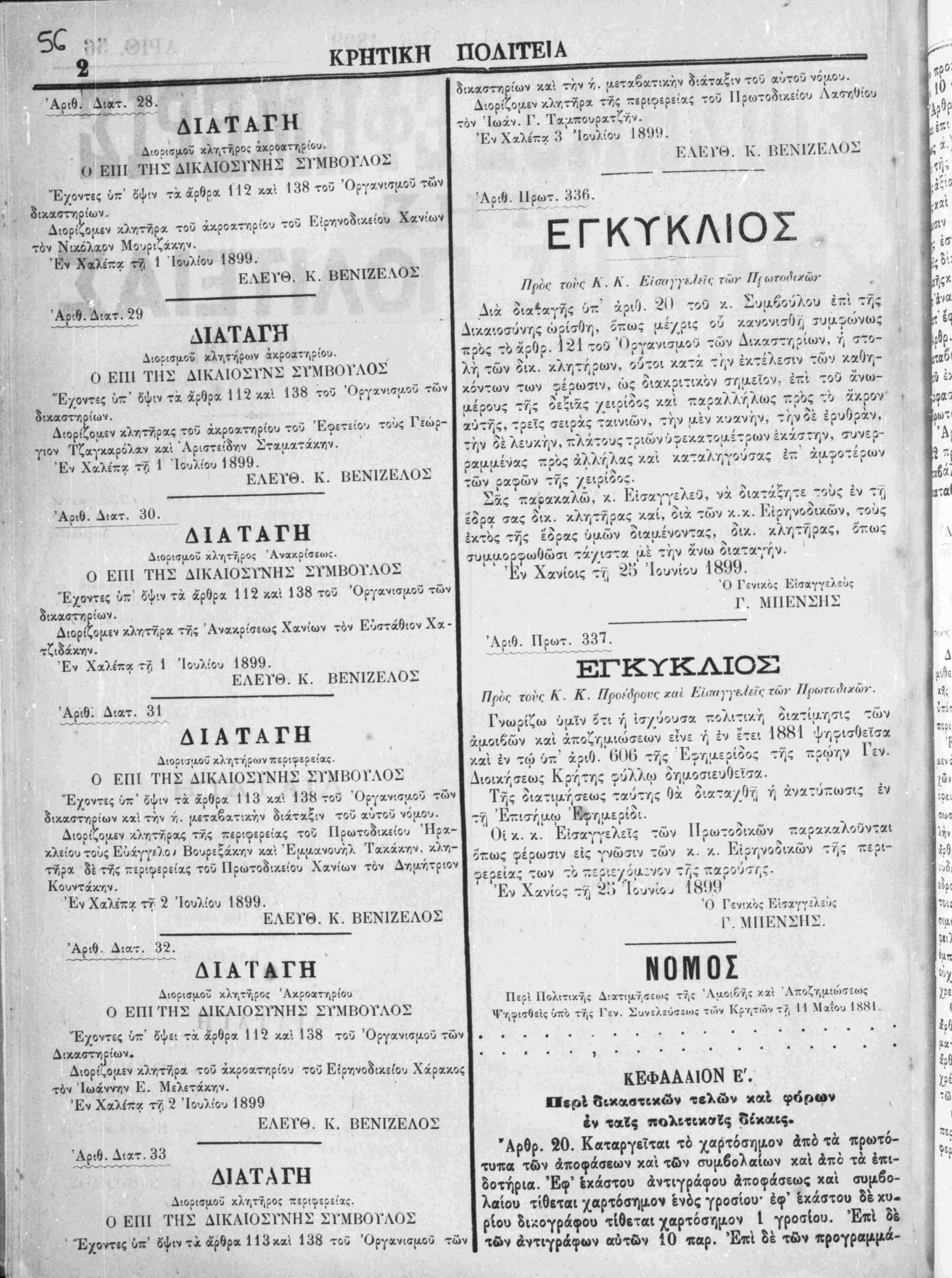 ΆρΛ.Διατ.29 * -* < ~~ ΛΙΑΤΑΓΗ Ο ΕΠΙ ΤΗΣ* ΔΙΚΑΙΟΣΓΝΣ ΣΥΜΒΟΥΛΟΝ Έχοντες ύχ' δψ'.ν τχ αρθρα 112 χχ· 138 τού Όργχν^ού των ό^κασττ,ρίων. Διορίςοαεν κλτ,ττίρας τού άκροχτηρίου τού Έοετείου τους Γεώρ¬ γιον Τζαγκαρόλαν καΐ Αριστείδην Στα;ι.ατάκτ,ν. Έν Χαλέ-χ τξ 1 Ιουλίου 1899. ΕΛΕΥΘ. Κ. ΒΕΝΙΖΕΛΟΣ ί . > -^