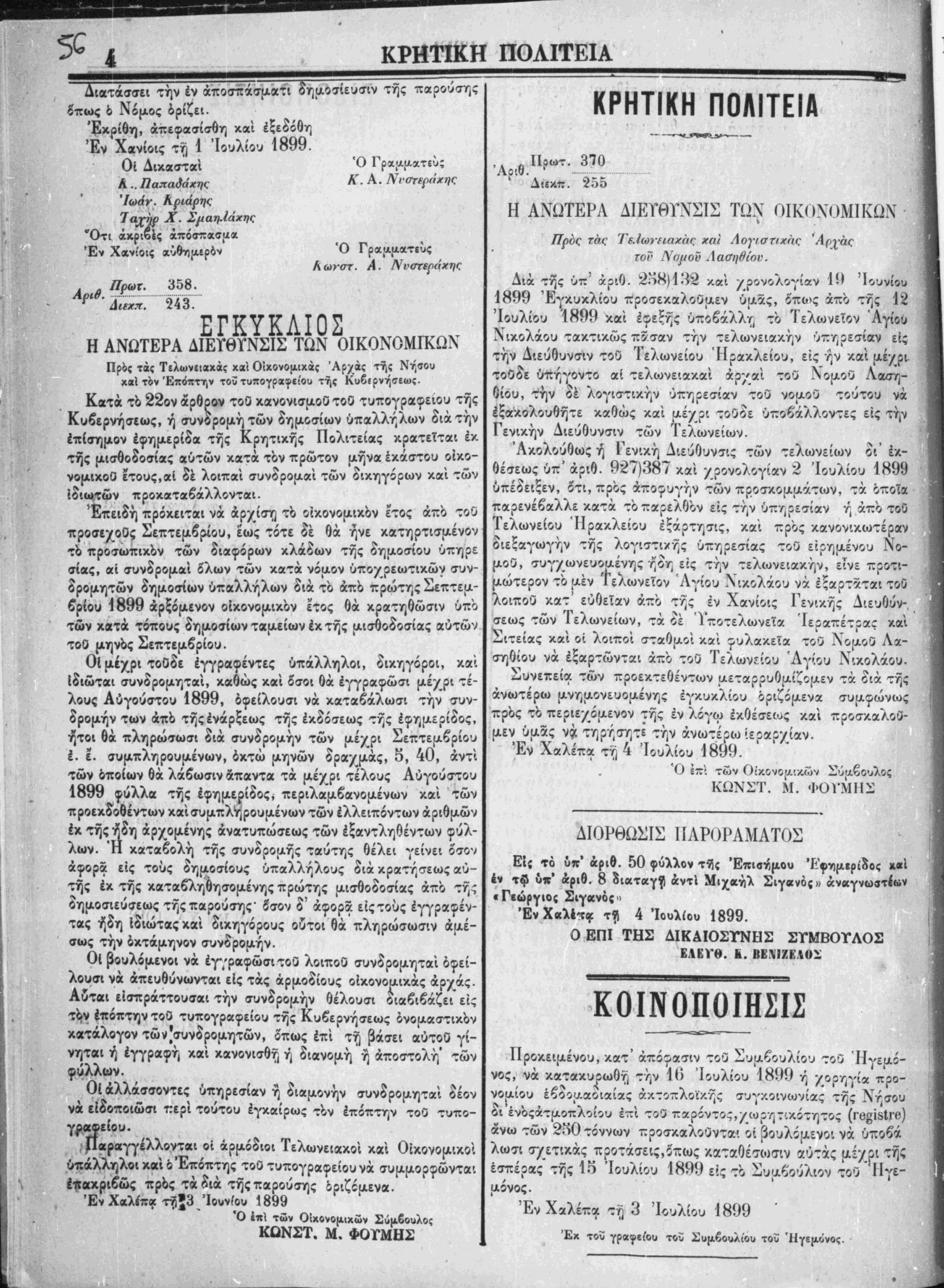1899 φύλλα τής εφημερίδος* περιλαμβανομένων καί των