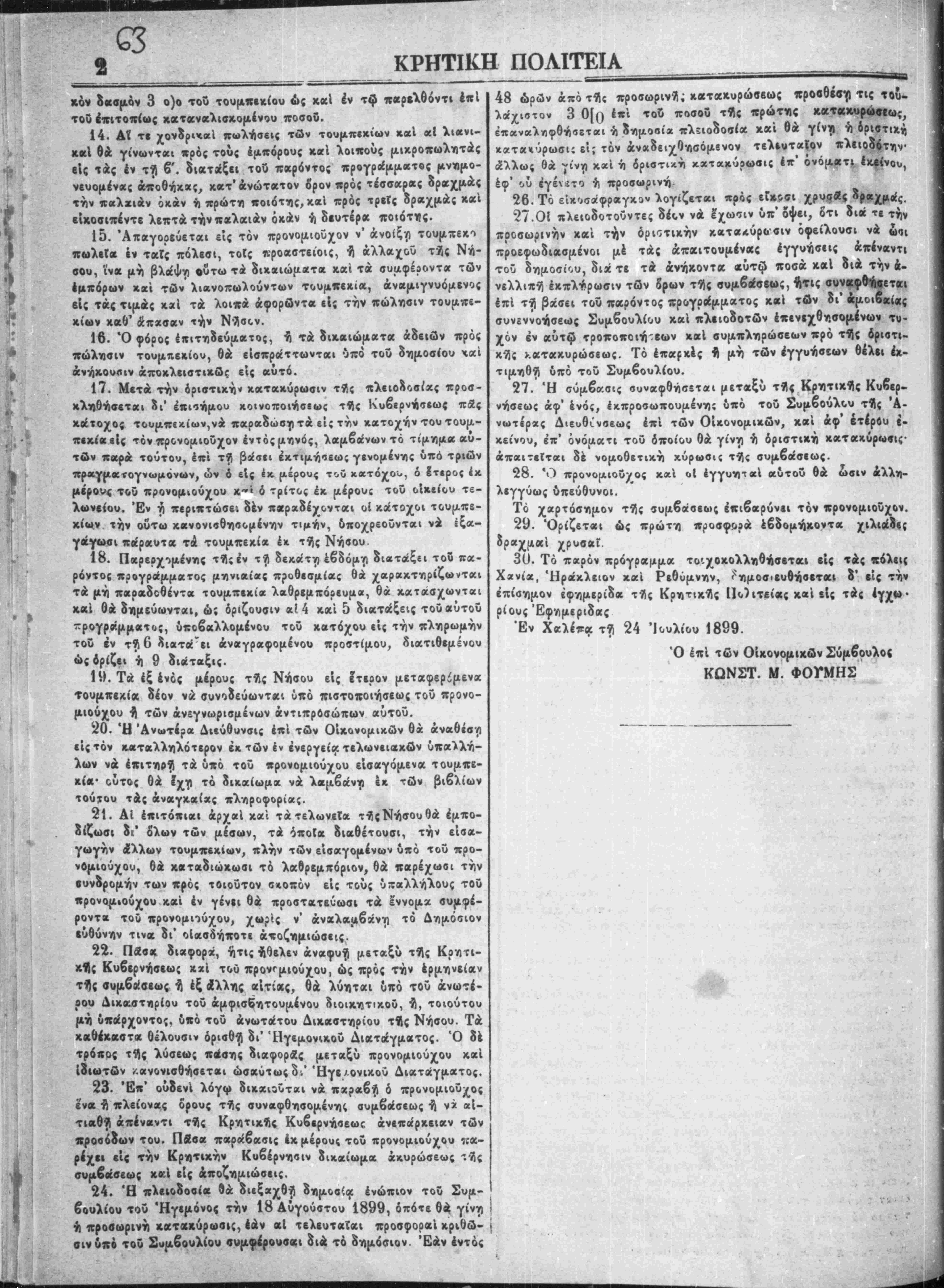 22. Π<2σχ διχφορχ, ητίς ήθελεν άναφυίϊ μεταξύ τΐ,ς Κρητι- *1|ς Κυβερνήσεως χ-ΐ τού προνΓμιούχου, ώς πρός την έρμηνείαν τής συμβάσεως 4 έξ 4λλης αΐτίας, θά λύηται υπό τού άνωτέ- ρου Διχαστηρίου τού αμφισζητουμένου διοιχητιχου, Α, τοιούτου μη δπβίρχοντος, υπό τού ανωτάτου Διχαστηρίου τίΐς Νήσου. Τα χαθέχαστα θέλουσιν ορισθή δι' Έγεμονιχου Διατάγματος. Ό δέ τρόβρς τΐ|ς λύσεως πάσης διαφοράς μεταξύ προνομιούχου χαΐ ίδιωτών /,ανονισθήσεται ωσαύτως δ·/ Ήγΐ/ονιχου Διατάγματος. 23. Επ* ούδενΐ λόγφ διχχιούται νά <κχ%9&$ 6 προνομιούχος πλείονας δρους τϋς συναφθησομένης συμβάσεως ί, νζ αί- ^ άπέναντι τίς Κρητιχ^ς Κυβερνήσεως ανεπάρκειαν των ^ύδων τού. ΠΛσα παράβασις έχ μέρους τού προνομιούχον ~α- ρέχει είς την Κρητιχην Κυβέρνησιν διχαίωμα αχυρώσεως ζΊις συμβάσεως »«1 «ίς αποζημιώσεις. 24. Ή πΑειοδοοία θά διεξαχθή δημοσία ενώπιον τού Συμ¬ βουλιον τού Ήγεμόνος την 18 Αύγούστου 1899, ίπότε θά. γίνη 4ΐ προσωρινη χαταχύρωσις, λάν αί τελευταίαι προσφοραι χριθώ- { σιν υπο τού Συμβουλιον συμφέρουσαν διά τό δημόσιον. Εάν έντός ενα 48 ώρών άποτίΐς προσωρινάς χαταχυρώσβως προσθέση τις του¬ λάχιστον 3 0[() επί τοΰ ποσου τίς πρώτης χαταχυρωσΐως^ επαναΑηφθησεται % δημοσία πλειοδοΐία χαι θά γίν^ τί Αρΐστιχ^ ιιατα^ύρωσι: εί; τόν ανοιχθησόμενον τελευταίον πλειοδ^την* άλλως θά γίνγ, κ«ί ή δριστικη χατα^ύρωσις έπ' όνόι^Λτι Ιχείνου, έφ' ού ιίγέδτο ^ προσωρινή " ? γ ρρ 2β.Τό είχοσάφραγχον λογίζεται πρός εΓχ^σι χ χμς 27.01 πλειοδοτουντες δέςν νά έχωσιν ύπ'όψει, ότι διά τε την ποοσωρινην χαί την όριστιχην χαταχύρνσιν οφείλουσι νά ωοι προεφωδιασμένοι μέ τάς απαιτουμένας έγγυήσεις άπέναντι τοΰ δημοσίου, διά τε τα άνήχοντα αύτφ ποσά χαί διά την ά- νελλιπ9ί έχπλΐρωσιν των βρων τ^|ς συμβάσεως, %τις συναφθήιεται ω δ1 άβ νελλιπ9ί έχπλΐρωσιν τω βρ |ς μς, φ επί τί! βάσει τού παρόντος προγρβίμματος χαι των δι1 άμοιβα(ας συνεννοήσεως Συμβουλ(ου χαί πλειοδοτών έπενεχθησομένων τυ¬ χόν έν αύτ^ τροποποιή^εων χαί συμπλήρωσιν πρό τ^ς δριστι· έ ϋ ω έή θέλ έ χ ^ ρή μρ ρ χ·?1ς καταχυρώσεως. Τό έπαρχές ϋ μη των έγγυήσεων θέλει έχ- τιμηθ^Ί υπό τοΰ Συμβουλ(ου. 27. Ή σύμβασις συναφθήσεται μεταξύ τ^*; Κρ*ϊτιχ$ς Κυβερ¬ Σβύλ Α μς φ μ ρ νήσεως αφ* ενός, έχπροσωπουμένη; υπό τού Συμβθύλου τίς Α¬ νωτέρας Διευθύνσεως επί των Οίχονομιχών, χαί άφ ετέρου ε* χείνου, έπ' ονόματι τού δποίου θά γίνη ίϊ όριστιχή χαταχύρωσις- άπαιτΐΐται δέ νομοθετιχη χύρωσις τ^ς συμβάσεως. 28. *»") προνομιούχος χαί οί έγγυηταί αυτού θά ώσιν αλλη- λεγγύως ύπεύθυνοι. Τό χαρτόσημον τής συμβάσεως έπιβαρύνβι τόν προνομιούχον. 29. Όρίζεται ώς πρώτη προσφορά εβδομήκοντα χιλι^δΐς ίραχμαί χρυσαΓ. 30. Τό παρόν πρόγραμμα τοιχοχολληθήσεται εις τάς κέλεις Χ, Ηράκλειον χαι Ρεθύμνην, δημοσιευθήσεται δ* είς την δ ρ μ, μ επίσημον εφημερίδα τ-Τ,ς Κρητιχ^ς []ο)ιτ£ίας χαί είς τάς έγχ# ρίους Εφημερίδας Έ Έν Χαλέπα τ? 24 Ιουλίου 1899. Ό επί των Οίχονομιχών Σύμβουλος ΚΩΝΣΤ. Μ. ΦΟΓΜΗΣ ' αϊ: -1