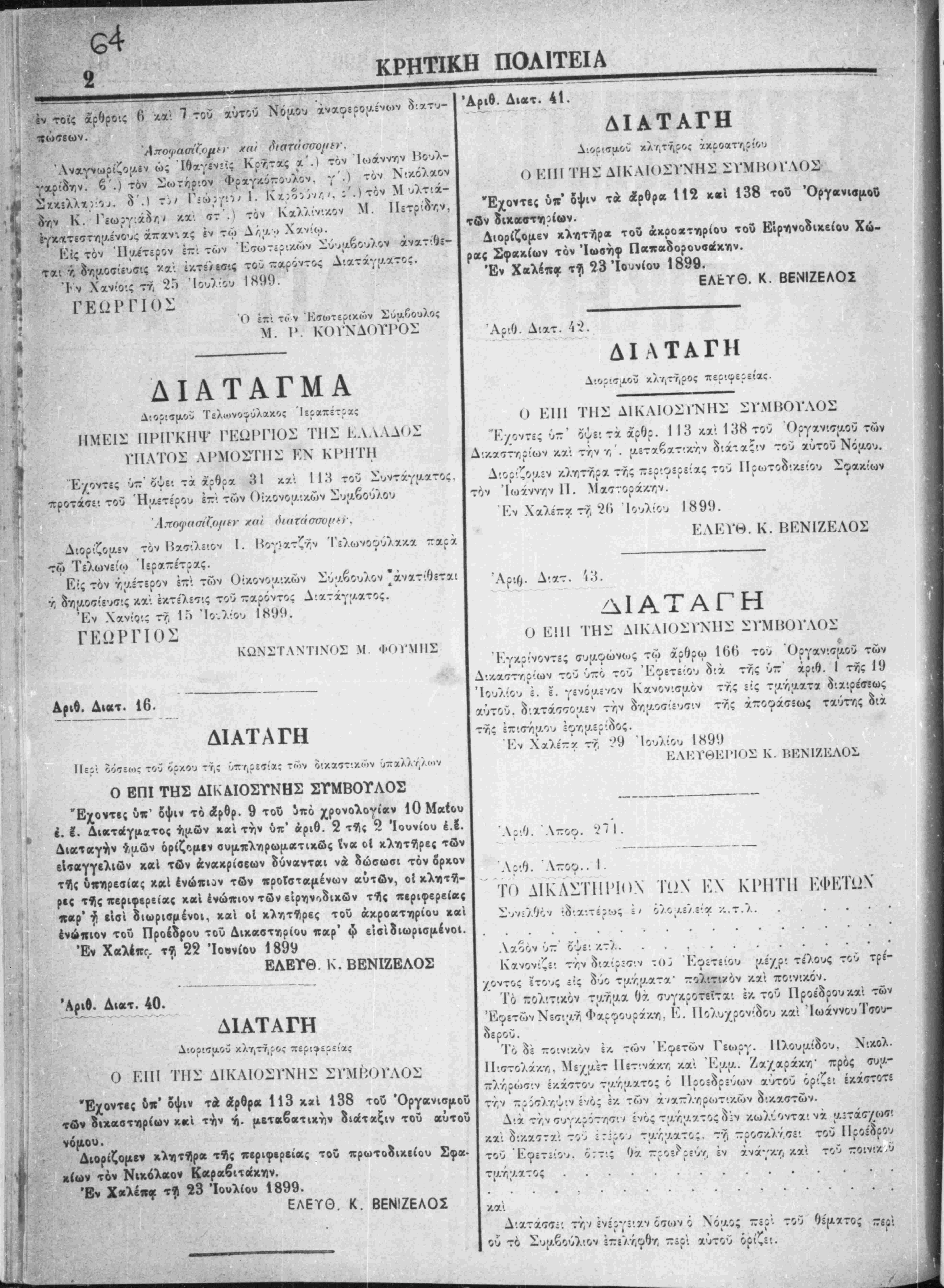 "Αγιον Μυρωνχ, ττυ -χργΞίου Ιϊεδιάδος τό χωρίον Κα<ττίλλίον τρχν. τιυ έττχρνξίου 1"·.τ$ία: τί:ν /.ωαόττολί */;ν κω;ΛΟτ70Λ·.ν ν Κ ι; τόν Ην.έτδρον έ-·, των Εξωτερικών Σύμβουλον άνατίίετχ*. τ, οη^οσίευτ'.ς κχ· έκ,τίλΕΤ'.; τού τταρόντο; Δΐχτχγαχτο;. 'Κν Χχνίο.; 27 Ίο,νου Ι8!)ί). '(► επί τ.ον Έΐίυτεοικών _ύαβουλος Μ. Γ. ΚΟΙ'ΝΛΟΤΡΟΣ ΔΙΔΤ&ΓΜΑ ·* ΗΜΕΙΣ ΙΙΙΜΓΚΙΡΓ ΓΕΩΡΓΙΟΣ ΊΊΙΣ ΕΛΛΛΛΟΣ α^ νΠΤΟΣ ΛΡΜΟΣΤΠΣ ΕΝ ΚΡΗΤΗ . ·' Έχοντες υ- όψει τ χ χ:():χ 31 κχι 113 τού Συ/τχγαχνος κχ· "ίθ τον Λ·ο·./.τ(τ·/Λου ()ργχν·.ί7|Λθυ. ττροτχσε. 6ε τού Ήαε.ερου επί .1 < 4 Τ Λιορίζοαεν Ί1 τχργον Κ^ωνίχ; τόν Κ, Στχυρχκάκην, Κ·.σ, Σφχ-
