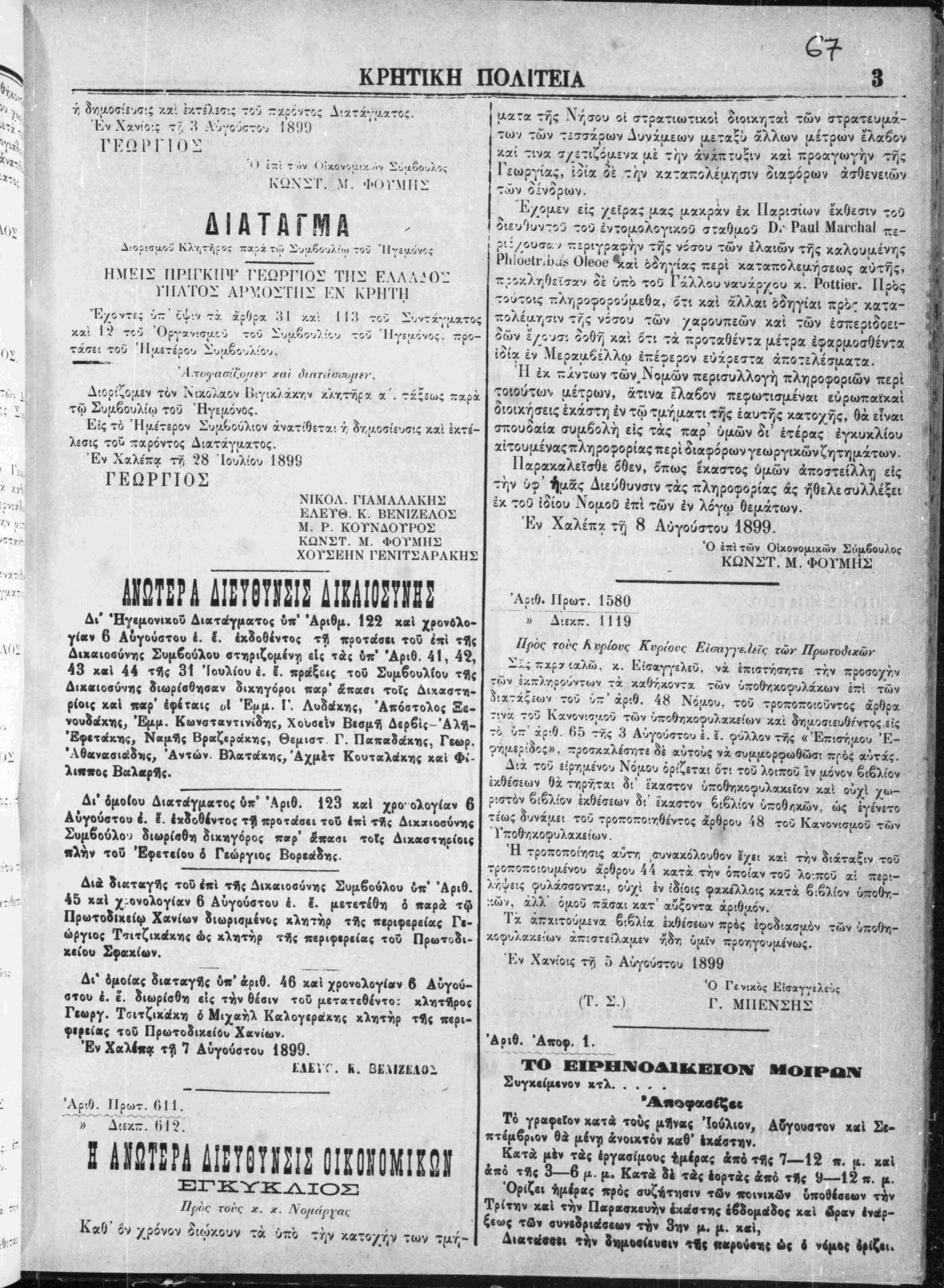ΪΕ< . Κ. ΒΕΛΙΖ_ΛΟ_ Έν Χανίοις τη 5 Αύγούστου 1899 ΐ Ό Γενικος (Τ. Σ.) Γ. ΜΠΕΝΣΗΣ ΧΟ ΜΟΙΡΑΝ ιθ. ΙΙρωτ. 011. ι ιμη ίΐιηηιιι οιεοιτομιε Έ3Γ1 ΚΥΚΑΙΟΣ3 Πρός τονς χ. χ. Νομάρχας ν , ΚαΟ' όν χρόνον διωκουν τα Οπο την κατο/ήν των Το γράφον κατά τού( (χ1|ν«ς Ιούλιον, Δδγο^τον %χ Σί- πτίιιβρ·ον 02 (χίντρ ανοικτόν χ«0' Ιχβίατΐήν. Κατά μέν τάς Ιργασίιχους ±μ>ίγχς ά*ότ1.ς 7—-12 *. μ. χ*1