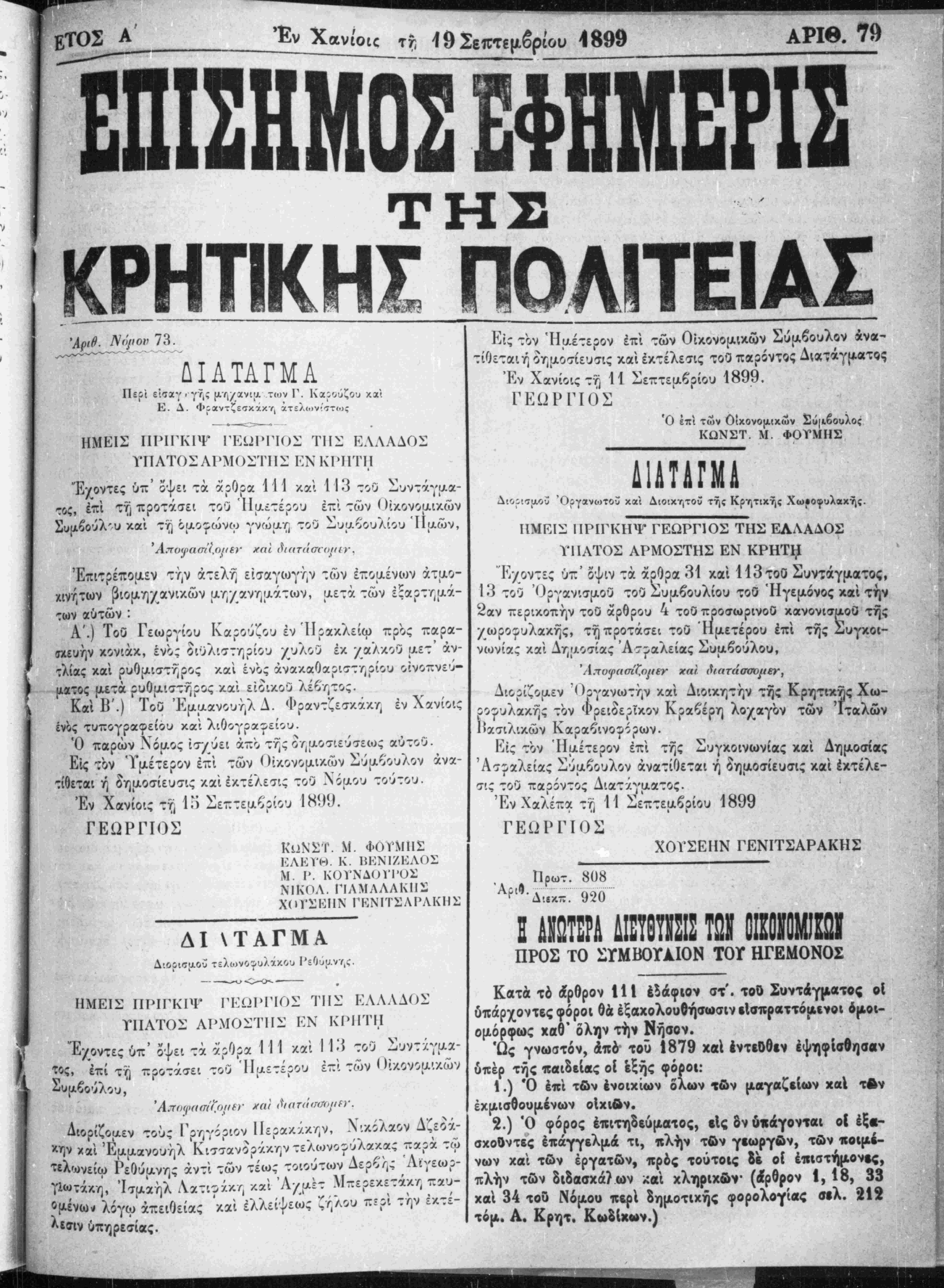Περι είσαγ . γ^ς μη/ανια τ<ον Γ. Καρούζου και Κ. Λ. Φραντζεσκάκη ατε/^ον'στίος ΗΜΕΙΣ ΓΙΡΙΓΚΙΨ ΙΈ12ΙΊΊΟΣ ΤΗΣ ΕΛΛΑΔΟΣ ΥΙΙΑΤΟΣΛΡΜΟΣΤΠΣ ΚΝ ΚΙΉΤΠ ι Έχοντες ύττ' όψει τα αρθρα 1 11 καί 1 13 τού Συντάγαα τοζ, έ^ί τΫ) ττροτάσει τοθ ΊΙμΐΐτέρου έζί των Πίχονοαιχών Συμβούλ'υ καί τυ] όυιο^ώνω γνώυιγ; τού Συαζουλίου Πυιών, * Αποφασίζομεν χά ι Έπιτρέπομεν την άτελη εισαγωγήν των έζομένων άτμο- χινήτων βιομη/ανικών μτ//ανημάτων, μετα των εςαρτημά- των αυτών : Α.) Τοθ Γεωργίου Καρούζου εν Ηρακλείω πρός παρα¬ σκευήν κονιάκ, ένο; διΰλιστηρίου /υλοΰ έκ /αλκοθ μετ άν- τλίας καί ρυθμιστηρος καί ενός άνακαθαρ.στηρίου ο'.νο-νευ- ιχατος μετά ρυθμιστηρος καί είοικοϋ λέζ-ητος. Καί Β.) Τοθ Εμμανουήλ Λ. Φραντζεσκάκη έν Χανίοις έν^ς τυπογραφείου καί λιθογρα^είου. Ό παρών Χόμος ίσ*/ύει άπο τηςοημοσιευσεως αυτού. Είς τον Ύμέτερον επί των <Κκονομικών Σύμβουλον άνα- τίβεται ή δημοσίευσις καί εκτέλεσις τού λ ομού τούτου. Έν Χανίοις ττ, 1*) Σε~τεμζρίου ΙΗίΚ). ΓΕΩΡΓΙΟΣ ΚιΐΝϊΤ. Μ. ΦΟΪΜΙΙΣ ΚΛΚνΗ. Κ. ΗΚΝ1ΖΚΛΟΣ Μ. Ι*. ΚθνΝΛΟΙΊΌ-: ΝΙΚΟΛ. ΓΙΑΜΑΛΑΚΗΣ ΧίΠ'ΪΚΙΙΝ ΓΚΝΙΤΣΛΡΛΚ1ΙΣ Είς τον Ημέτερον επι των Οικονομικήν Σύμβουλον άνα- τίθεται ή δημοσίευσις και εκτέλεσις τοθ παρόντος Δ,ατάγματος ι4 -*ημοσίευσΐ; Έν Χανίοις τη 11 Σεπτεμβρίου 1899. ΓΕΩΡΓΙΟΣ -? Ά λ Ό επί των Οίκονομικών £ιί|«.βουλος ΚΩΝΣΤ. Μ. ΦΟΥΜΗΣ, ϋΑΤΑΓΜΑ - -Λ * < ΔΙ ΤΑΓΜΑ. Διορισαού τελο)νος»υλακου ΐΈθυυ.νν,ς. ΗΜΕΙΣ ΠΡΙΓΚΙΨ ΓΚϋΡΠΟΪ ΤΗΣ ΚΛΛΛΛΟΪ ΤΙΙΛΤΟ1 ΛΡΜΟΠΊΙ.: ΕΝ ΚΙΜΙΤΗ Έ τος Έ/οντες ύπ' όψει -Λ 5ρθρα 111 /αί Ι ΙΛ τού Συντΐγμα- , έι:ίτ?ΐ -ροτάσει τού ΊΙαετέρου έζι των < Ηκονομαών ζλ Δ'.ορισαου ΌργανοίΤθυ καί Διοικητου τής Κρητιχής Χω·οφυλακης. ΠΜΚΪΣ ΠΡΙΓΚΗΨ ΓΕΩΡΓΙΟΣ ΤΗΣ ΕΛΛΑΔΟΣ ^ % ΥΠΑΤΟΣ ΑΡΜΟΣΤΗΣ ΕΝ ΚΡΗΤΙ^ ί - ηί Ε*/όντε; Οτγ' όψιν τα αρθρα 31 χαί 113 τοθ Συντάγματος, 13 τού 'Οργανισμου τοθ _]υμβουλίου τοθ Ήγεμόνος καί την 2αν πξ,ρικοπτιν τοθ άρθρου 4 τοθ προσωρινοθ κανονισμοθ της /ωρο^υλακης, τϊ)προτάσει τοθ Ημετέρου επι τής Συγκοι¬ νωνίαν καΐ Δημοσίας Άτραλείας Συμβούλου, Αποφασίζομεν χαί &ατάσΌθμ€ν} " ^ ν Διορίζομεν Όργανωτήν καΐ Διοικητήν της Κρητική Χω- ρο-ρυλακης τον Φρειοερΐκον Κρα^έρη λοχαγον των 'Γταλών 1>ασιλικών Καρα^ινο^ίρων.