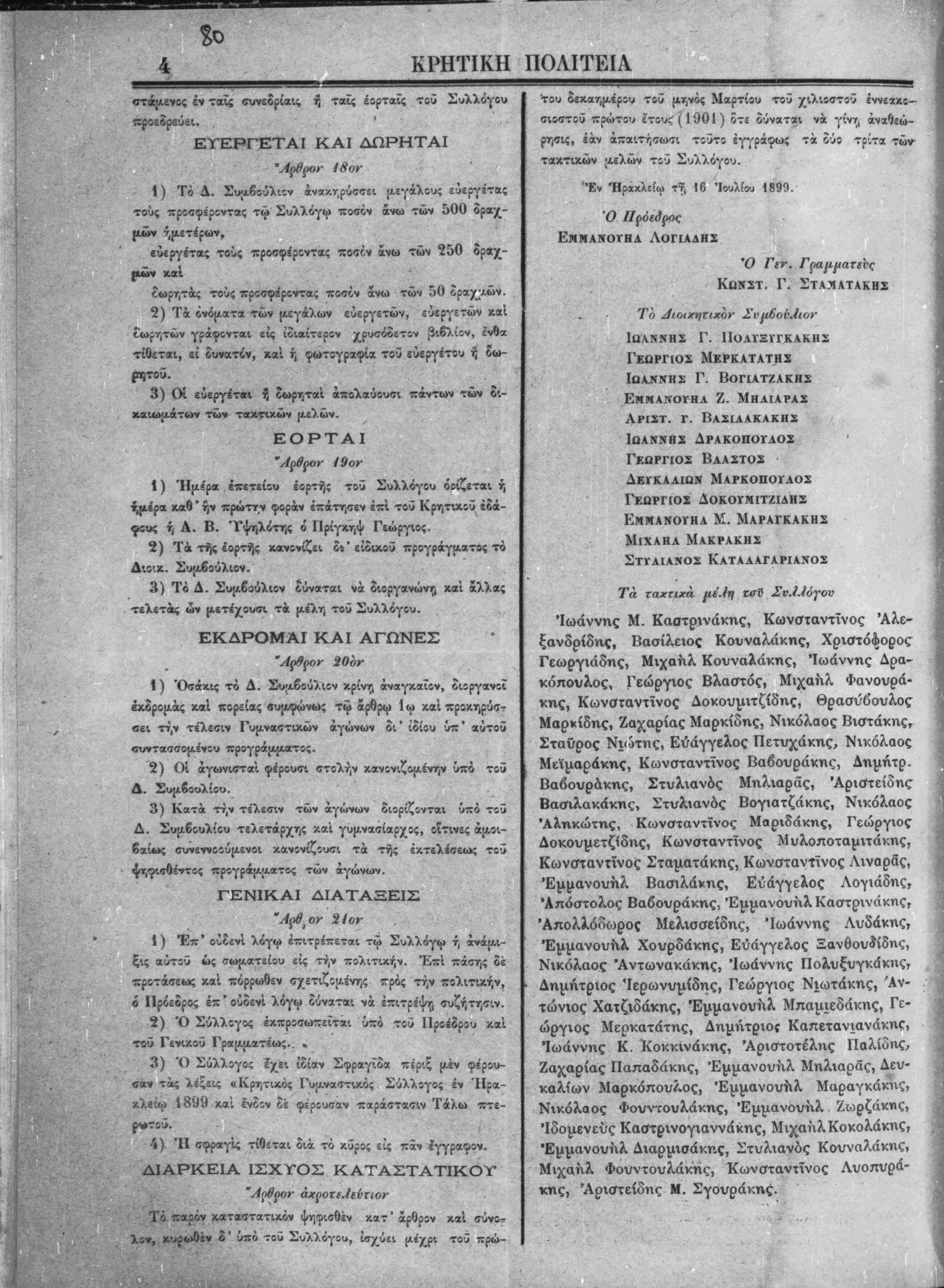 1) Ή*χέρα έπετεί&υ εορτής τοΰ Συλλ<5γου ό^ίζεται ή χαθ * ί^ν πρώττν φοράν έπάτησβν επί τοΰ Κρητιχοΰ ίίά- ή Α. Β. Ύψηλότης ό Πρίγκηψ Γεώργιος, 2) Τα της εορτής χαν&νίζει δΐι* είοιχον προγράγριατος τό Διοιχ. Συμβούλιον. 3) Το Δ. Συμβούλιον δύναται νά διοργανών^ χαί άλλας τελετάς ών (ΐετέχονσι. τα [χέλη τού Σύλλογον. ΕΚΔΡΟΜΑΙ ΚΑΙ ΑΓΩΝΕΣ *Αγθψ)τ 20οτ 1) Όσάχις τό Δ. Συμβούλιον χρίντ; αναγχαΐον9 οιοργανοΐ ας χαΐ πορείας συμφωνως τφ αρθρω 1 ω χαί προχηρύσ- τί,ν τέλεσιν Γυμναστιχών άγώνων δι* ιδίου υπ' αύτοδ ονντασσομένου προγράμματος. ΟΙ άγωνισταί φέρουσι στολήν χανονιζομένην υπο τού 3) Κατα την τέλεσιν των αγώνων διορίζονται υπο τοίϊ Δ. Συμβουλίου τελετάρχης χαΐ γυμινασίαρχος, οίτινες άμοι- βα(ως συνεννοούμενοι χανονίζουσι τα της έχτελέσεως τού προγράμματος των άγώνων. ΓΕΝΙΚΑΙ ΔΙΑΤΑΞΕΙΣ 1) Επ * ουΣενΙ λίγω έπιτρέπεται τφ Συλλογω ή ανάμι¬ ξις αύτοΰ ώς σωματείου είς την πολιτικήν. Επί πάσης δέ προτάσεως χαί πέρρωΰεν σχετιζομένης πρός την πολιτικήν, ο Πρόεδρος επ * ούδενΐ λόγω δύναται νά επιτρέψη συζήτησιν. 2) Ό Σύλλογος έχπροσωπεϊται υπό τού ΙΙροέδρου χαί τοΰ Γενιχου Γραμματέω;.. % 3) Ό Σύλλογος εχει ιδίαν Σφραγϊδα πίριζ μέν φέρου- σαν τας λίςεις «Κρητιχος Γυμναστιχος Σύλλογος έν Ήρα- χλβέφ 1899 χαι ενδον δέ φέρουσαν παράστασιν Τάλω πτε- 4) Ή σφραγΐς τίθεται διά τό χυρος εις πάν Ιγγραφον. ΔΙΑΡΚΕΙΑ ΙΣΧΥΟΣ ΚΑΤΑΣΤΑΤΙΚΟΥ τταρέν χαταστατιχ&ν ψηφισθέν χατ' άρθρον χαί σύνο< έν ο' υπό τοΰ Σύλλογον, ίσχύει (*.έ}£ρι τοΰ πρώ 'του δεχαηρ.έρου τοΰ μηνός Μαρτίου τοΰ χιλιοστοΰ έννεαχο- σιοστοΰ πρώτου έτους(1901) οτ* δύναται νά γίντ4 άναθεώ- ρησις, εάν απαιτήσωσι τουτο εγγράφως τα δύο τρίτα των τακτικών ;χελών τοΰ Συλλογου. # 'Έν Ηρακλείω τ% 16 Ιουλίου 1899. Ό Εμμανουήλ Λογιαδησ Ό Γεν. Γραμματεύς Γ. Σταματάκης Το Διοικητικόν ΣυμβοίΜον ΙθλΝΝΗΣ Γ. ΙΙθΛΤΕϊΓΚΑΚΗΣ Γεωργιος Μκϊκατατησ Ιωάννης Γ. Βογιατζακησ Εμμανουήλ Ζ. Μηλιαραχ Αριστ. γ. Βασιαακακησ Ιωάννης Δρακοπογλοσ ; Γκωργιοσ Βλαστός , * Δεγκααιων Μαρκοπογαοσ Γεωργιος Δοκοτμιτζιδησ Εμμανουήλ Μ. Μαραγκάκης Μιχαήλ Μακράκη, ΣΤΓΛΙΑΝΟΣ ΚαΤΑΛΑΓΑΡΙΑΝΟΣ Τα ταχτιχά μέ.ίη ζ#ϋ ΣνΛΛόγον Ιωάννης Μ. Καστρινάκης, Κωνσταντίνος •Αλε¬ ξανδρίδης, Βασίλειος Κουναλάκης, Χριστόφορος Γεωργιάδης, Μιχαήλ Κουναλάκης, Ιωάννης Δρα¬ κόπουλος, Γεώργιος Βλαστός, Μιχαήλ Φανουρά¬ κης, Κωνσταντίνος Δοκουμιτζίδης, θρασΰβουλος Μαρκίδης, Ζαχαρίας Μαρκίδης, Νικόλαος ΒιστάκηςΤ Σταύρος Ννδτης, Ευάγγελος Πετυχάκης, Νικόλαος Μεΐ^αράκης, Κωνσταντίνος Βαβουράκης, Δημήτρ, Βαβουράκης, Στυλιανός Μηλιαρας, §Αριστείδης Βασιλακάκης, Στυλιανός Βογιατζάκης, Νικόλαος •Αληκώτης, Κωνσταντίνος Μαριδάκης, Γεώργιος Δοκουμετζίδης, Κωνσταντίνος Μυλοποταμιτάκης, Κωνσταντίνος Σταματάκης, Κωνσταντίνος Λιναράς, Εμμανουήλ Βασιλάκης, Ευάγγελος ΛογιάδηςΤ •Απόστολος Βαβουράκης, Εμμανουήλ ΚαστρινάκηςΓ Άπολλόδο^ρος Μελισσείδης, Ιωάννης Λυδάκης, Εμμανουήλ Χουρδάκης, Ευάγγελος Ξανθουίίδης, Νικόλαος Αντωνακάκης, Ιωάννης Πολυξυγκ<ίκηςΤ Δημήτριος 'Ιερωνυμίδης, Γεώργιος Νιωτάκης, Αν¬ τώνιος Χατζιδάκης, Εμμανουήλ Μπαμιεδάκης, Γε¬ ώργιος Μερκατάτης, Δημήτριος Καπετανιανάκης, Ιωάννης Κ. Ιίοκκινάκης, 'Αριστοτέλης Παλίδης,, Ζαχαρίας Παπαδάκης, Εμμανουήλ Μηλιαρας, Δεν- καλίων Μαρκόπουλος, Εμμανουήλ Μαραγκάκης, Νικόλαος Φουντουλάκης, ΈμμανουάΗλ Ζωρζάκης, Ίδομενει/ς Καστρινογιαννάκης, Μιχαήλ Κοκολάκης. Εμμανουήλ Διαρμισάκης, Στυλιανός Κουναλάκης, Μιχαήλ Φουντουλάκης, Κωνσταντίνος Λυοπυρά- κης, ^Αριστεί