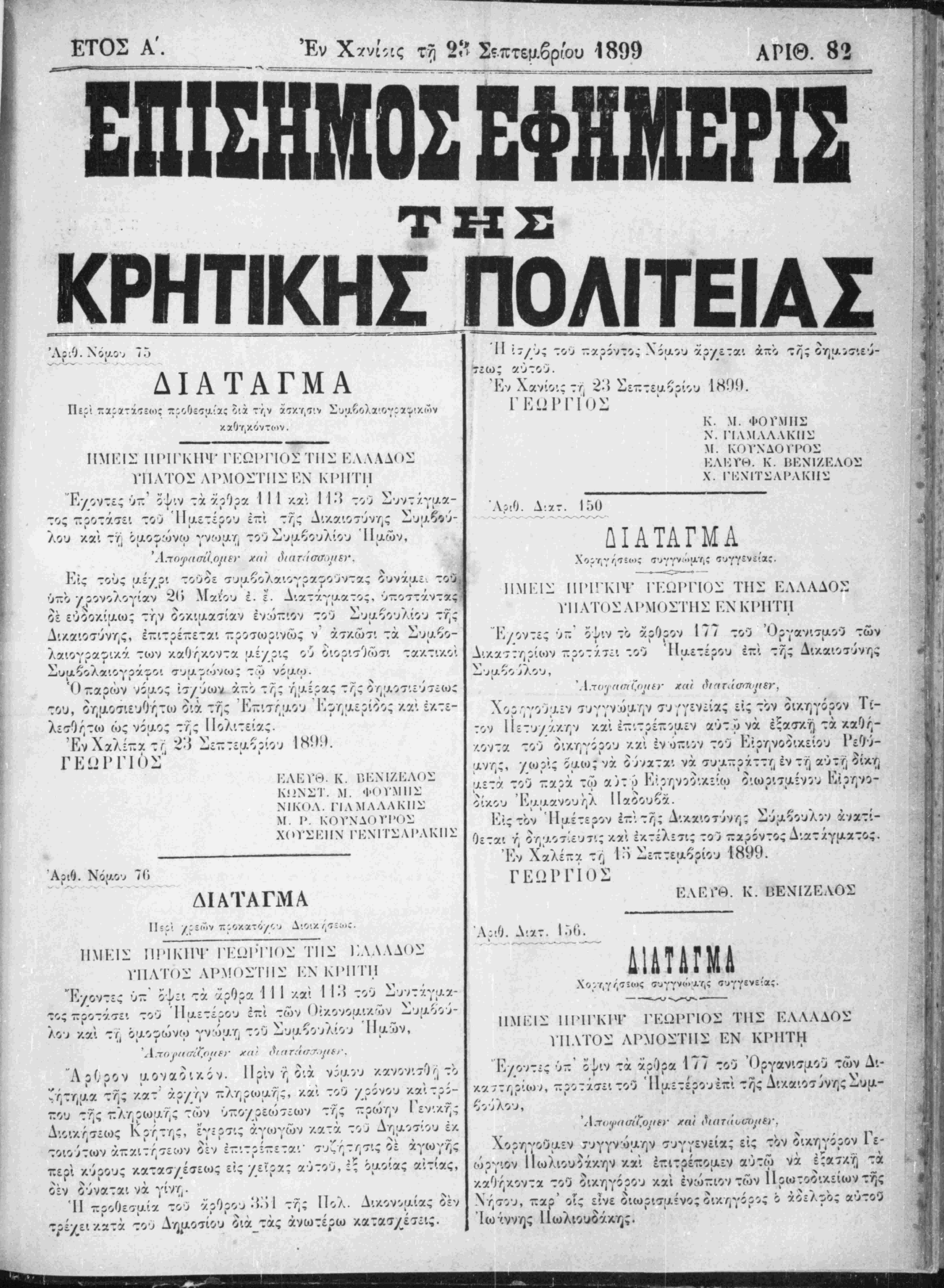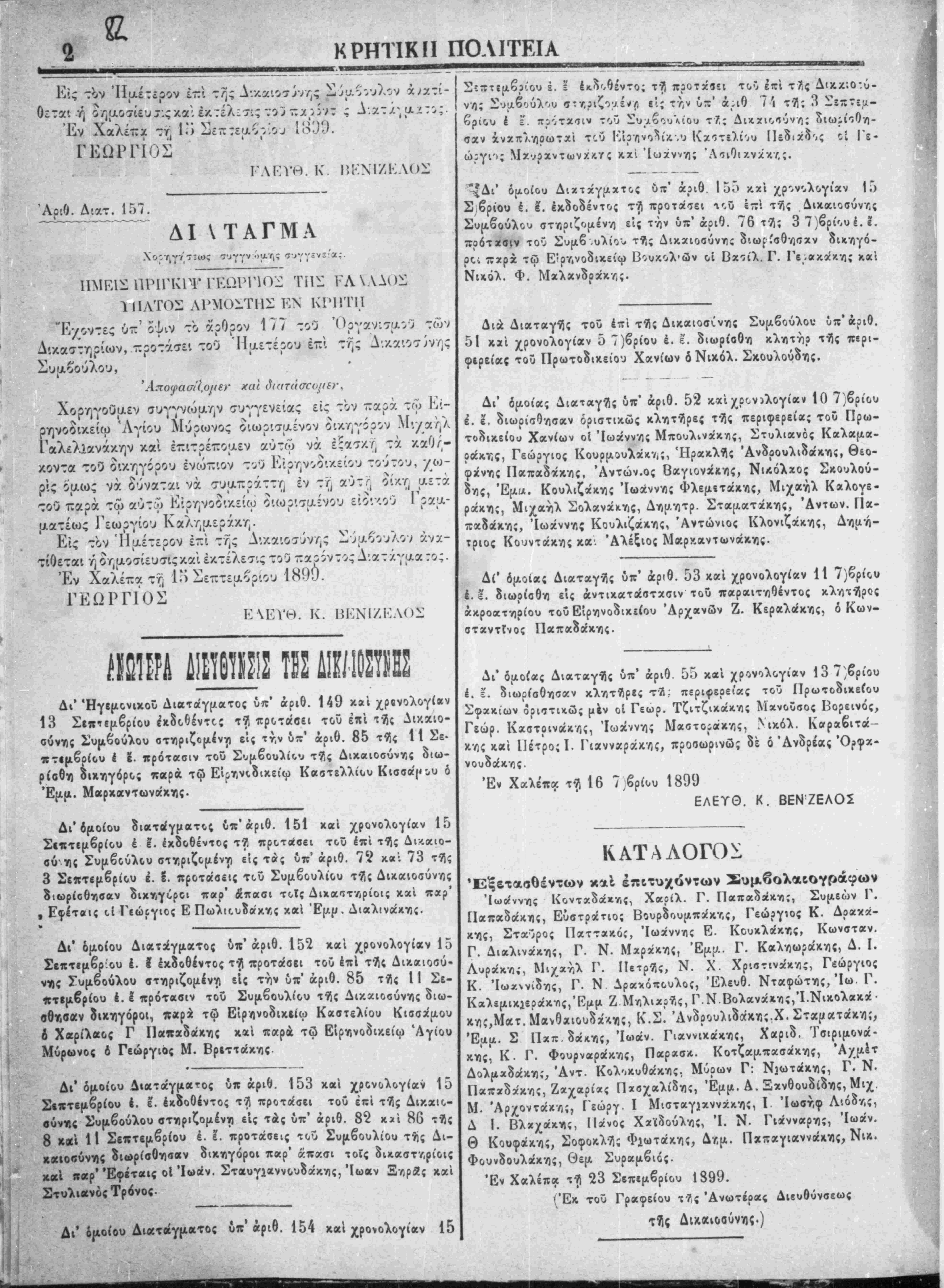 τού παρά τω αυτώ Είρηνοδικείω διωρισαένου είο*/<ου Ι'ραα- ματέως Γεωργίου Καλημ,ερίκη. Εις τον Ημέτερον έζί τ^ς Λικαιοσύν/;; Σύμβουλον άνα- τίθεται ή ο^μοσίευσιςκαΐ έκτέλετ.ς τού ζαοίντος Α·ατ/.γμα :ο:. Έν Χαλέτζα τυ] 1·ί Σετ:τεμοριου 1800. ΓΕΩΡΓΙΟΣ ΕΕΉ. Κ. ΗΚΝΙΖΚΛΟΐ: Δια Διαταγάς τού έτπ τίς Δικαιοσίνης Σύμβουλον ΰπ'άοιθ. 51 κ»Ί χρονολογίαν 5 7)βρίου έ. ε. διωρίσθη κλητηρ τίς πβρι- φιρείας τού Πρωτοδικείου Χανίων ό Νικόλ. Σκουλούδης, Δι* ομοίας Διαταγάς ύπ' αριθ. 52 καΐ χρονολογίαν 10 7]βρίου έ. 2. διωρίσθησαν οριστικώς κλητίρες τίς περιφερείας τού Πρω- τοδικείου Χανίων οί Ιωάννης Μπουλι,νακης, Στυλιανός Καλαμα- ράκης, Γεώργιος Κουρμουλάκης, Ήρακλίς Άνδρουλιδακης, θεο- φχνης Παπαδάκης, Άντών.ος Βαγιονάλης, ΝϊΛΟλχος Σκουλού¬ δης, Έμ/Α. Κουλιζάκης Ιωάννης Φλεμιτάκης, Μιχαήλ Καλογε- ράκη;Τ Μιχαήλ Σολανάκης, Δημήτρ. Σταματάκης, Άντων. Γΐα- Δι* Ήγ«(Λονΐχοϋ Διαταγματος ύπ' αριθ. 149 κ*1 χγ 13 Σιπγεμβρίου ίχδοθέντος τΤΙ προτασει τού επι τής Δικαιο- σύνγις Συιι,βού'λου οτιπριζοΐΑίνγ) εις την υπ1 αριθ. 85 τ95ς 11 Σε· πτΐμβρίου Ι Ι. πρότασιν τού Συμβουλιον τ^ς Διχαιοσύνης διω¬ ρίσθη δικηγόρο; παρά τψ Είρηνςδικείω Καστελλίυυ Κισσα'|«ου ό Έμμ. Μαρχαντωναχης. Δι* 6μο(ου ϊιατβίγματος ύπ'αριθ. 151 χαι χρονολογίαν 15 Σικτιμβρίου έ 2. έχδοθέντος τ*71 προτασει τού επι τΤ,ς Διν.αιο- σύ^τπς Σύμβουλον στηριζομένγ) εις τάς ύπ' αριθ. 7? καΐ 73 τίίς 3 Σίπτιμβρίου έ. Ε. προτασεις τού Συμβουλίου τ*71ς Δικαιοσύνης διωρίσθησαν Χικηγιΐροι η:»^ άπασι τοίς Διχαστηρίοις καΐ πχρ' 9 Εφίταις οί Γιώεγιος Ε ΠωλιουίακΥ/ς και Έμμ. Διαλιναχης. Δι* δμοίου Διατάγματος ύπ'αριθ. 152 χαι χρονολογίαν 15 Σιπτβμβρίου έ. ϊ έχίοθέντος τ^Ι προτάσει τού επί τΤίς Διχαιοσύ· νιις Συμβούλου στηριζομέντι είς την &-' αριθ. 85 τί|ς 11 Σε- πτΐμβρίου έ. 2 πρότασιν τού Συμβουλίου τίς Δικχιοσύνης διω- σθγ,σαν ίικηγόροι, παρχ τω Είρ/ινοδικιίω Καστελίου Κισσ^μου Α Χαρίλαος Γ Παπαδοέκης και παρά τώ Είρηνοδι/.είω Άγίου Μύρωνος ό Γεώργιος Μ. Βρΐττάκης. ♦ ~ «>—ε«—Μ~γ —ε ■ ε»Τ !■ π— ι ■