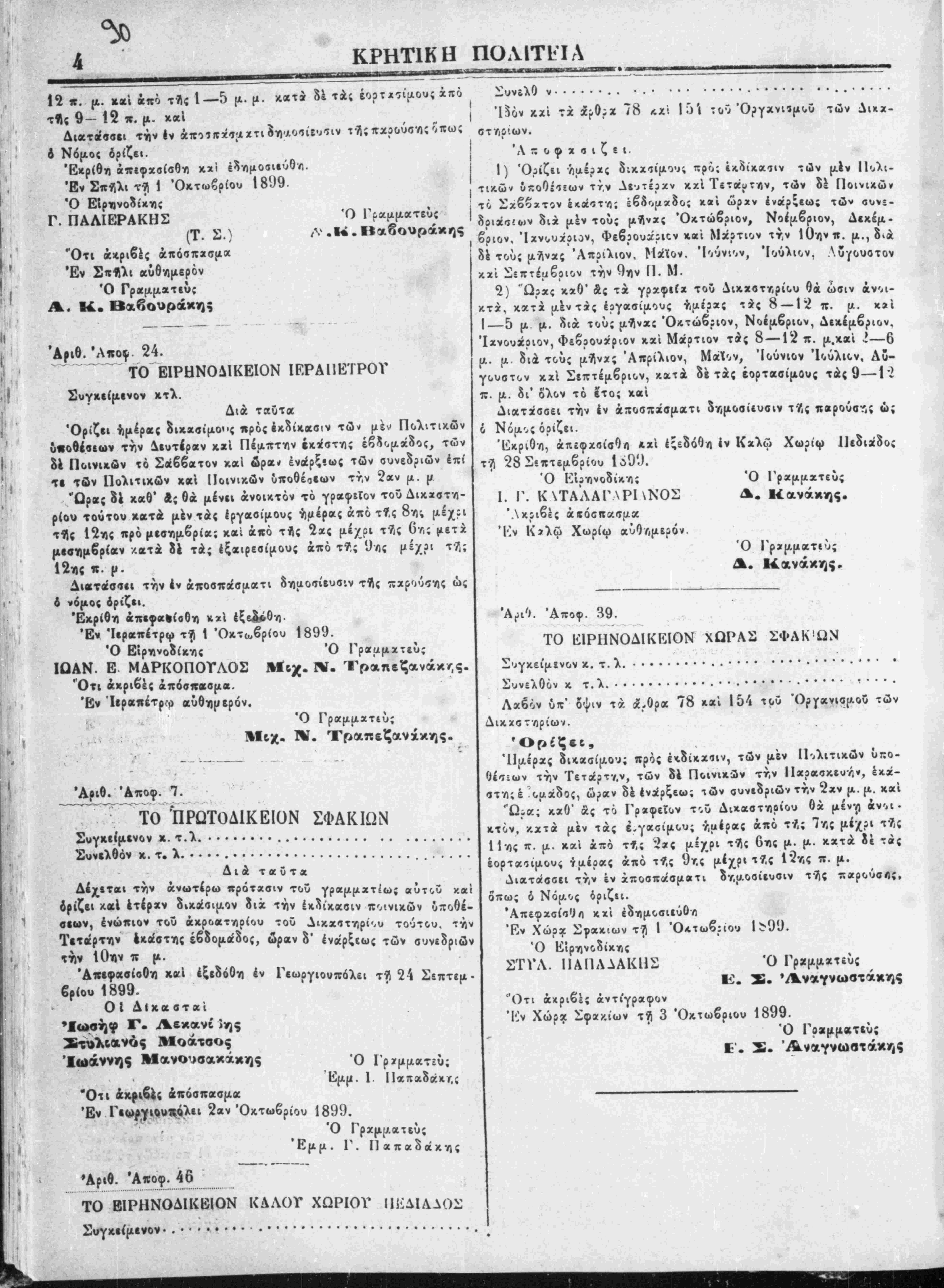 (Τ. Σ.) <ν.Κ *Ότι ακριβώς άπό^πχσμα Έν ΣπΙ,Αΐ αυθημερόν Ό Γραμματεύς Μ.· 'Βον καί τί χ^0:χ 78 κχν |;")ί τοϋ Όργχνιΐμ^υ των Διχχ- 'Λποφχβιζει. 1) Όρίζιι τιμέρχς δικχιίμου; ^ρο; ίκΗίκασιν των μέν Πολι¬ τικών ΰποΟέτξων ττ,ν Λίυτερχν κχι Τίτάυτην, των δ! Ποινικών το Σκββχτον βδ ^- 24. ΤΟ ΕΙΡΗΝΟΜΚΕΙΟΝ ΙΕΡΔΠΕΤΡΟν Συγκε£μ«νον κτλ. Διά ταυτα Όρίζει Υ,μίρας οΊ*ασίμο»»ς πρός έκδίκασιν των μέν Πολιτικών ύΐΐοθέσιων την λΐυτέραν κχΐ Πέμπτην 4κι£στης εβδομάδος, των οί Ποινικϋν τό Σάββατον κ α Ι ώραν ένάρζίως των συνεδριών επί ΤΙ Των Πολιτικών καί Ποινικών υποθέ^εων ττ,ν 2αν μ. μ "Ωρας δΐ καθ* 4ς θά μίνιι ανοικτόν τό γραφείον τού Δικχστη- ρ.ου τούτου κατά μέν τάς εργασίμους ημέρας άπό τίς 8η; (χεχρι τής 12ης πρό μεσημβρίας και άπό τής 2χς μέχοι τν^ς 6η; μετά μ<«ημβρ(αν χ.ατά ίέ τάς έξαιρεαίμους άπό τ*/,; 9ης μέ/ρι τή; Ιϊΐΐς «.μ. Δι«τάσσ«ι την έν άποοπάσματι δημοσίευσιν τής παρούσης ώς 6 νόμος ζ Εκρίθη ά-·φα«<οθη Έ« Ί·ρ««ίτρφ τ$ 1 Όκτωβρ(ου 1899. Ό Είρηνοίίκης Ό Γραμμχτευ; ΙΟΑΝ. Ε. ΜΑΡΚΟΠΟΤΛΟΣ Μιχ. IV. Τραη "Οτι άκριδές άπόσπαομα. Έν Ίιραπέτρ^ αυθημερόν. •V - Ό Γραμματεύ; καΐ Ι Αριθ. 'Αποφ. 7. ΤΟ ΐΐΡΩΤθΔΙΚΕΙϋΝ ΣΦΑΚΙΩΝ Συγκιίμινον χ. τ. α.............................. ΣυνΛβόν χ. τ· λ.------...................... .· - - Διάταυτα Δίχΐται την άνωτίρω πρότασιν τού γραμμζτΐω; αυτού καΐ 6ι}ίζ*ι χ*1 έτέρχν ο.κάσιμον δια την έκτασιν ποινικών δποβέ- σ*ων, ενώπιον τού άκροατηρίου τοθ Λικαστηρί',υ τούτου, την Τΐτάρτην έκοίστης εβδομάδος, ώραν δ* ενάρξεως των συνεδριών Ιθην π μ. χοτ.Ι εξεδόθη έν ΓεωργιΟν-όλει τ^ 24 Σεπτεμ. 1899. Ο Ι Δΐκα βται Μανουαα***^ Ό ρμμ Εμμ. 1. Ιΐατϊαδοέκ/,ς άπόσπασμα λΐ( 2ανΌκτωβρίου 1899. #Οτι Έν Γ .%- . Εμμ. Γ. Παπαδάκης . *Α*οφ. 46 ΤΟ ΒΙΡΗΝΟΔΙΚΒΙΟΝ ΚΑΛΟΤ ΧΩΡΙΟΓ ΙΙϋΔΙΑΛΟΣ ; εβδομάδος κ*ί ώραν ένάρζεω; των συνε- διά μέν τούς μήνας "Οκτώβριον. Νοέμβριον, Δεκέμ¬ βριον, Ίχνυυχριαν, Φεβρουάριον και Μάρτιον την ΙΟηνπ. μΜ δ*ά δέ τού; μΛνας Απρίλιον, Μάϊον, Ιούνιον, Ιούλιον, Αύγουστον κχϊ Σετττέμβοιον την 9ην II. Μ. 2) Ώρας κχθ' Λς τα γραφιίχ τού Λικχ^τηρίου θά ώσιν άνοι- κτχ, κατάμϊντας εργασίμους Ημέρας τας 8 —12 π. μ. κ*ι Ι—5 μ. μ. διά τού; μήνας Όκτώβριον, Νοέμβριον, Δεκέμβριον, Ίχνουάριον, Φεβρουάριον καΊ Μάρτιον τάς 8 —12 π. μ.καΐ 2—6 μ. μ. διά τού; μΤ,νχ; Απρίλιον, Μάϊον, Ιούνιον Ιούλιον, Αυ¬ γουστον κχι Σίπτέμβριον, κατά δέ τάς έορτασίμθυς τάς 9—1'2 π. μ. δι* όλον το 2το; καΐ Διατάσσει την έν άποσπχσματι δημοσίευσιν τ7,ς παρούσης ώ; 4 Νόμος όριζίΐ. Εκρίθη, άπεφχοίσθο ιχ εξεδόθη έν Κχλω Χωριψ Ιΐεδιάδος 28Σβ 19ί) Όϊ, Ι. Γ. ΚΤΑΛΑΓΡΙΝΟΣ Λκριϋές ανο 'Κν Κ>>ω Χωρίφ
