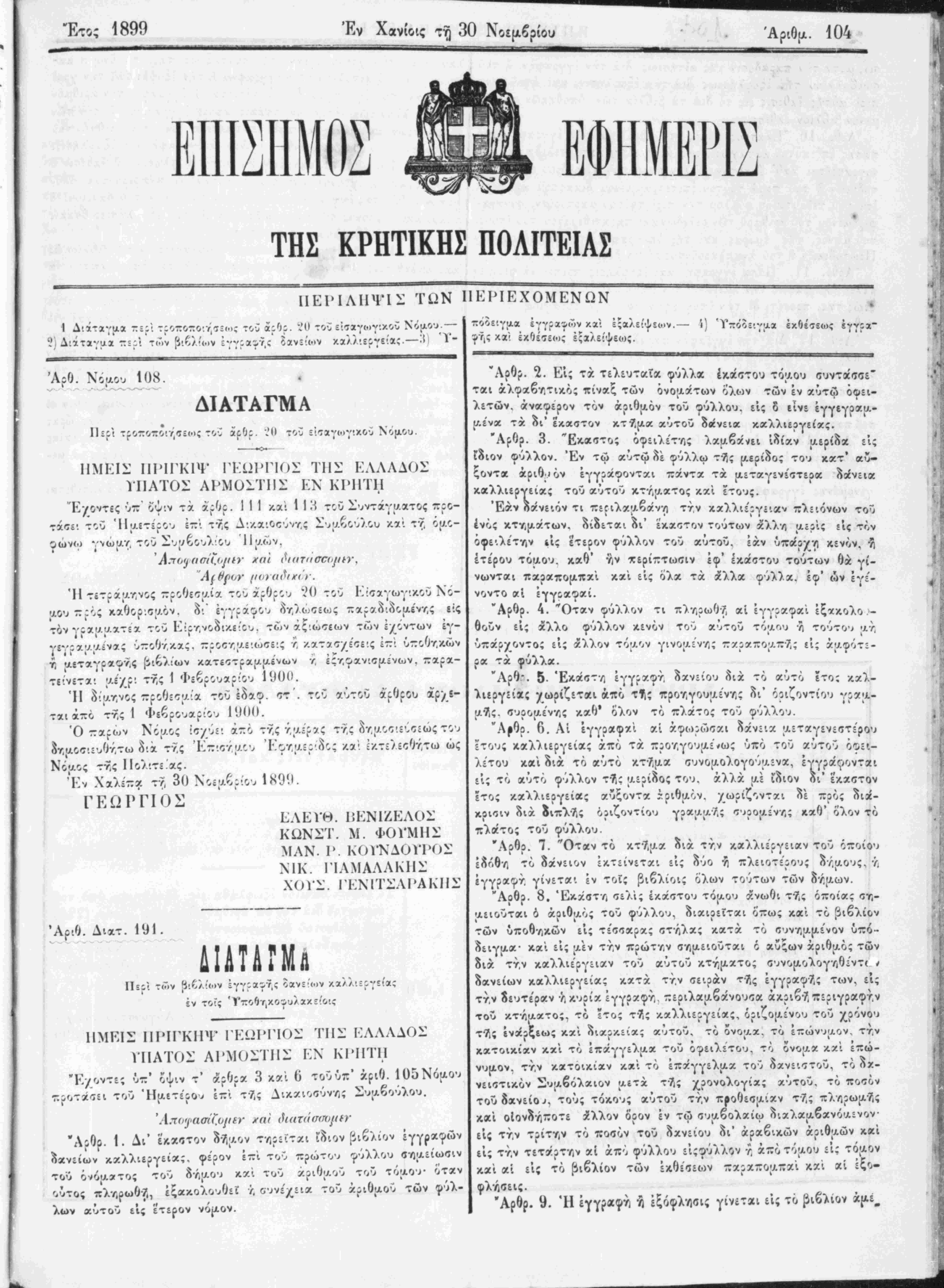 οτ,υ.ο«ι:υ')γ,τω διά τΫ,; Λτ.·Λ(.).',, ''.γί.<ι=:·&'.; ν.ι· Γ/.τί/ειΟΫ,τω ώς Νόαος -τΫ,ς ΙΙο/'.τί.χς. Έν Χ*λϊτ:? τυ, 31) Νο,α^ίου ΙΧΟ'.Ι. ΓΚΩΓΓΙΟΣ ΕΛΕ1Ή. ΙϊΕΝΙΖΕΛΟΣ ΚΩΝΣΤ. Μ. ΨΟΙ'ΜΗΣ ΜΛΝ. V. ΚΟΥΝΔΟΥΡΟΣ ΝΙΚ. ΠΛΜΛΛΛΚ1ΙΣ ΧΟΓΣ. ΓΚΜΤΣΛΙΆΚΉΣ κ,αλλιεργείχ; τού αυτού κ,τγ,|Λατος αχ ετους. Εάν Λχνειόν τι ιτεΓΐ'λααβανη τγ,ν ζζ).λι=:γ··.αν ττλί'όνων τού ενός κτχ|ΐ.άτων. ϋίδ&ται ^ι* 'εκχ'ΐτον τούτων άλλτι αερις «ις τον όφε·.Αεττιν ·ι; έτερον φύλλον τού κΰτου, εάν ΰ-αρχγ) κενόν, -^ έτε'ρου τόαου. κ,αθ' ΐν χέρίπτωσιν ίφ1 εκάστου τούτων Οά γί¬ νωνται ΊταραπομπχΙ κζΐ είς ολχ τα ίλλα φύ»κ. έφ' ών ενε- νοντο αί εγγιαφαί. "Αρθρ. 4. *Οταν φύλλον τι ->τ,ρωθ·71 αί εγγραφαί έζακολο .-